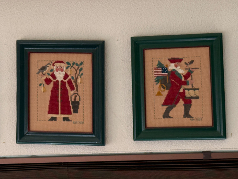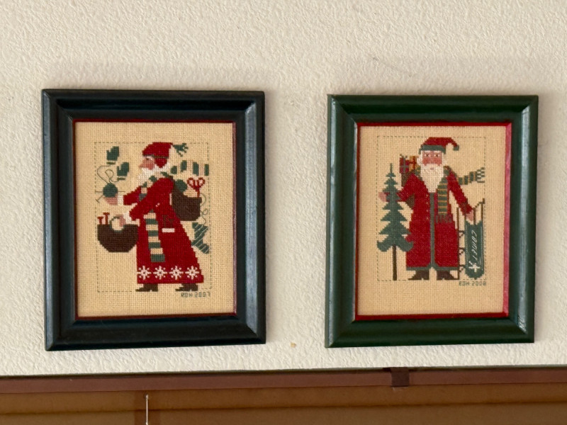 (12) Needlepoint Santas With Red and Green Frames 9x8” each