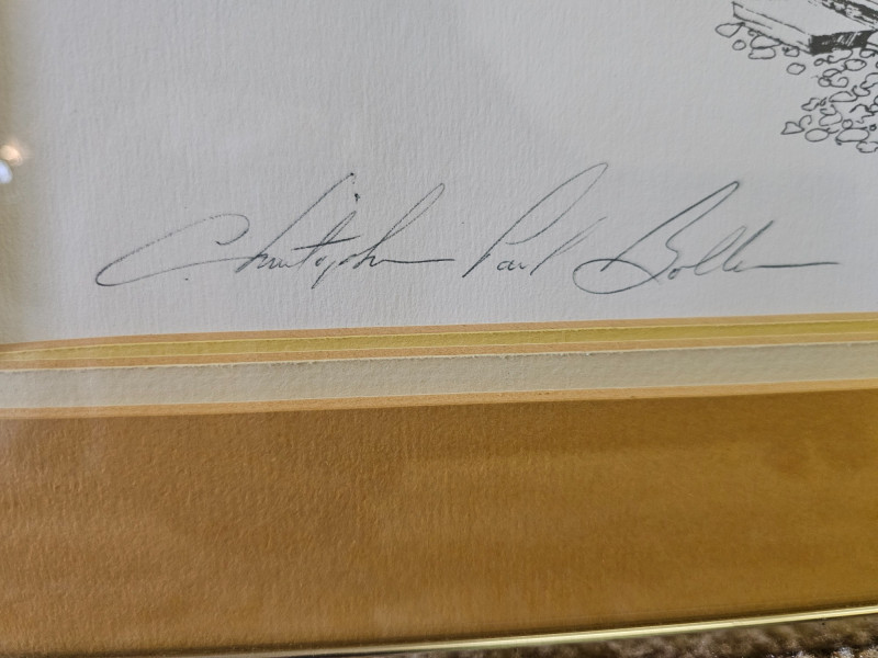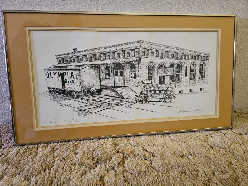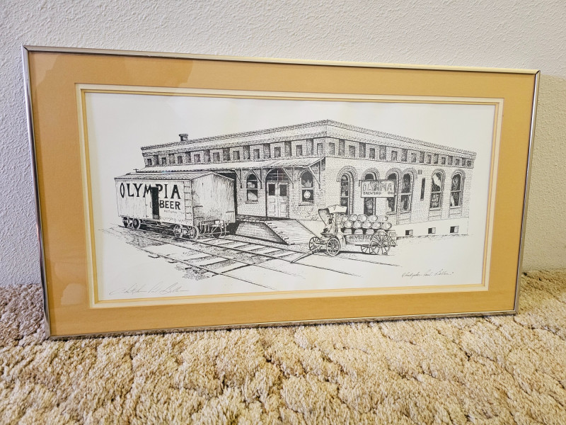 Signed Print Of The Olympia Brewing Company by Christopher Paul Bollen Local print depicting the historic Olympia Brewing Company brewhouse building in Tumwater, Washington. Hand-signed by the artist Professionally matted and framed under glass in gold metal 15"T x 28"W