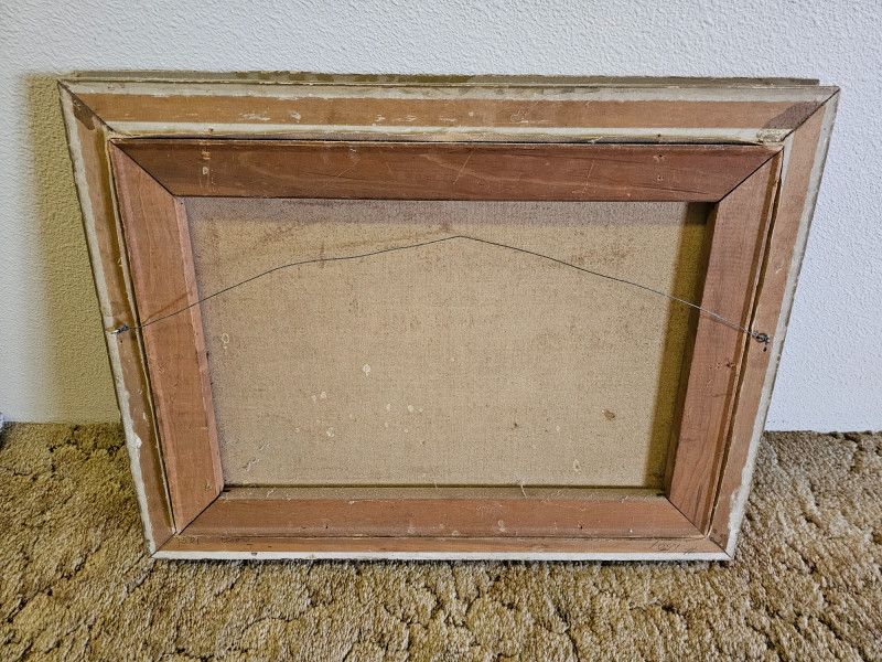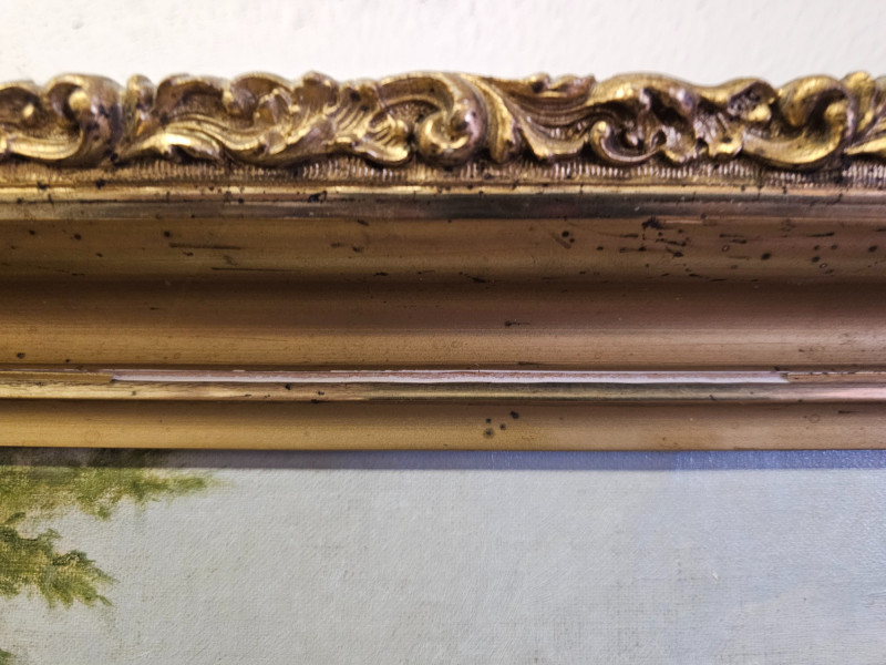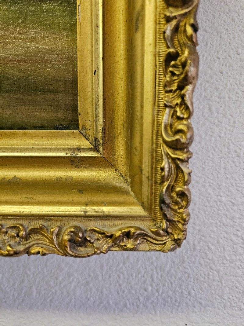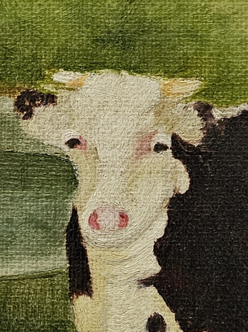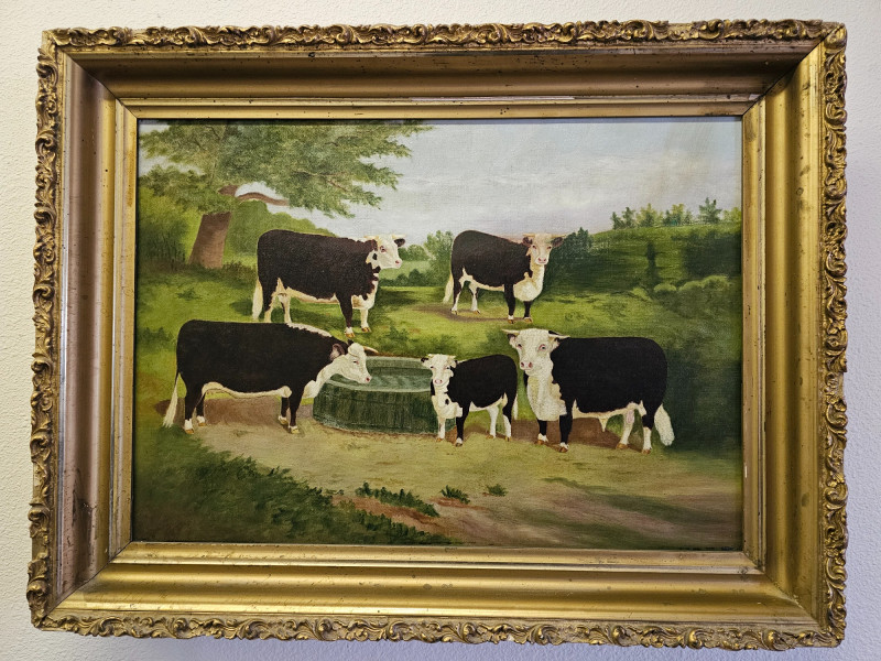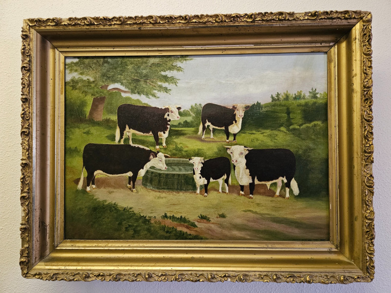 Early 20th-Century Oil Painting Of Holstein Friesian Cows In A Field Beautiful gilded framed oil on canvas painting One chip on upper frame (see pics for condition) 19"T x 25"W
