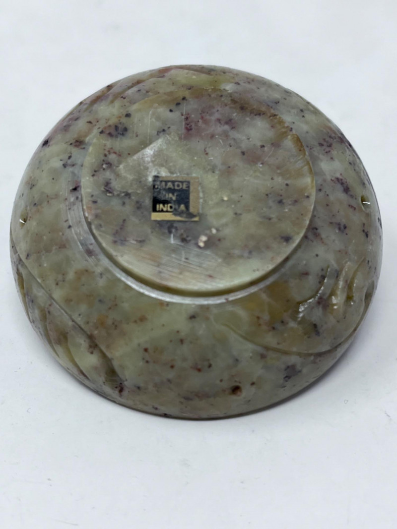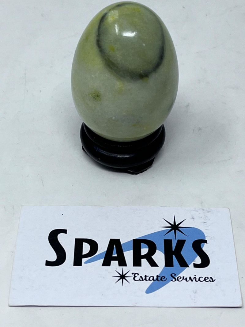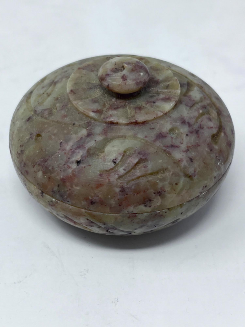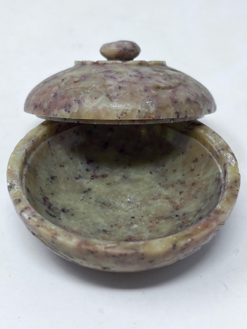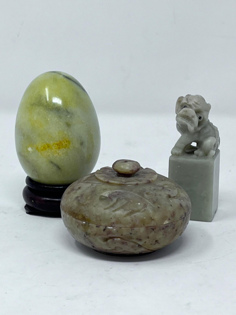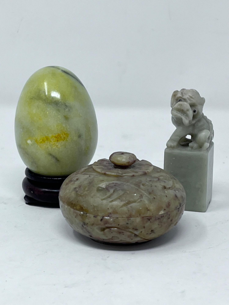 Small Stone Figurines Late 20th century soapstone foo dog Mid 20th century Italian polished marble egg 19th century decorative stone bowl with a lid All in good condition
