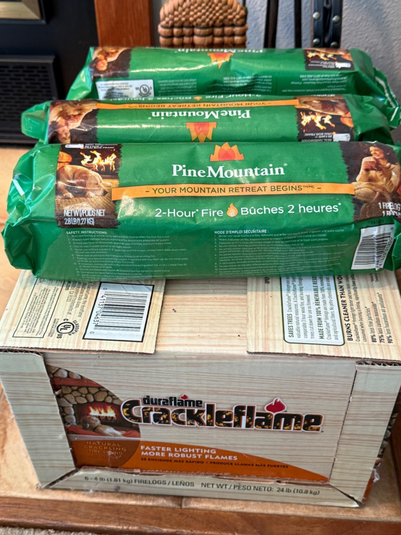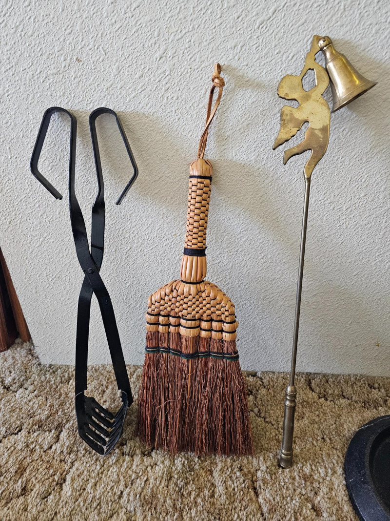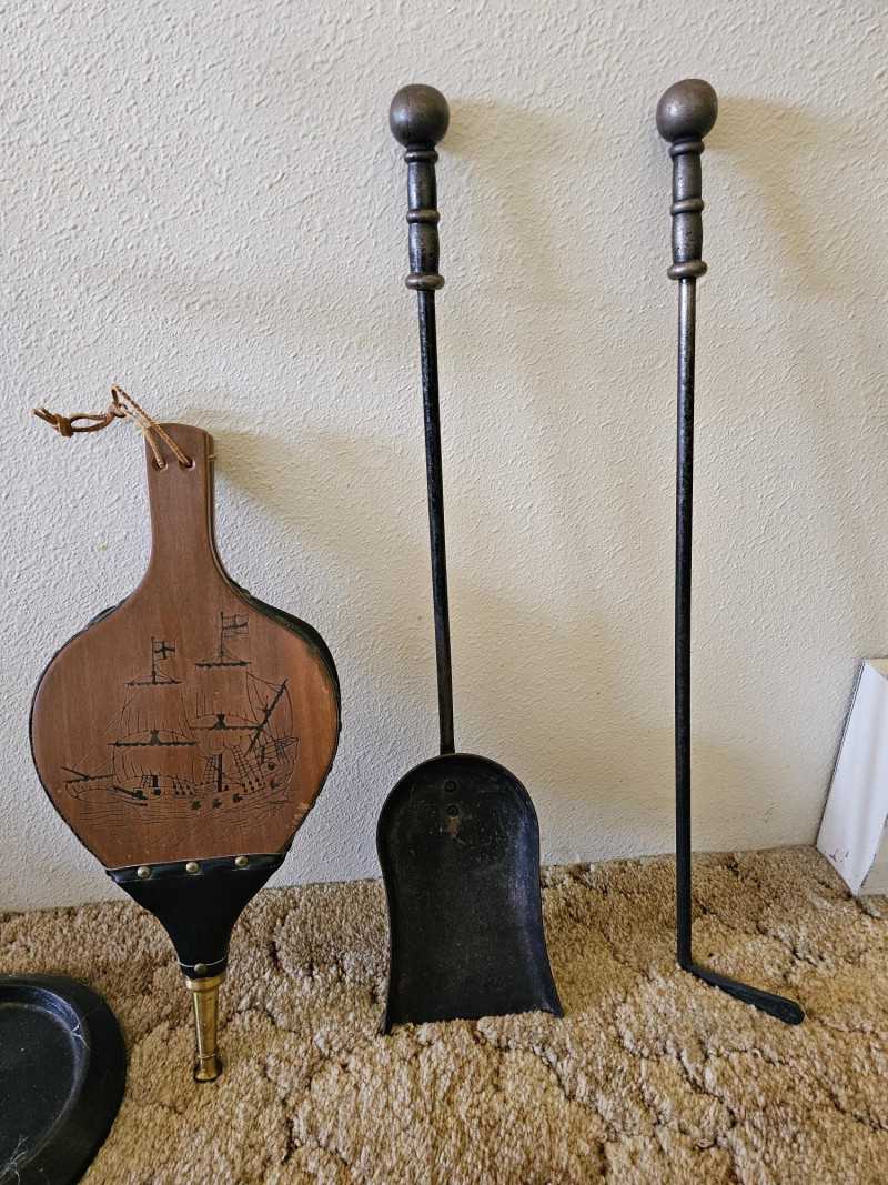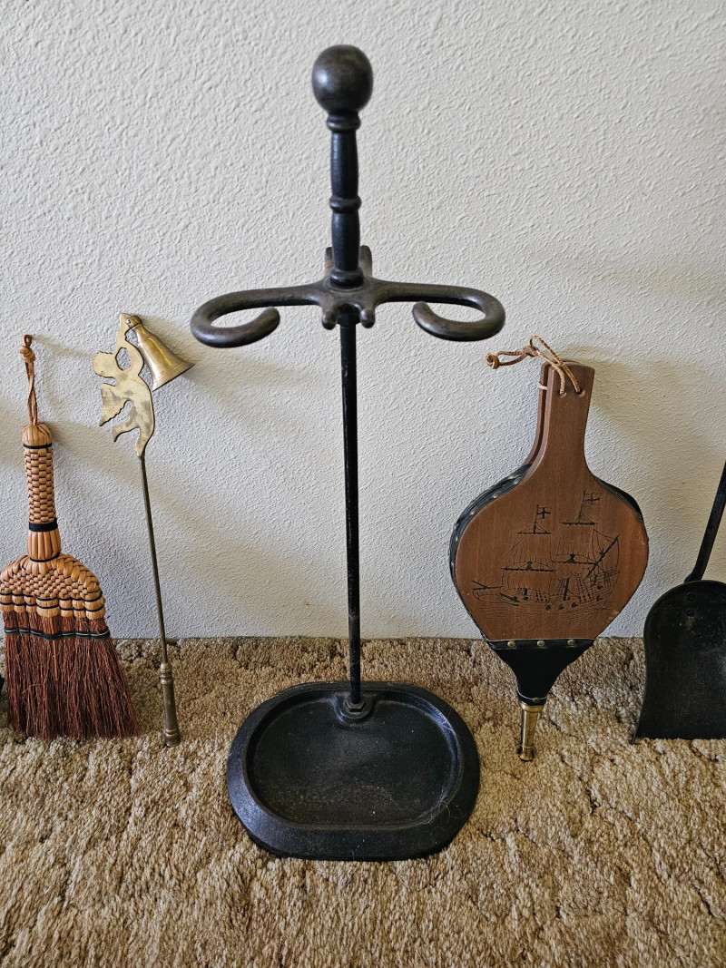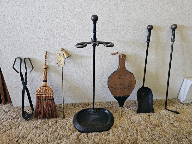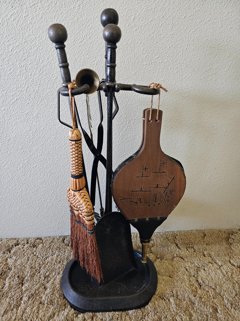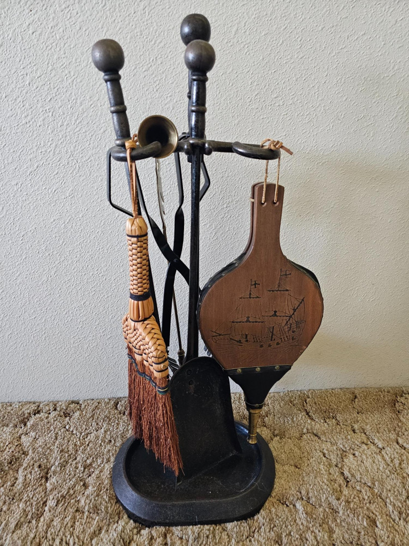 Vintage Fireplace Tools Set & 9 pressed logs Bellows, broom, tongs, angel candle snuffer, ash shovel & poker on an iron stand Stand is 24"T x 10.5"W x 7"D