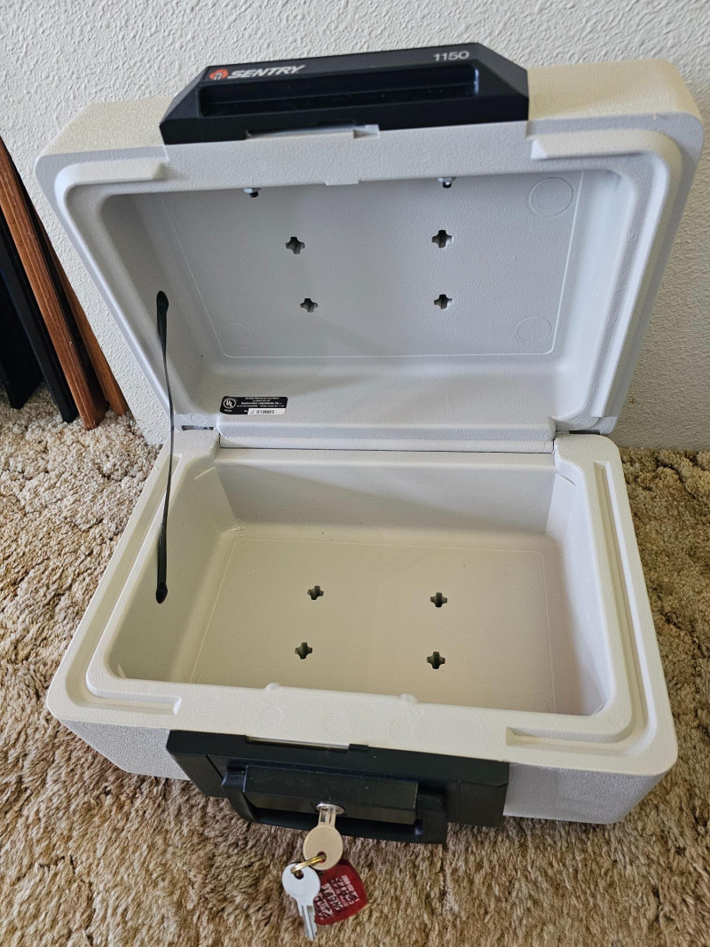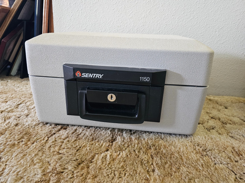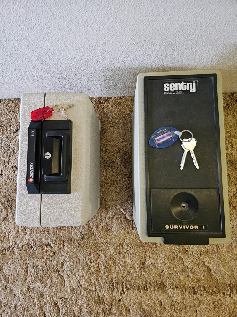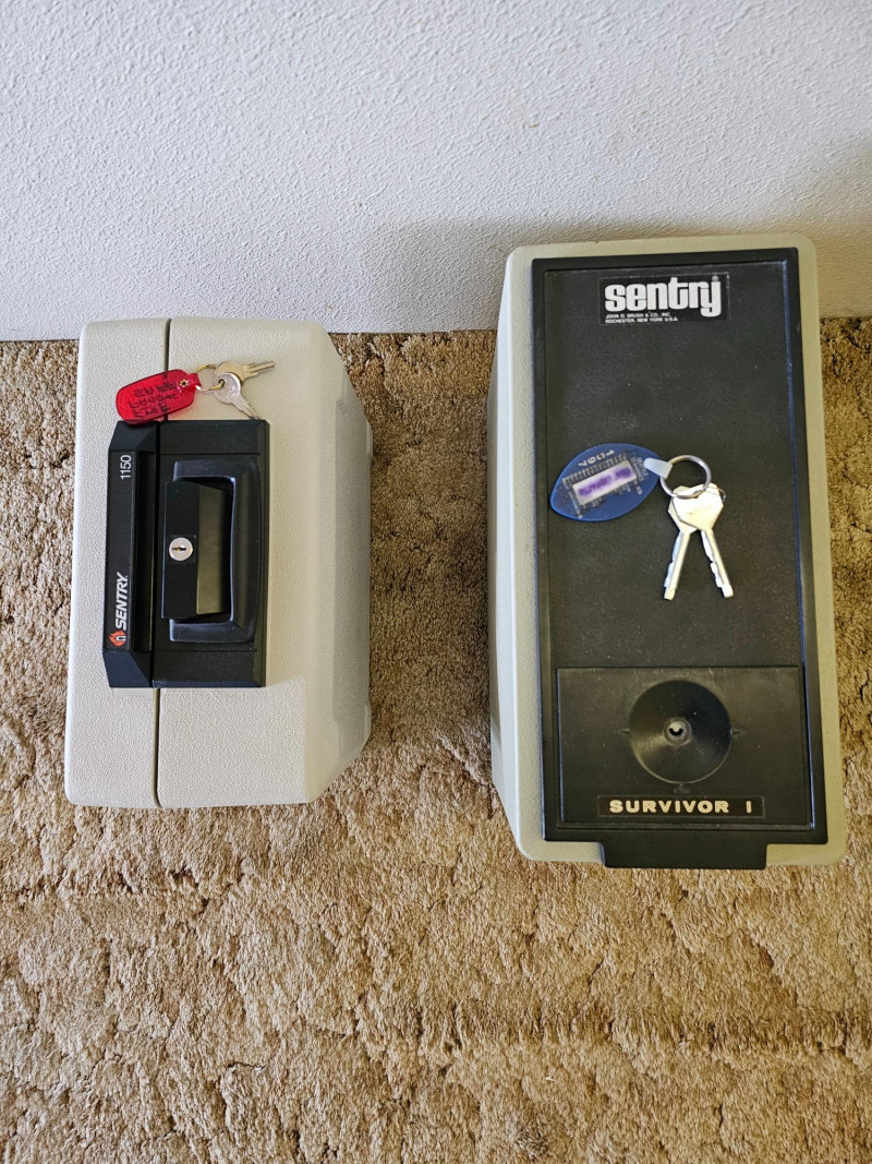 (2) Sentry Personal Firesafes Sentry Survivor 1 Personal Firesafe (topload) 13.5"T x 15.5W x 8"D Sentry 1150 Personal Firesafe (topload with handle) 8"T x 14"W x 9.5"D Both include 2 keys and locks work