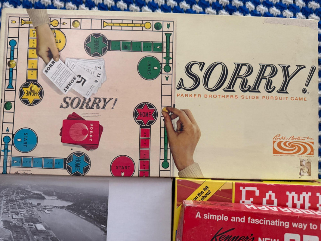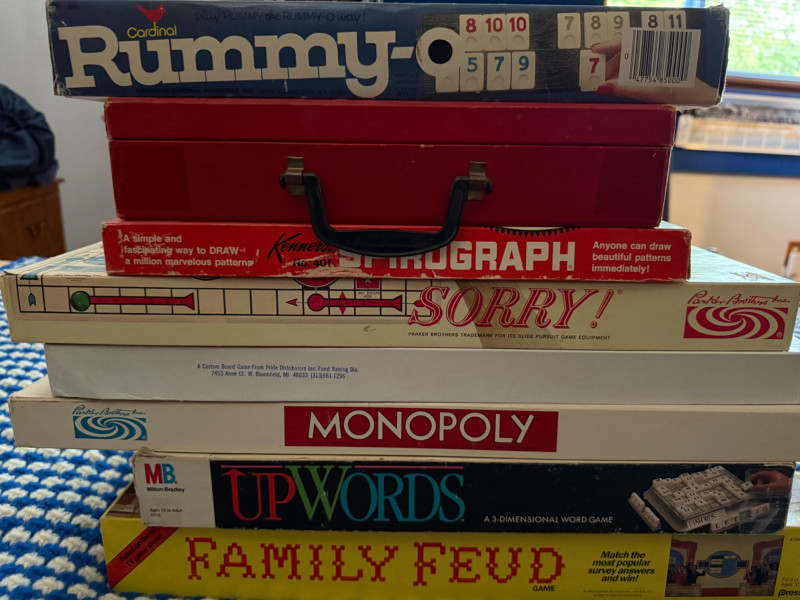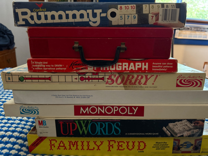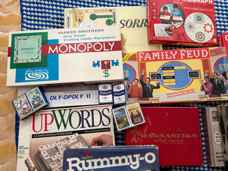 Throwback Game Night!Monolpoly Oly-Opoly Spirograph Rummy-O Up Words Family Feud 5 decks of playing cards Sorry Magnastiks building magnets