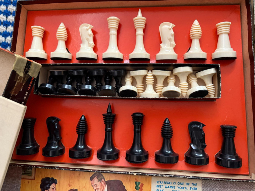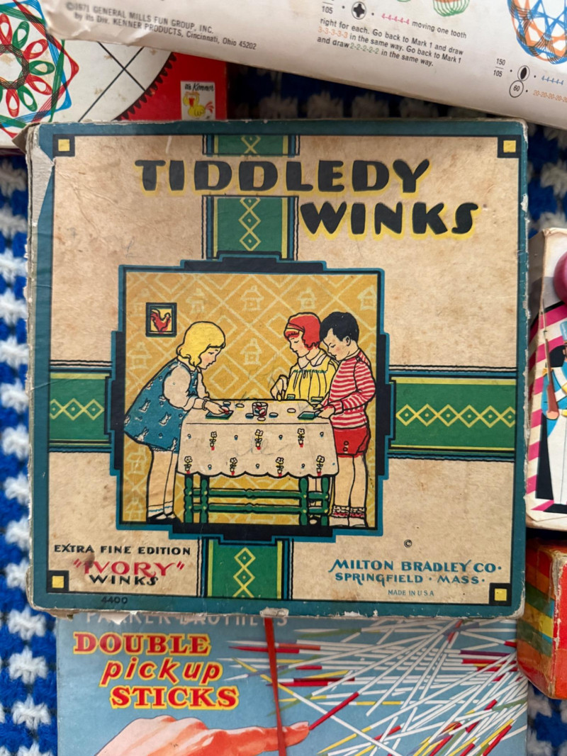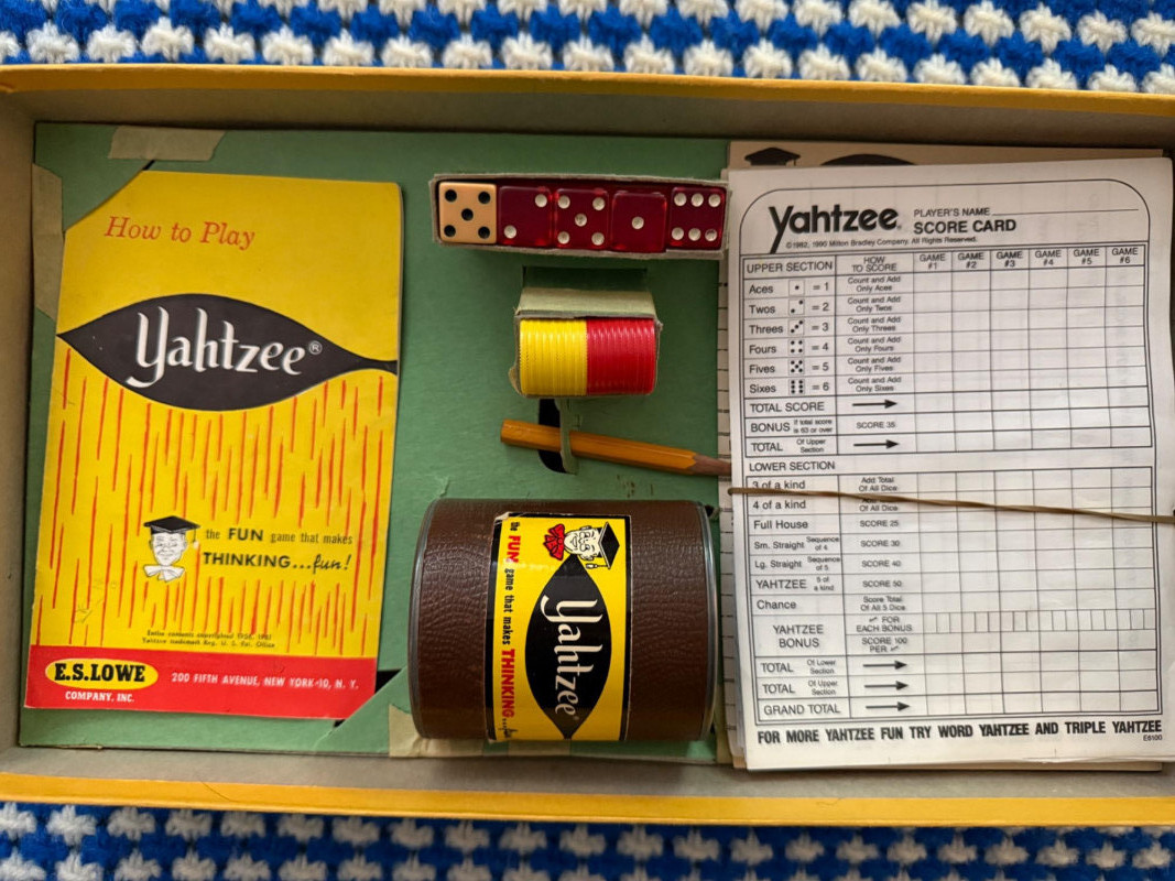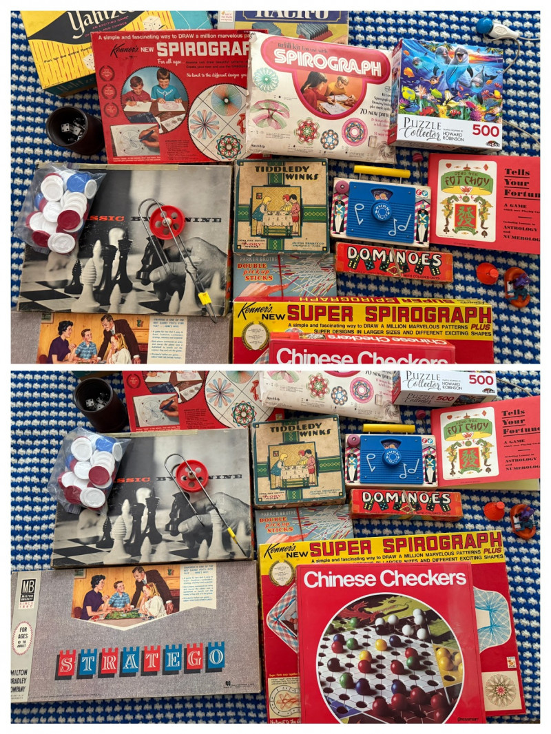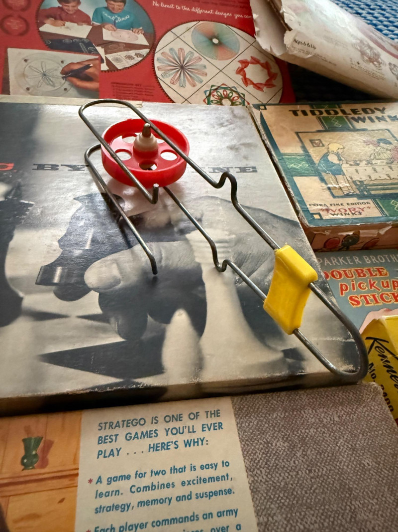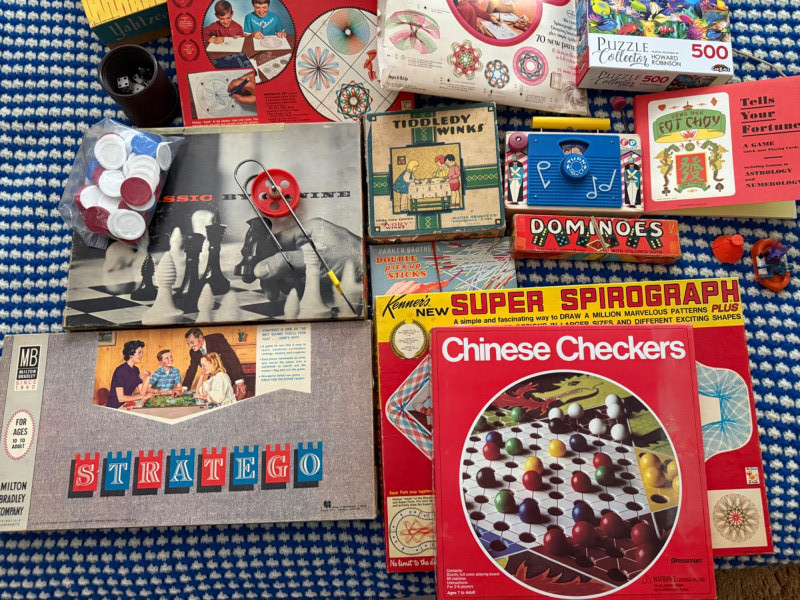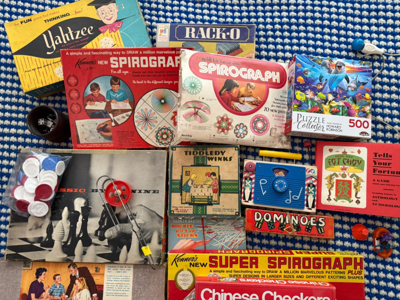 Stratego Chinese Checkers Dominoes Double pick up sticks Tiddle Winks Yahtzee Spirographs Chess and Checkers Fot Choy Kinetic wand Cup of dice including 2 round die Rack-o 500 piece puzzle and Fisher Price wind up music box radio