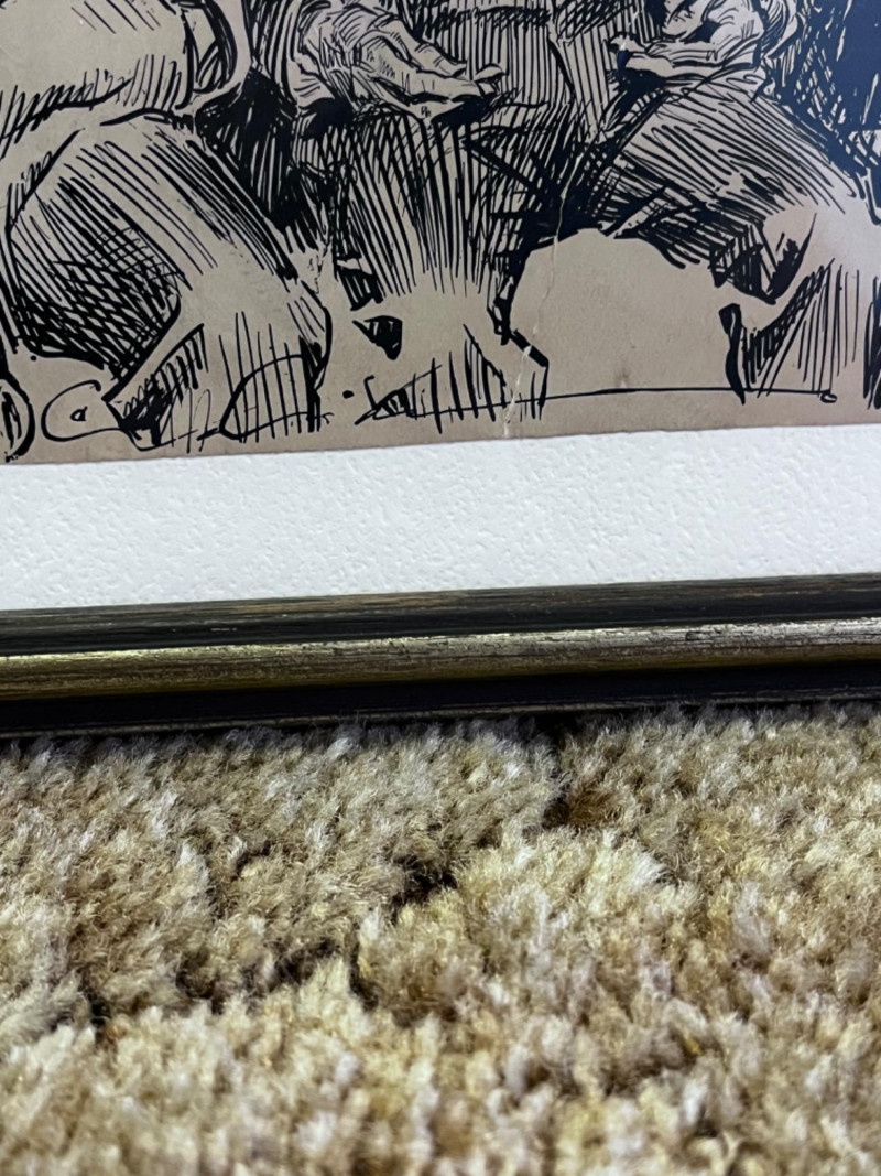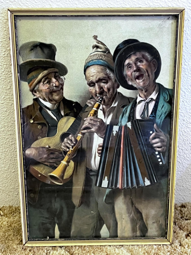 Three Pictures of Three Men Three musicians print under glass with wood frame 13.5”Lx9”W Two prints of “Two Strikes and the Bases are Full” by Charles Dana Gibson, originally published early 20th century have been cut from original print. Both prints are under glass and frames are painted gold wood 9”Lx11”W