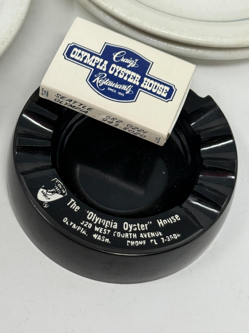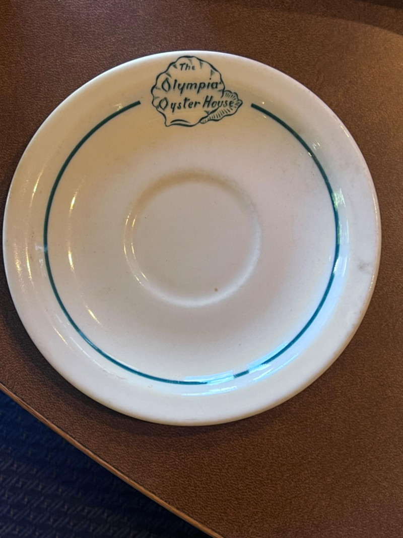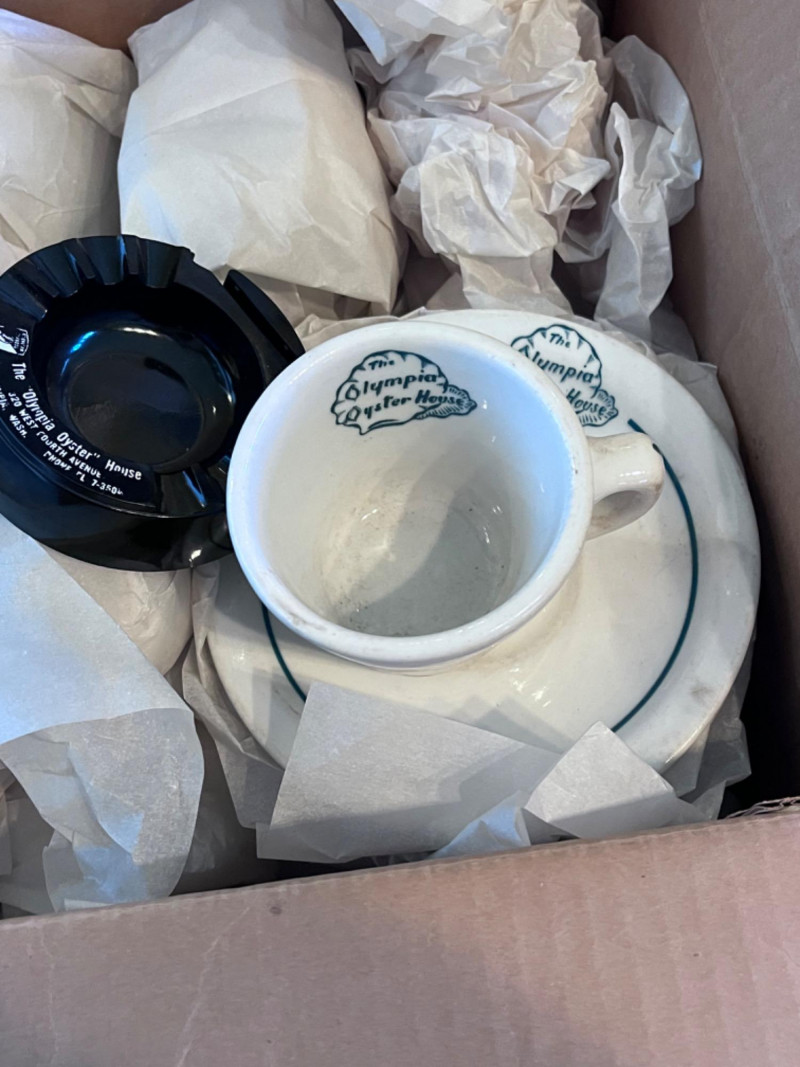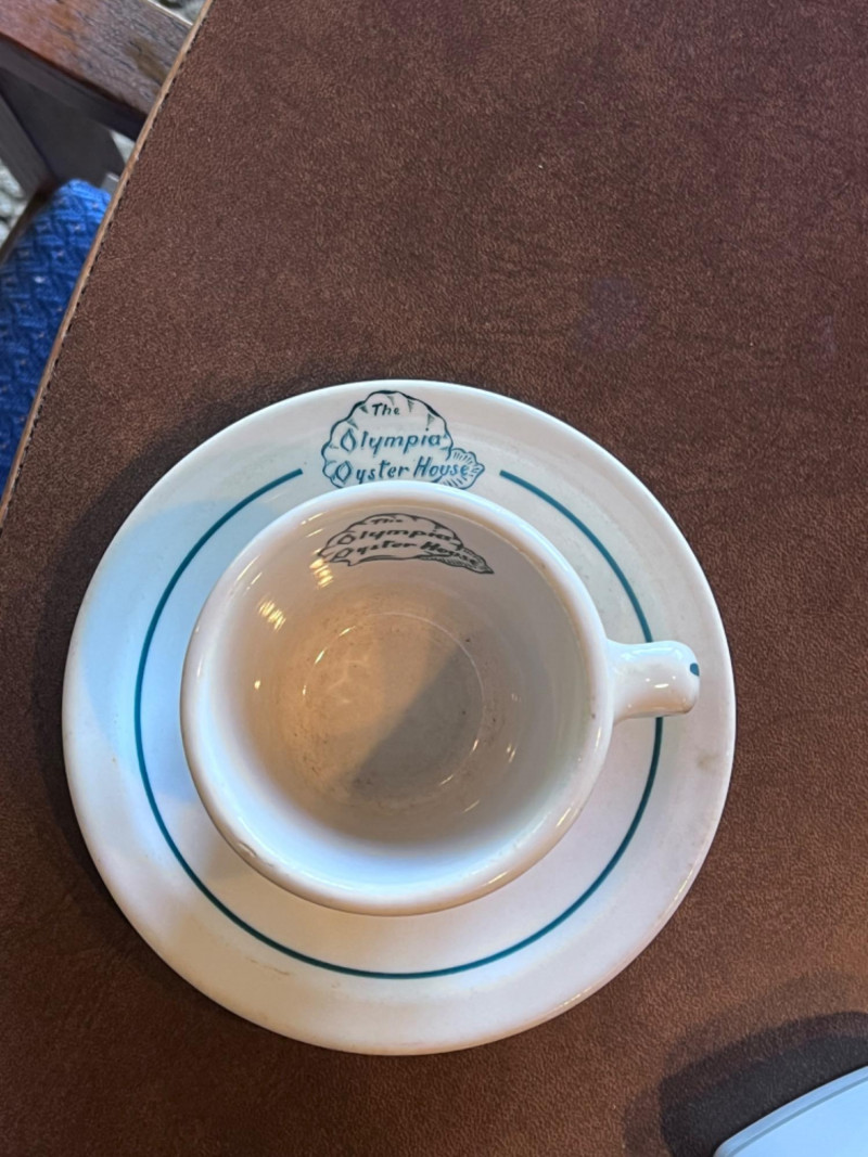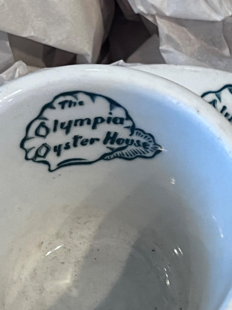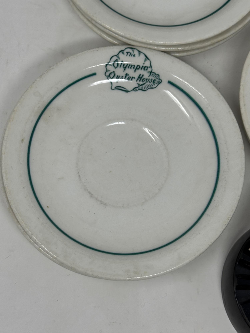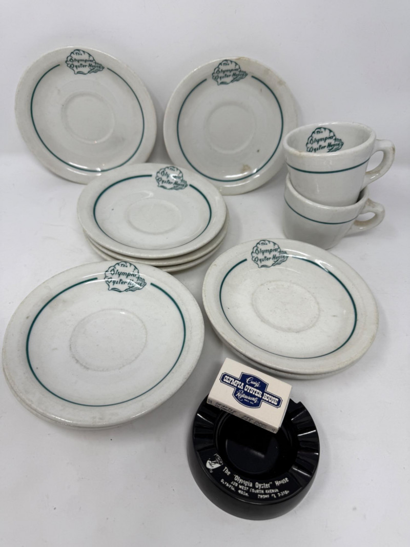 25 Piece Set Original Olympia Oyster House Cup and Saucers 14 cups and 11 saucers Vintage acrylic The "Olympia Oyster" House ashtray 3.5”