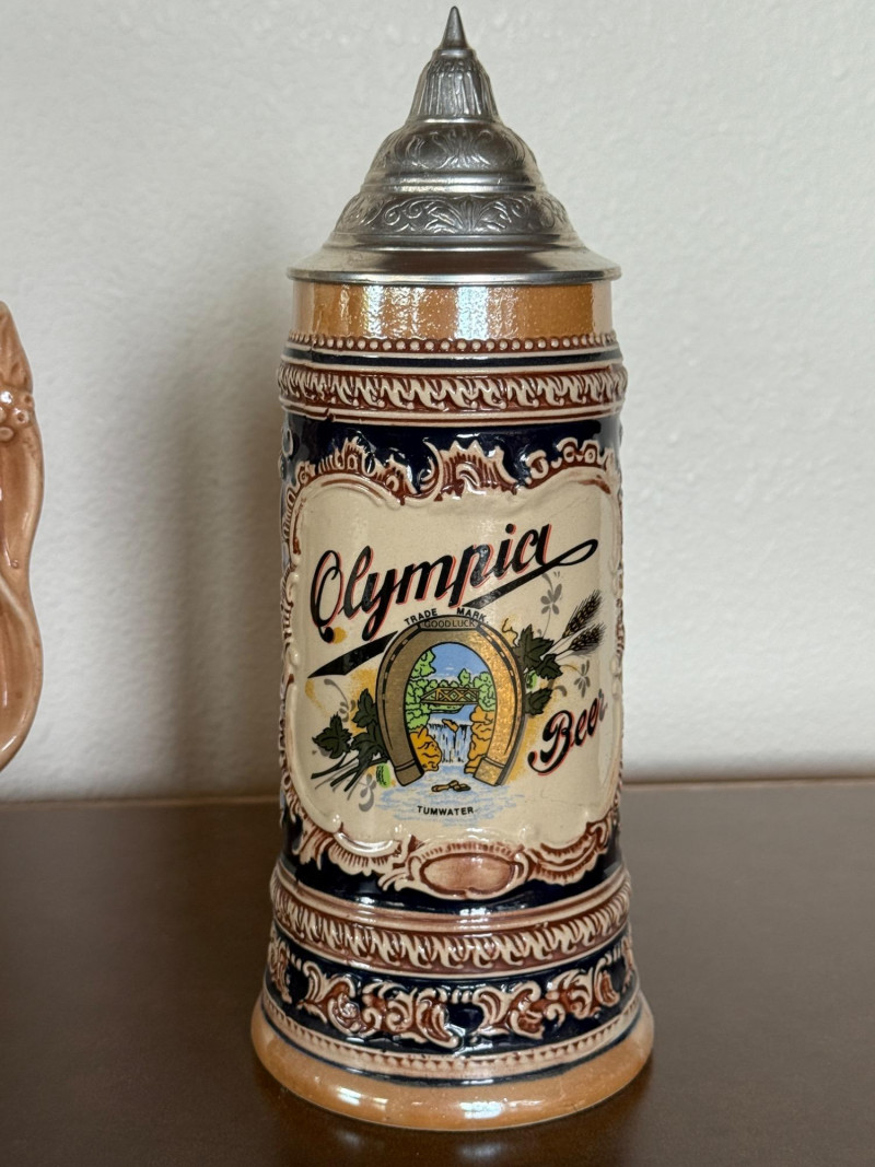 Olympia Beer - German & Musical Steins - Oktoberfest Ready! Musical Stein (music box works) 8x5.5” Oly beer 10.25x6”