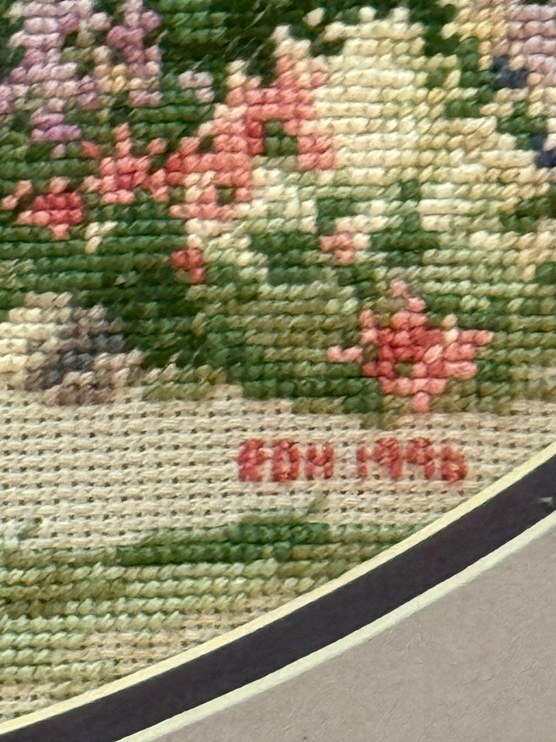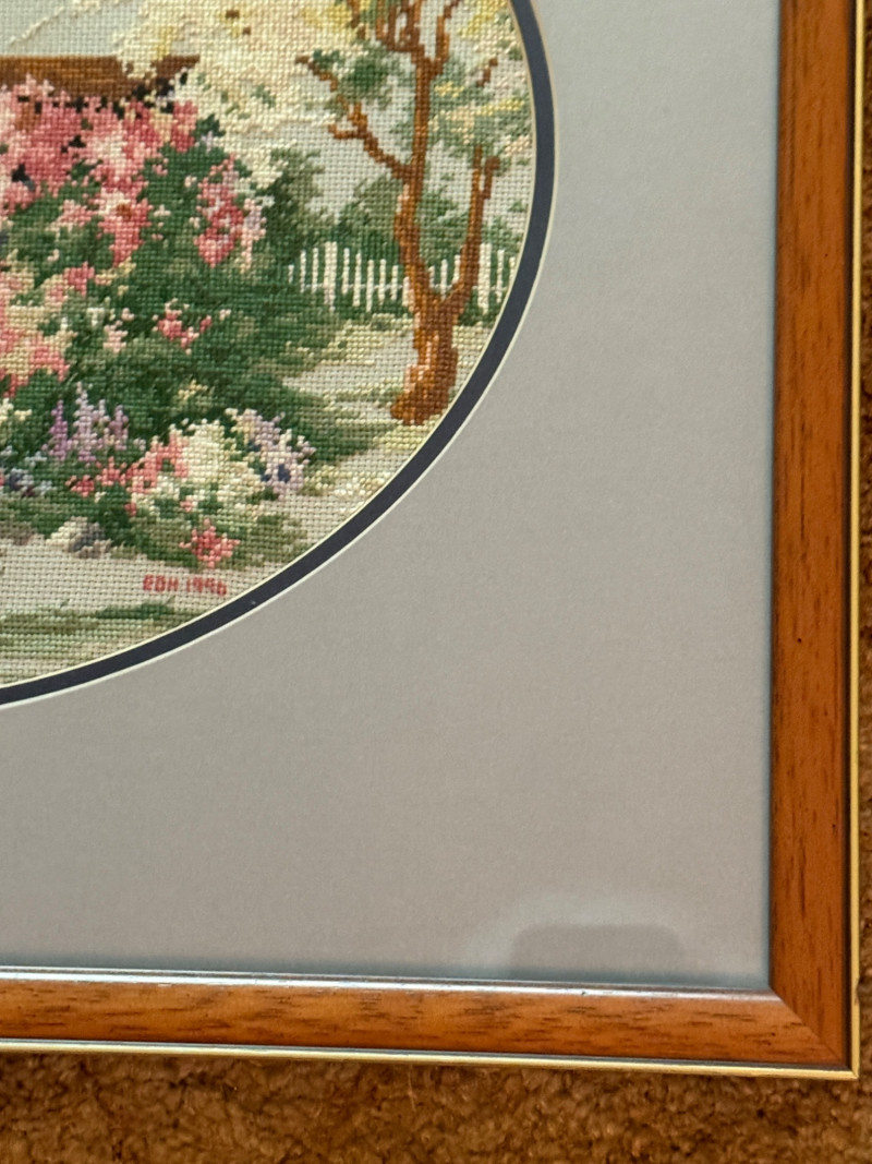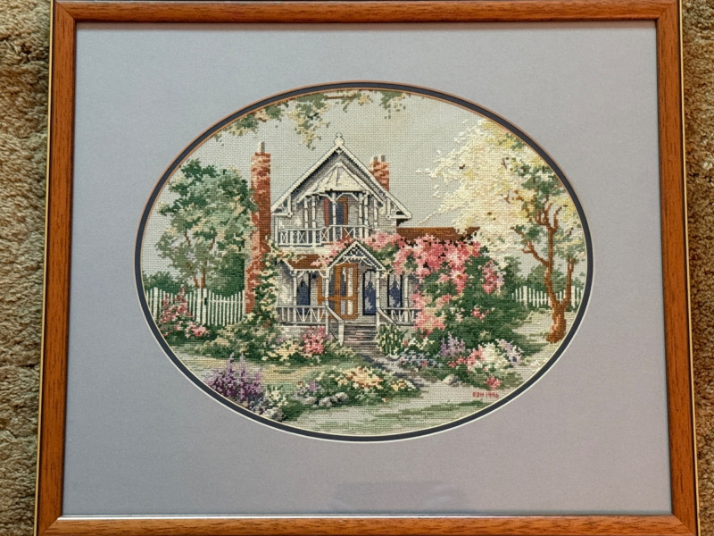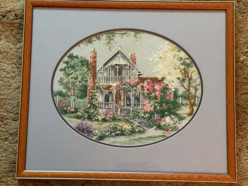 Victorian House Framed Needlepoint Double matted under UV protected glass in a natural and black wood frame with gold edge. Measures 20x17”