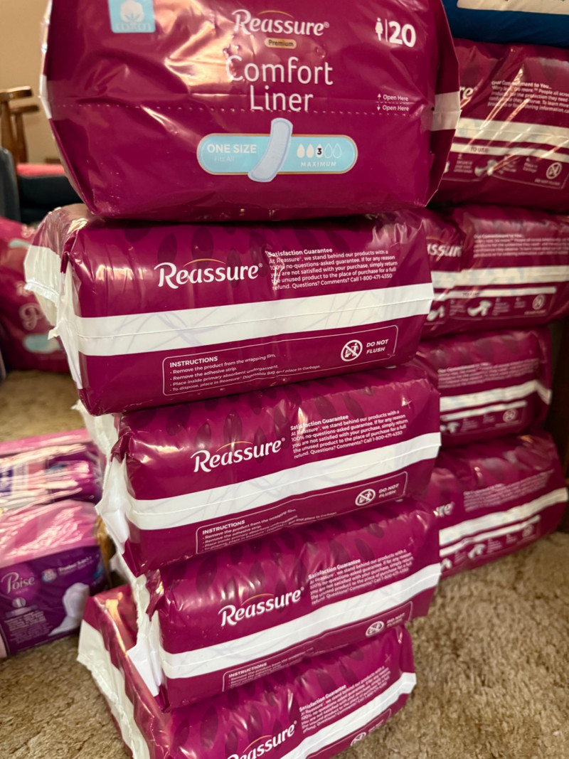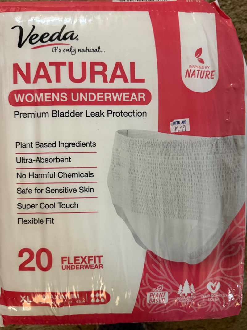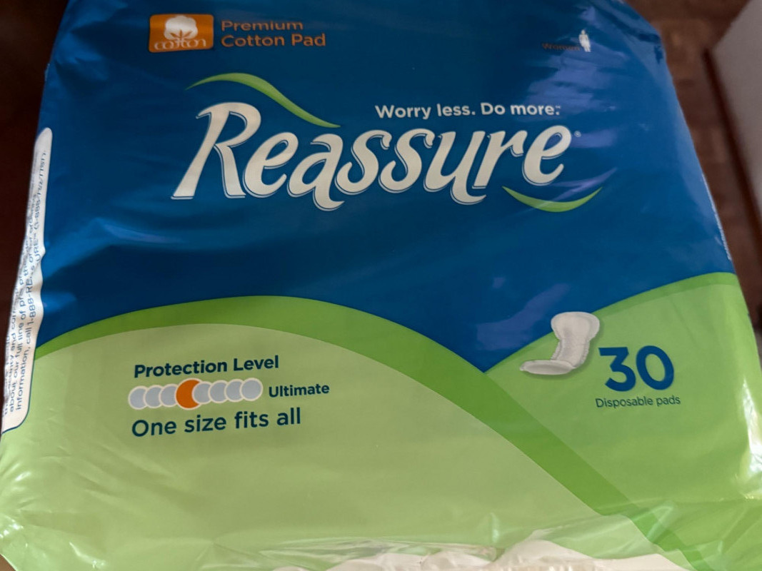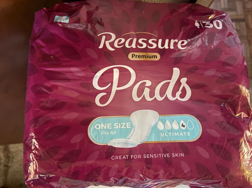 Disposable Undergarments & Pads 2- Reassure 30 pk pads 1- Veeda XL Womens 20pk underwear 1- Poise 33 pk pads & Partial pack 1- Attends Lg 18 pk 5- Reassure Comfort Liner one size 20 pk 6- Reassure pads 30 pk