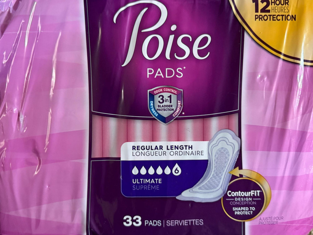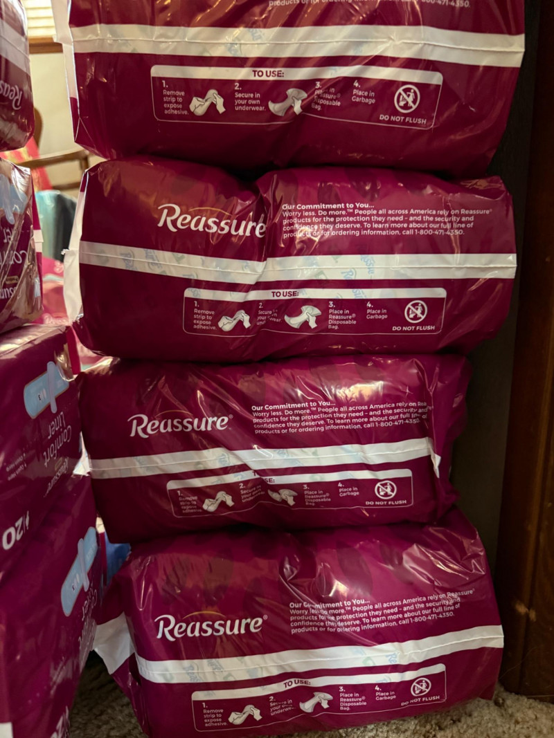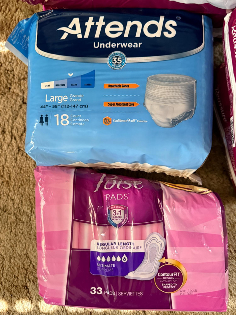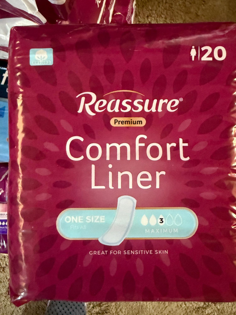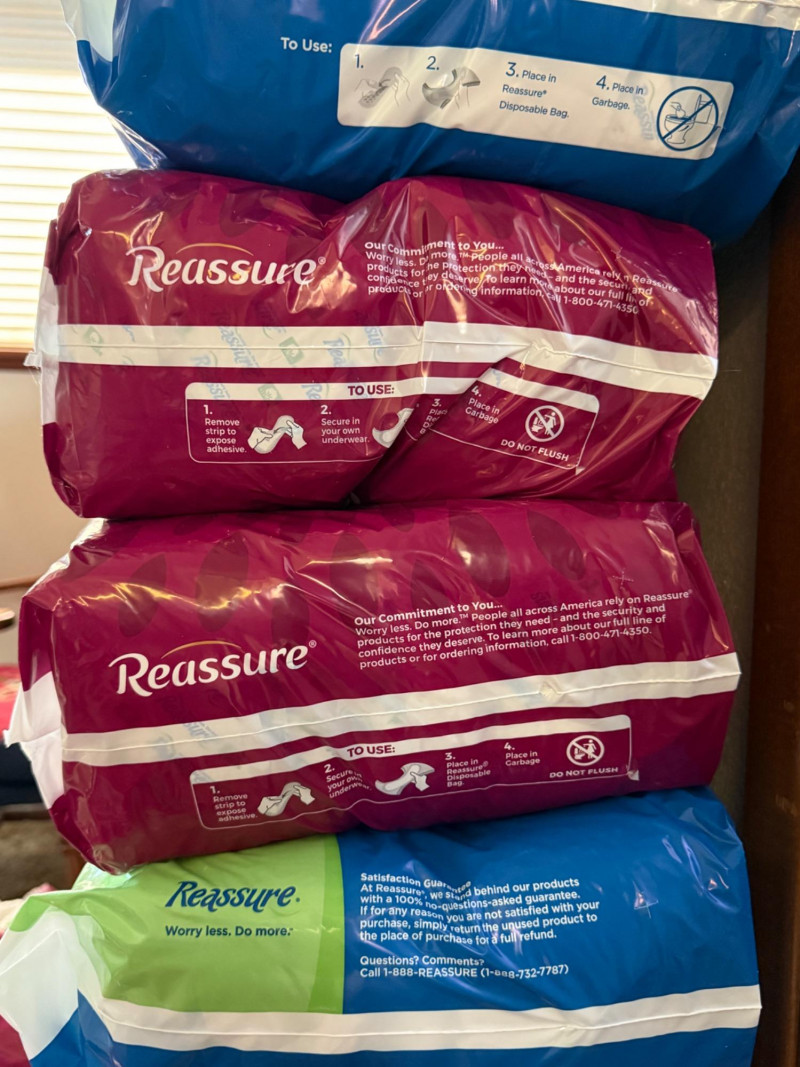 Disposable Undergarments & Pads 2- Reassure 30 pk pads 1- Veeda XL Womens 20pk underwear 1- Poise 33 pk pads & Partial pack 1- Attends Lg 18 pk 5- Reassure Comfort Liner one size 20 pk 6- Reassure pads 30 pk