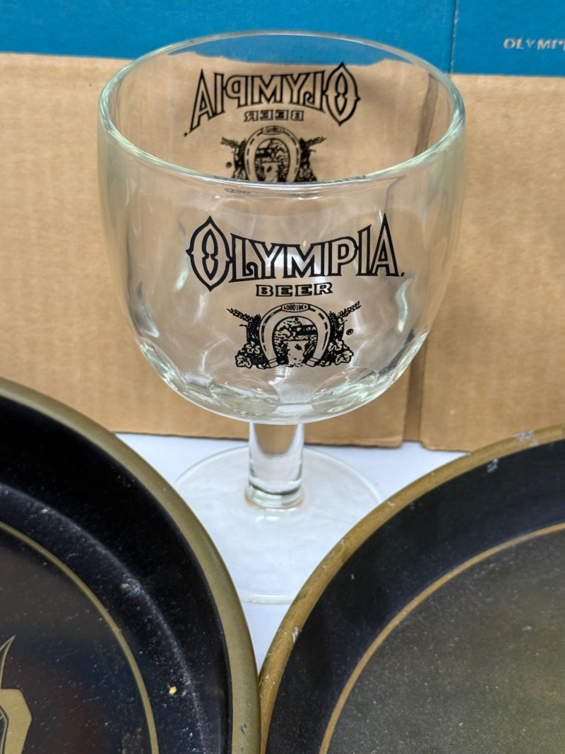 Olympia Beer Memorabilia 2 (12&13”) Unused “Stubbys” boxes 3 glasses 2 trays and a bottle opener 1 Olympia Beer plasticized paper banner 7.5’x33”