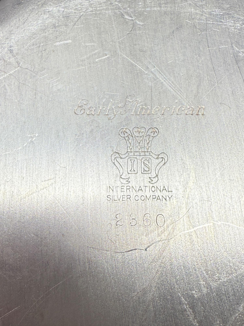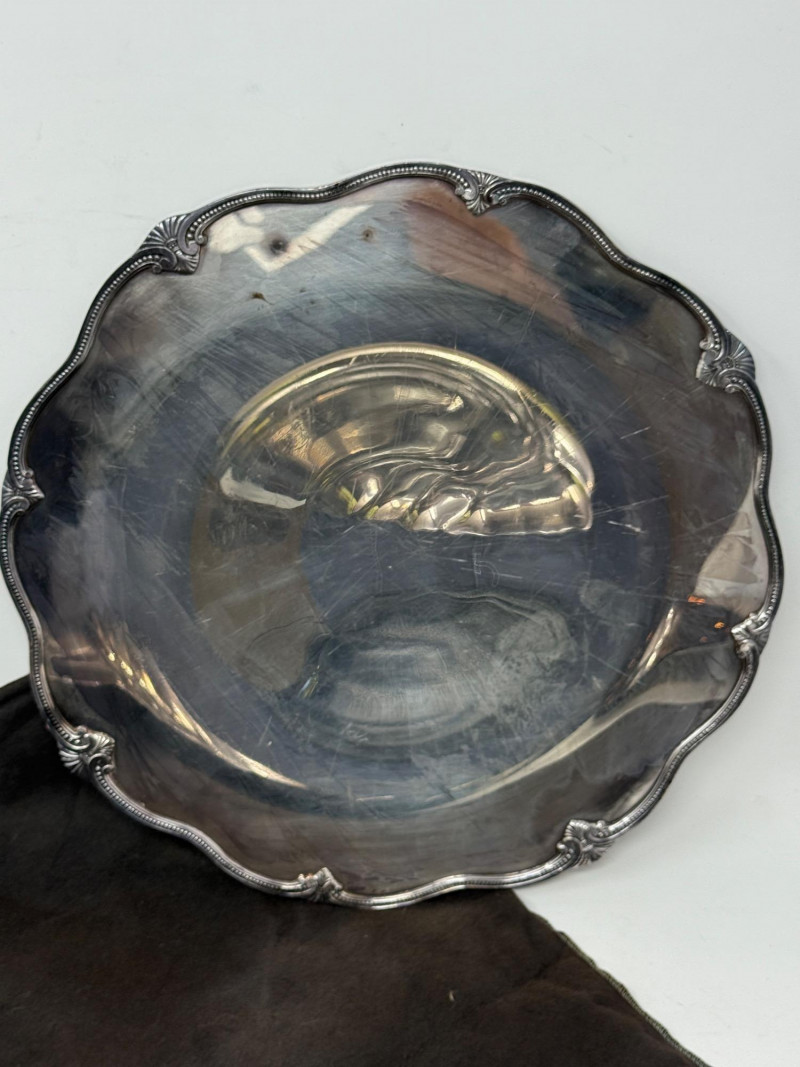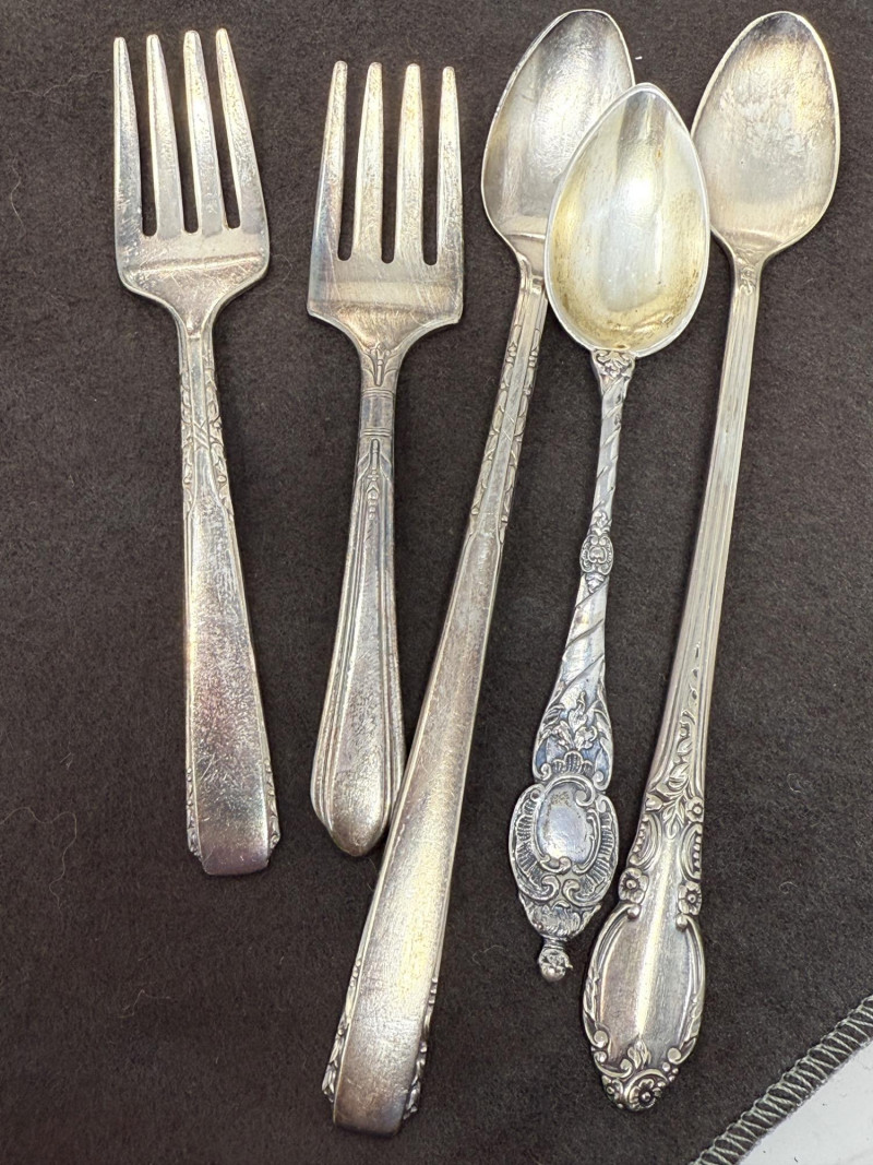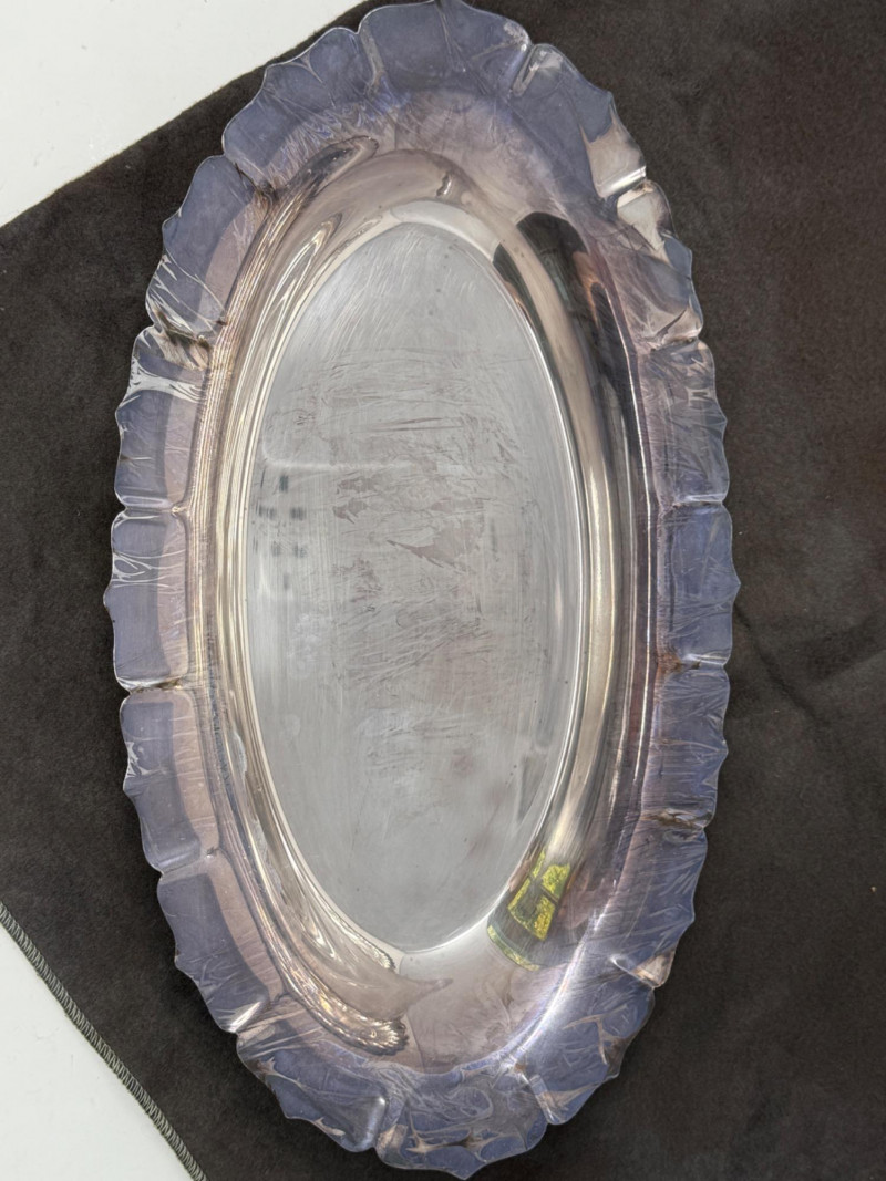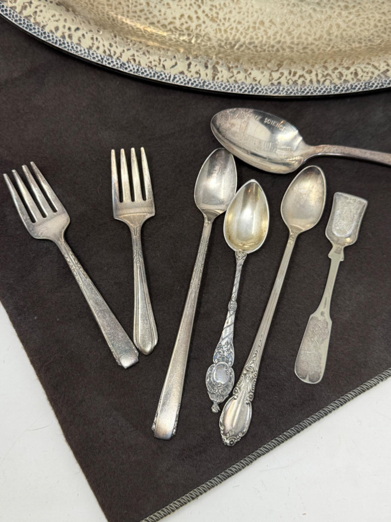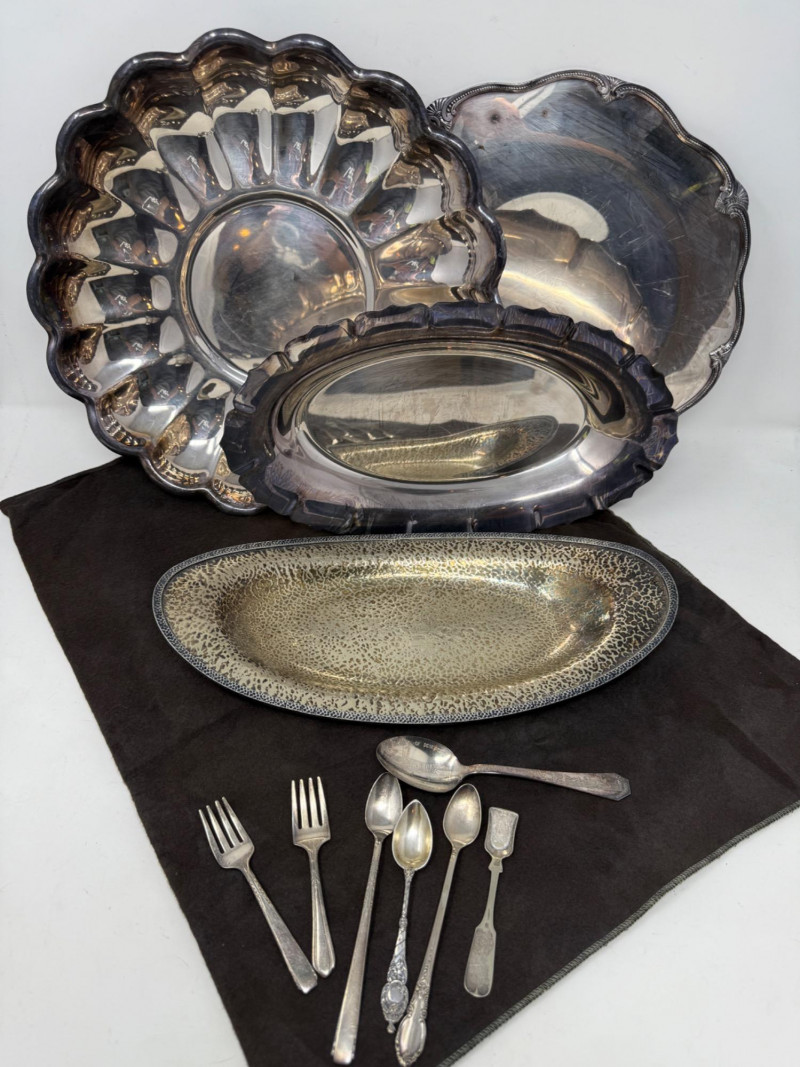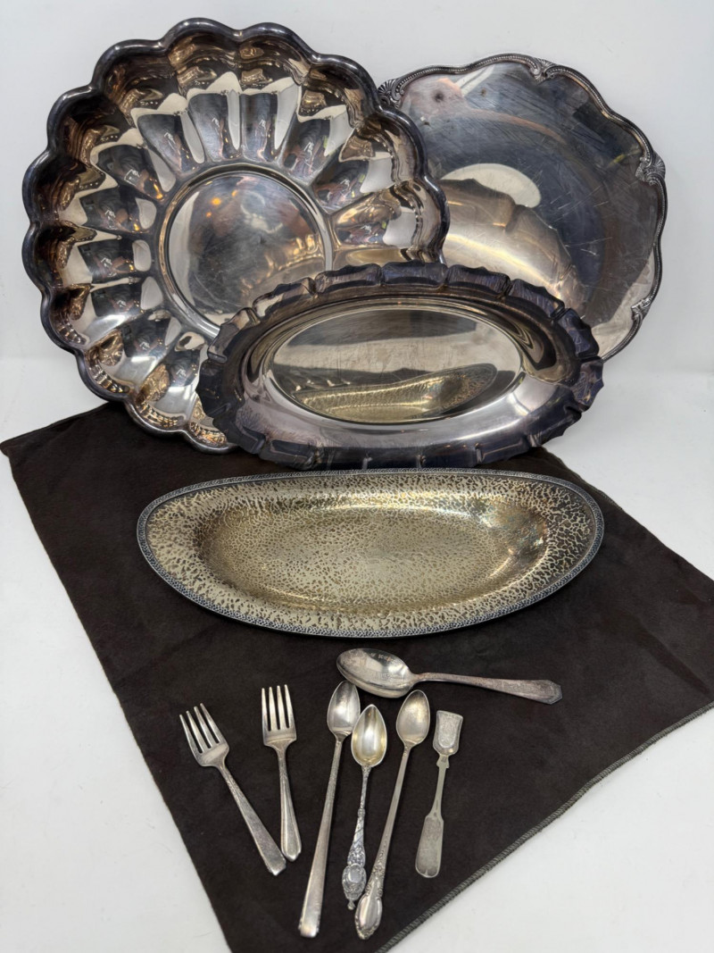 Scalloped edge bowl is 12.5” Oval shallow bowls Silver plate spoons, forks and antique coin silver salt shovel.