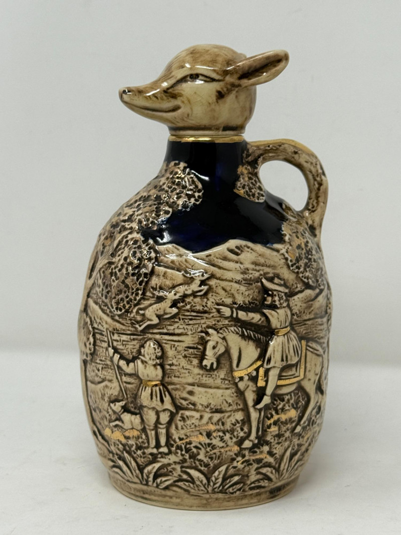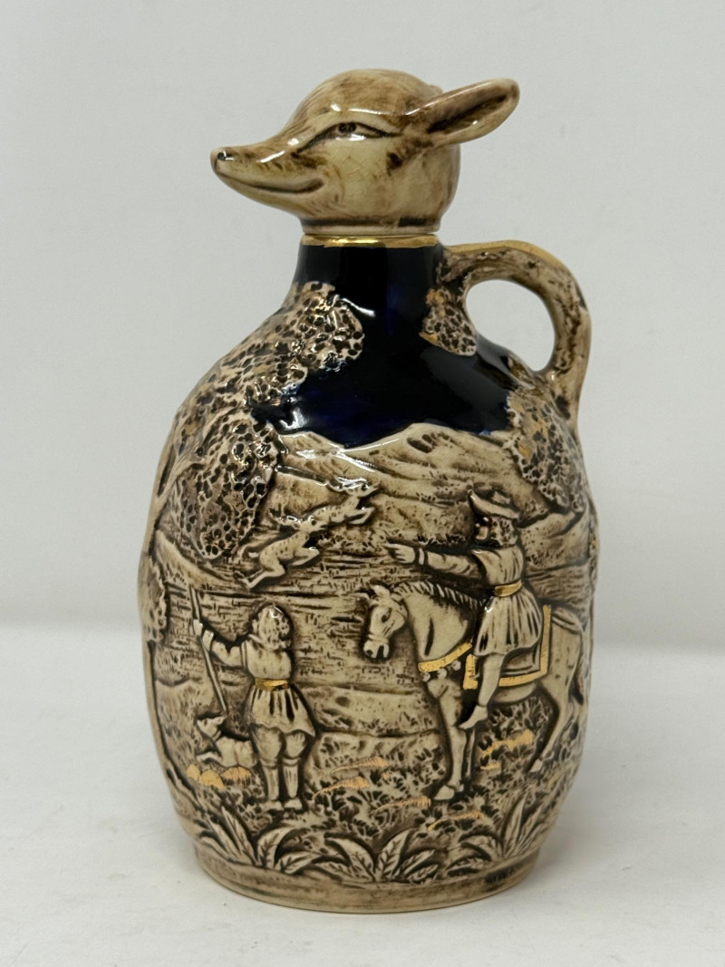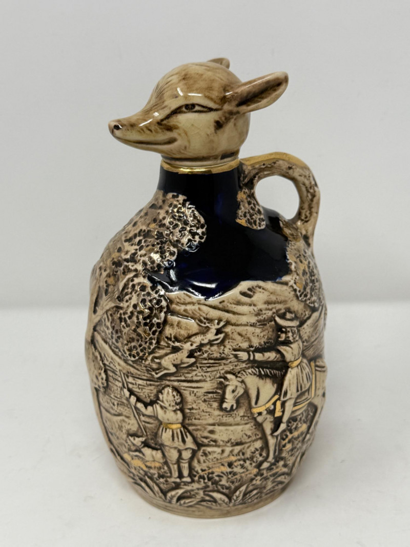 Musical Tilso Japan Fox Head Porcelain Decanter Plays How Dry I Am Body depicts a hunting scene with fox head stopper. Cobalt blue with gold accents. 5x8”