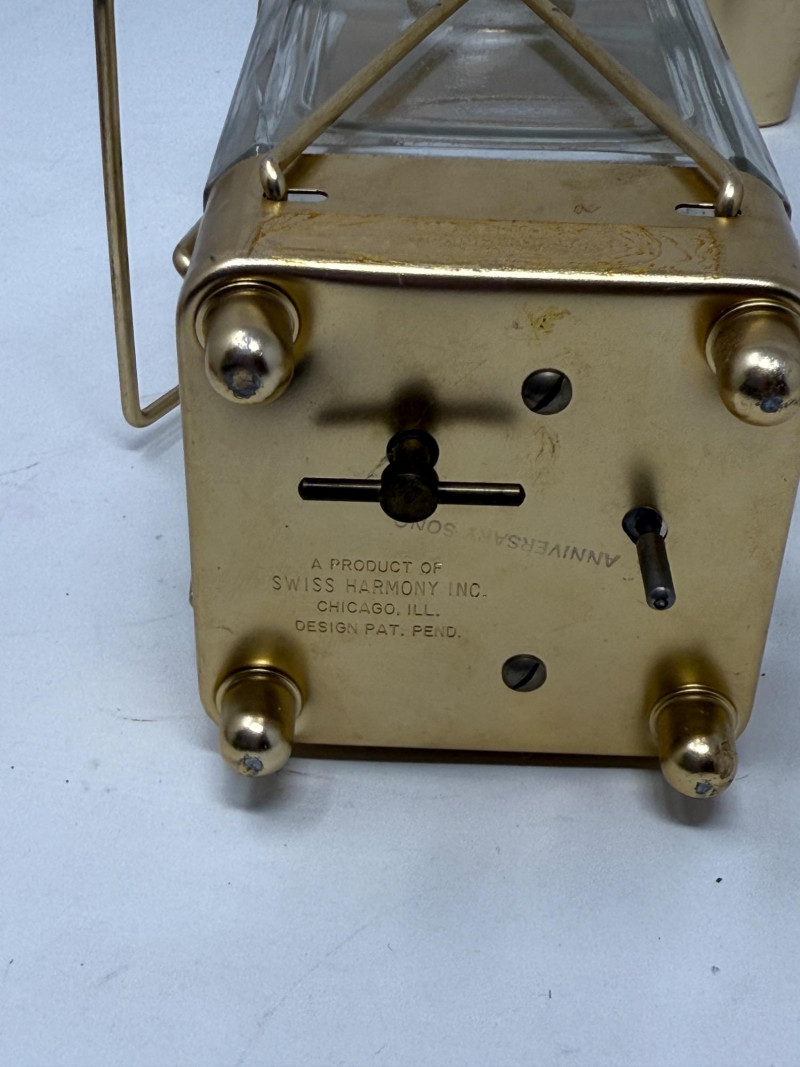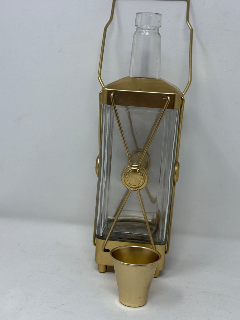Clear glass plays The Anniversary Song. Cork stopper has been pushed inside. Includes jigger. 3.5x11”