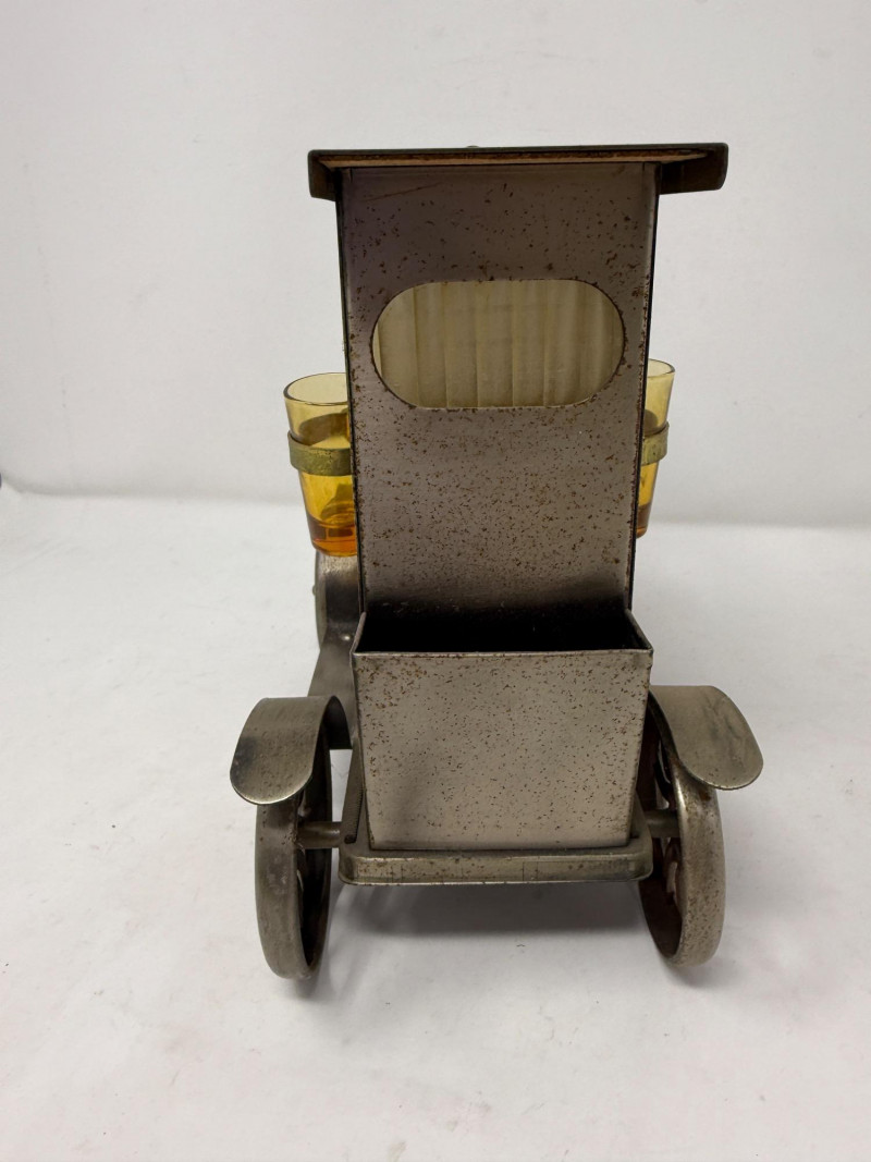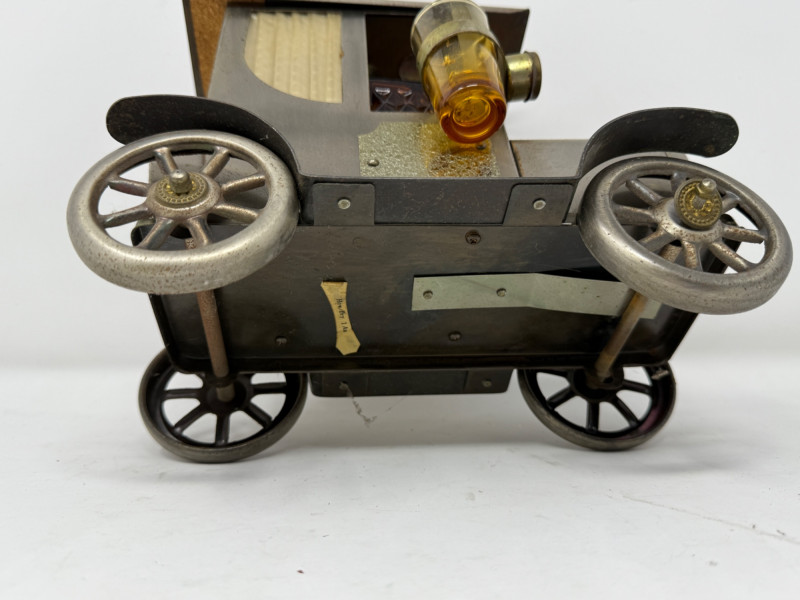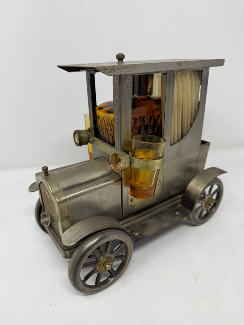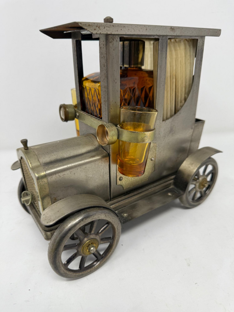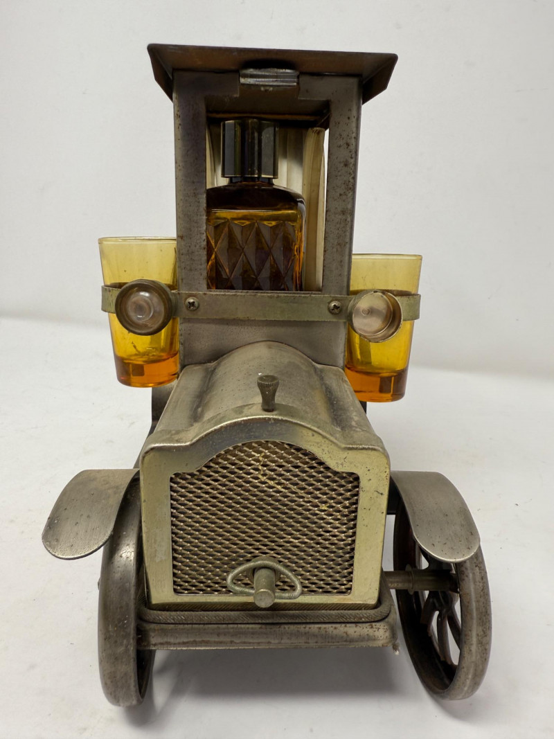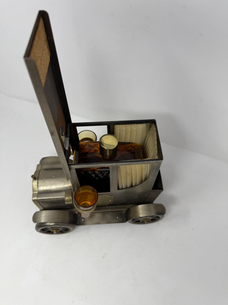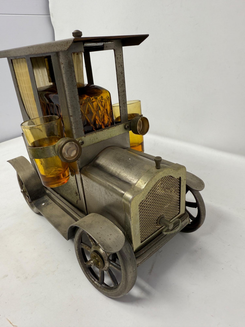 Musical Ford Model T Decanter Holder with Glasses 9.25x5.5x8.5” wheels roll, one is wobbly. Missing one headlight/cover.