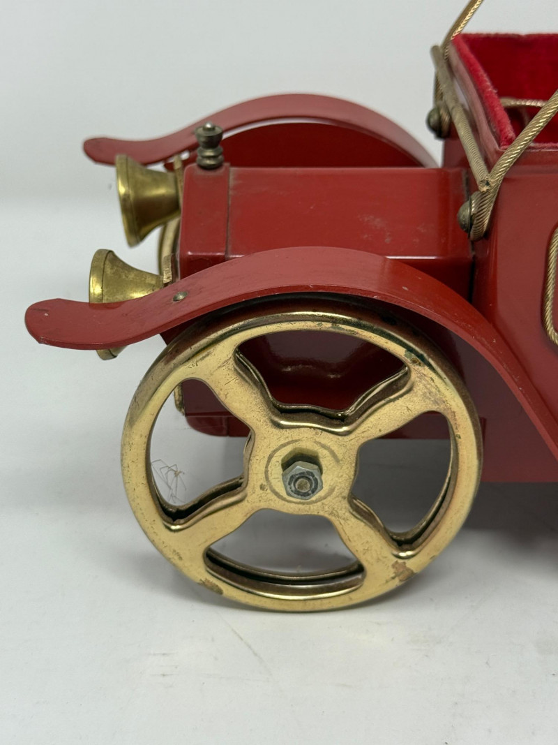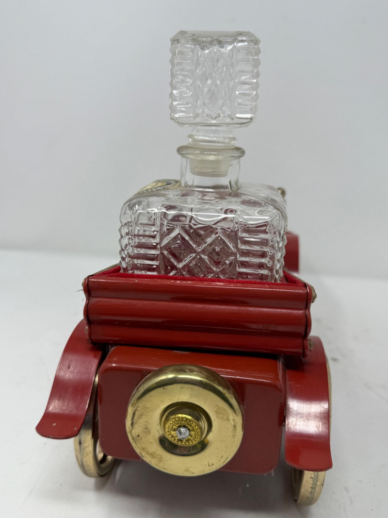 Red metal car decanter set 14x5.5x10” Spare tire winds the music box that plays Show Me The Way To Go Home