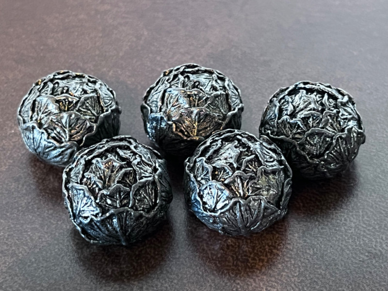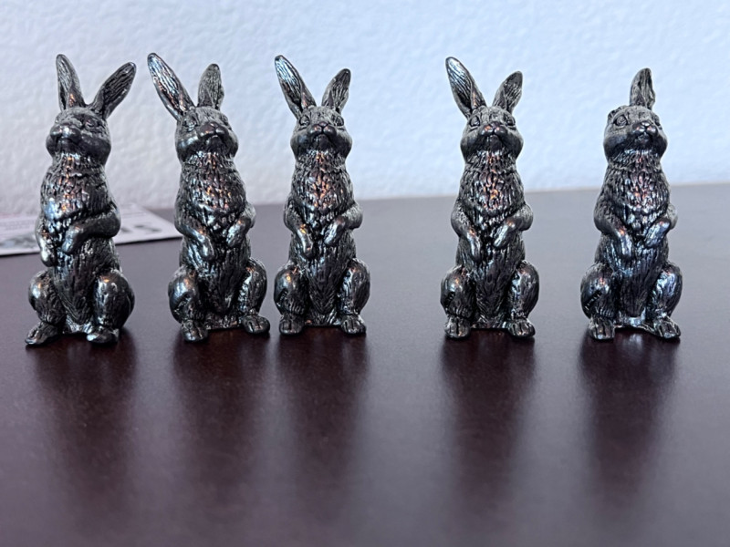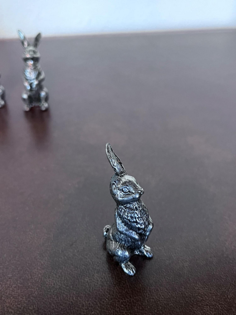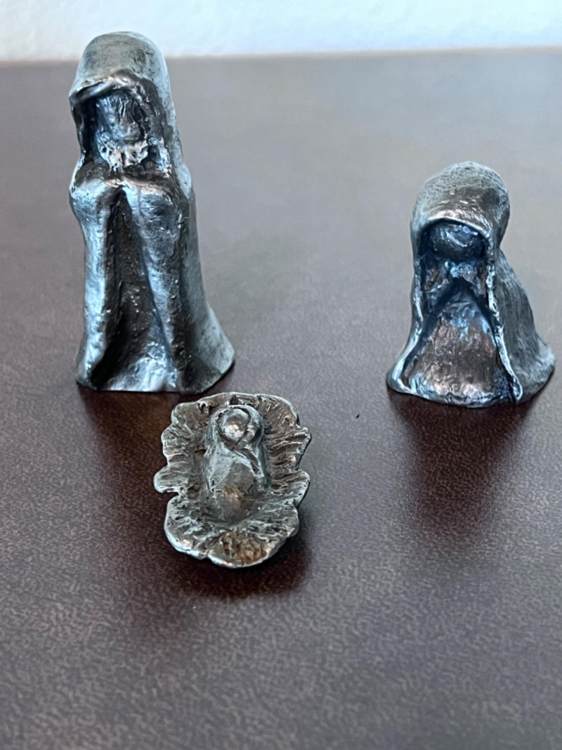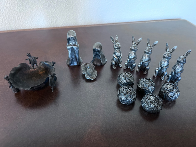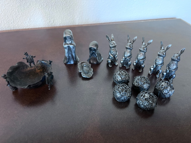 Small Pewter Figurines and Trinket Dish One Late 19th century pewter trinket dish One nativity scene Five pewter rabbits and five pewter heads of lettuce One rabbit is missing an ear