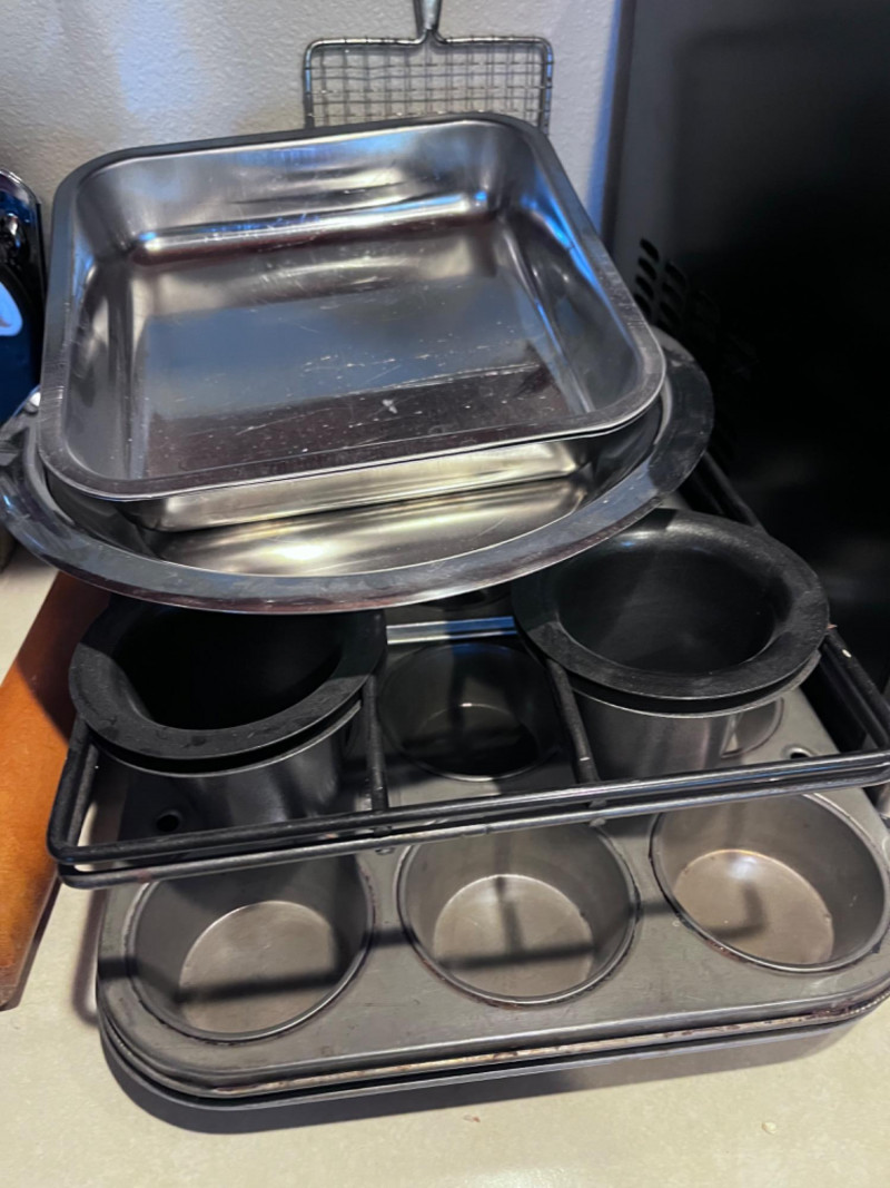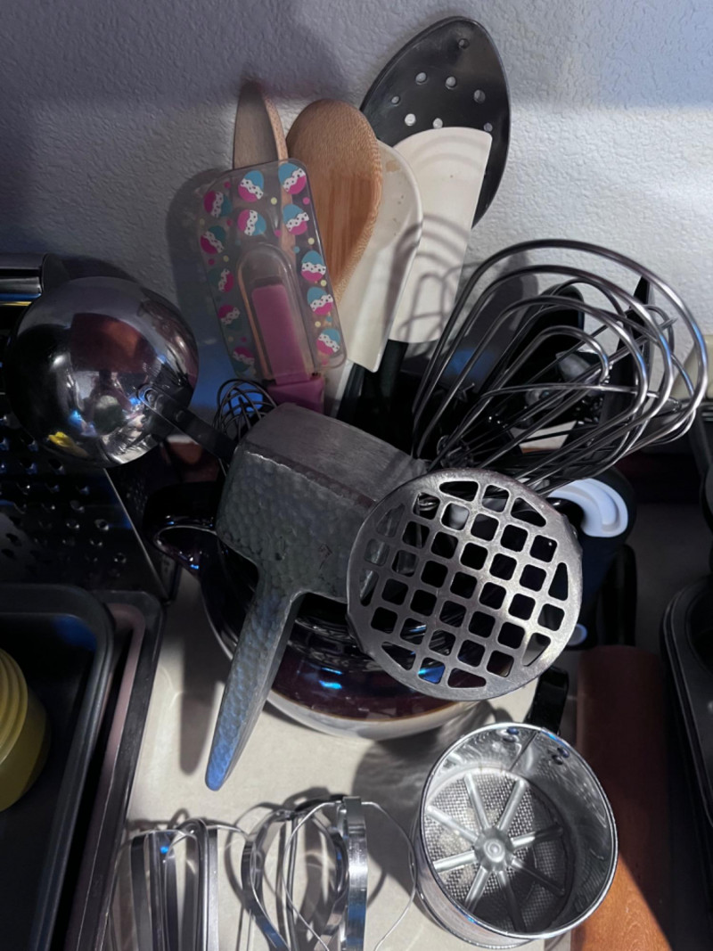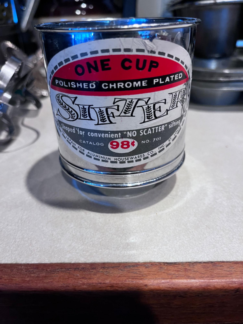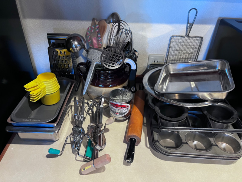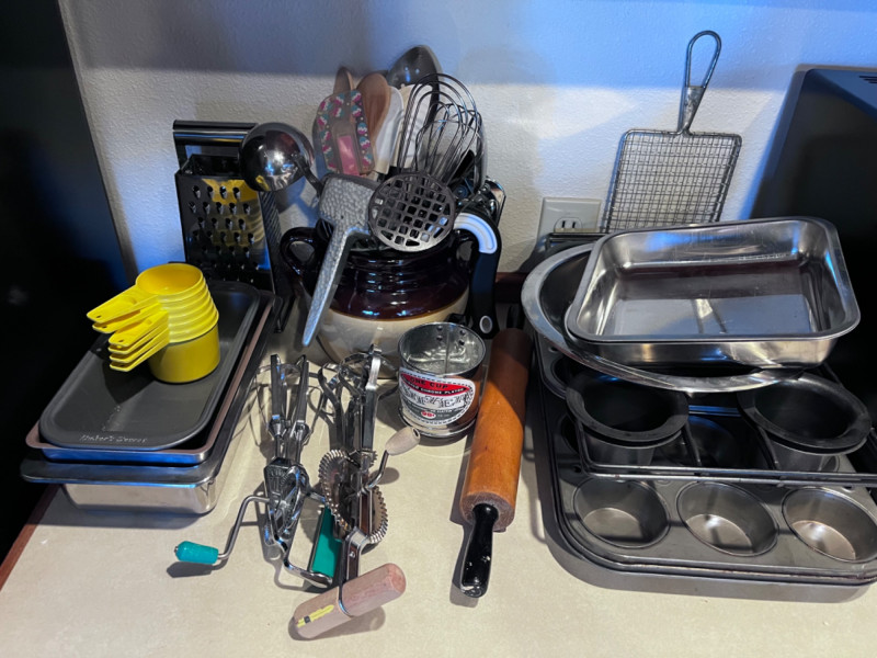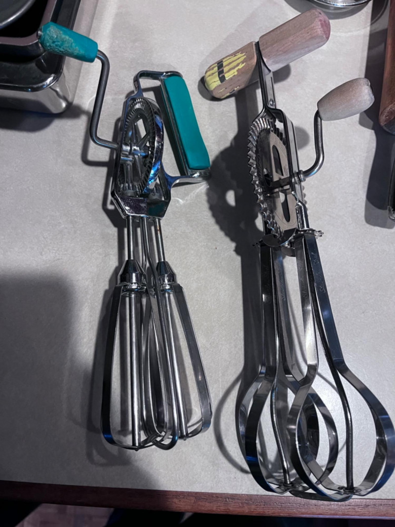 Kitchen Collection Two vintage hand crank mixers and sifter Bake wear, loaf pan, and utensils