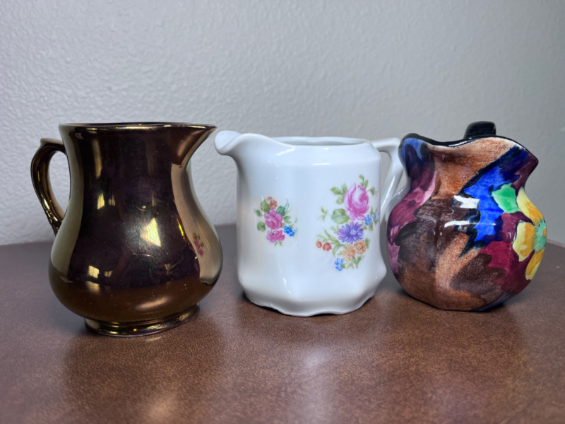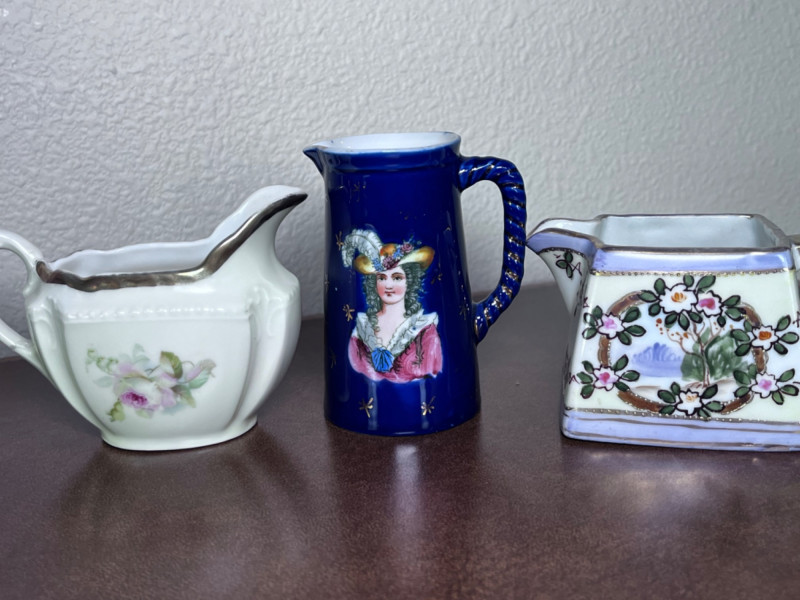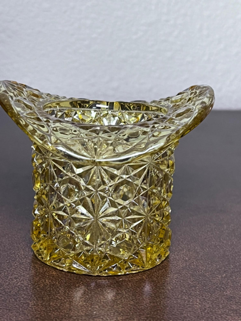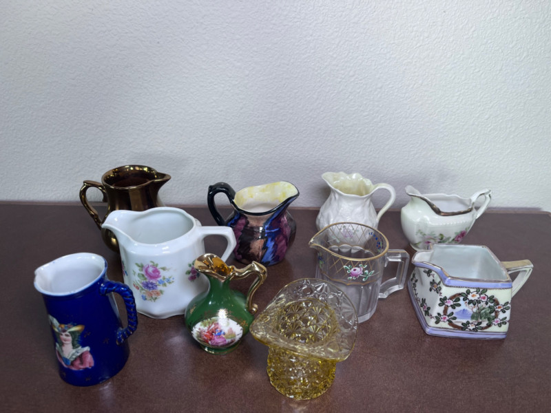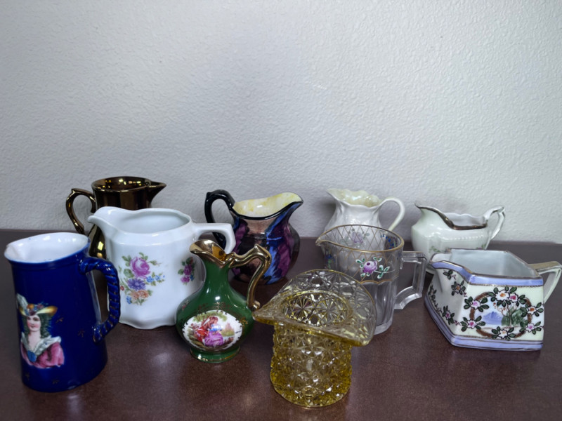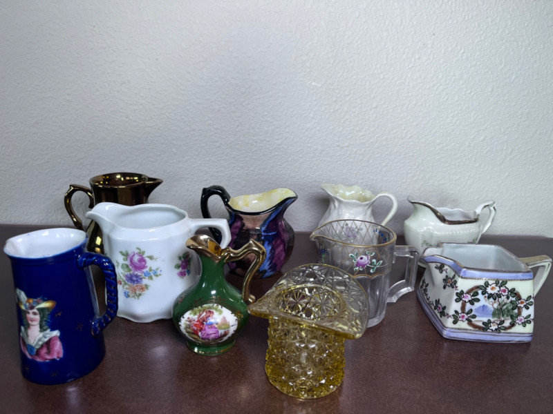 Small Pitchers, Fenton Top Hat, and Fostoria Top Hat 9 small porcelain pitchers from varies makers 1 Fenton daisy and button amber glass top hat 1 Fostoria American pattern glass top Includes small Belleek Pitcher