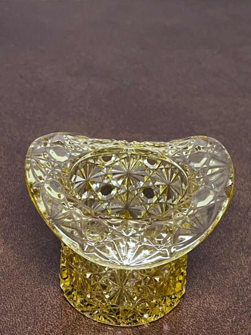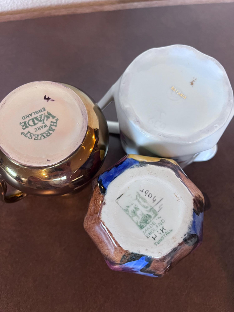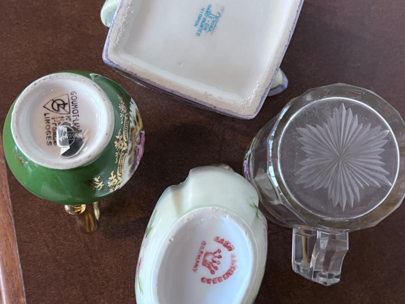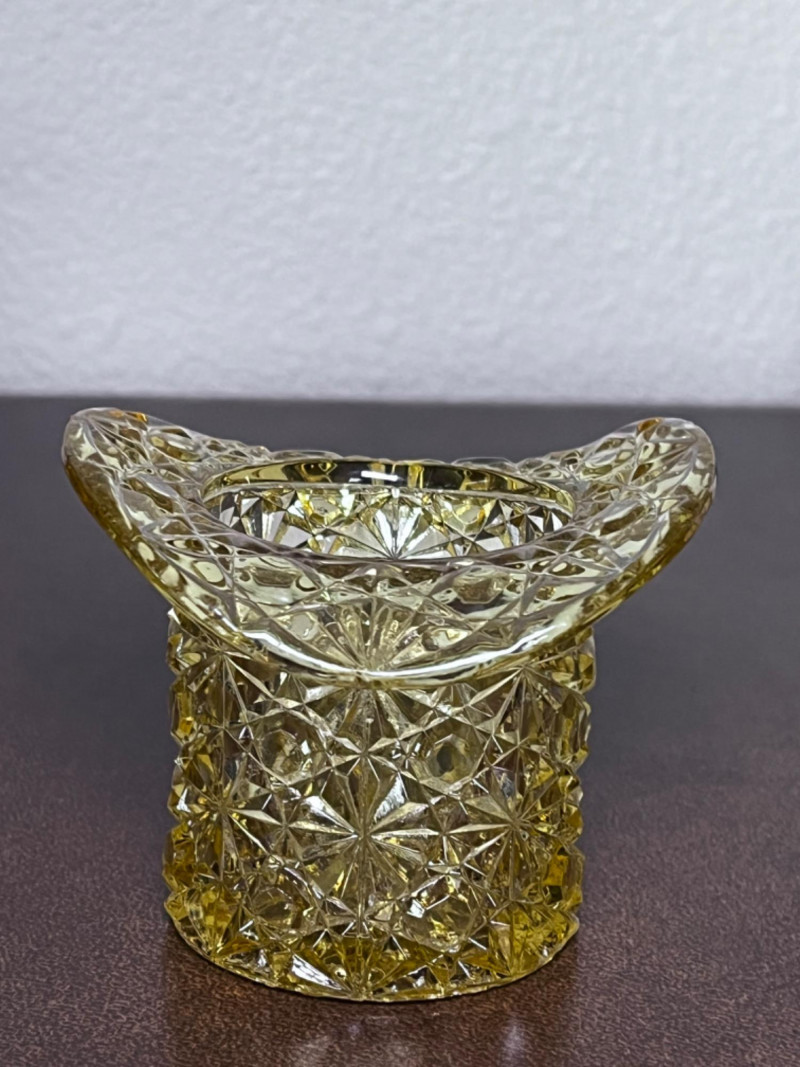 Small Pitchers, Fenton Top Hat, and Fostoria Top Hat 9 small porcelain pitchers from varies makers 1 Fenton daisy and button amber glass top hat 1 Fostoria American pattern glass top Includes small Belleek Pitcher