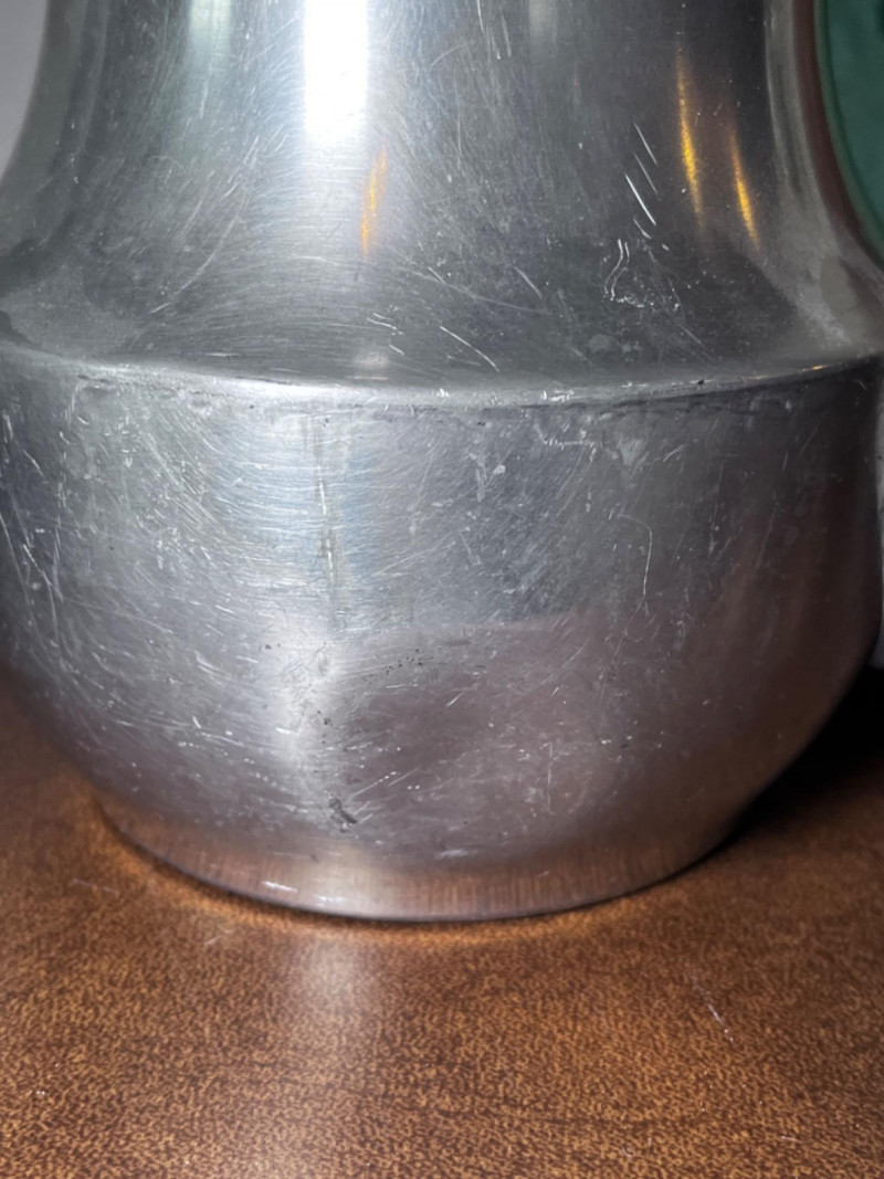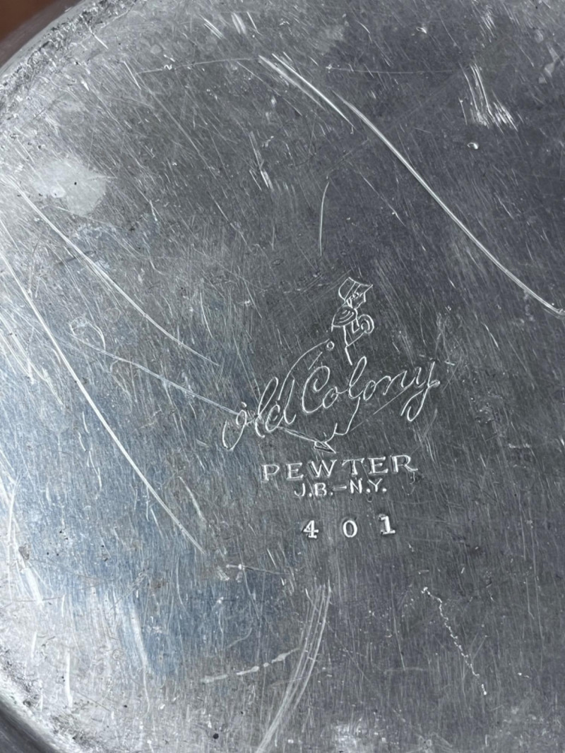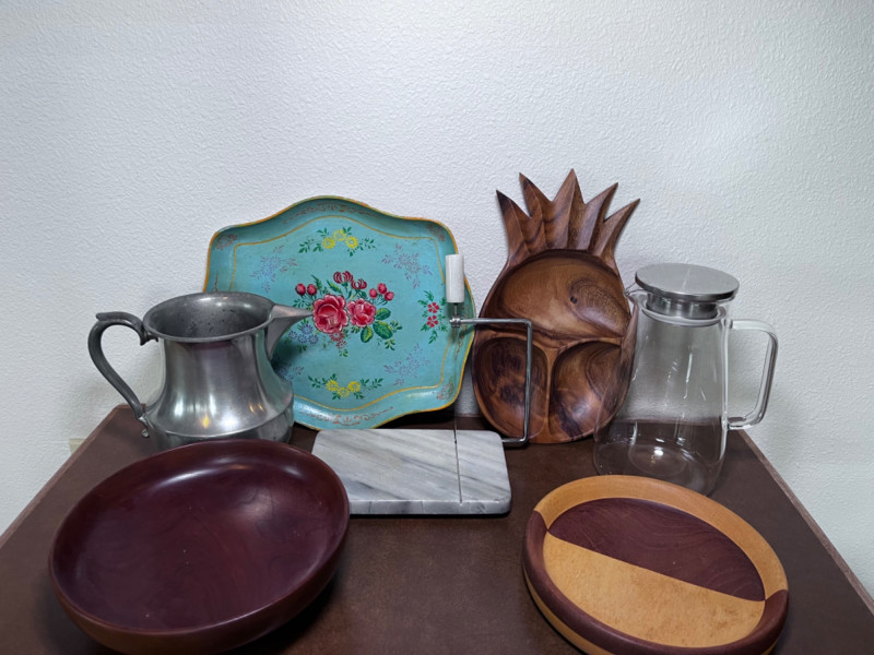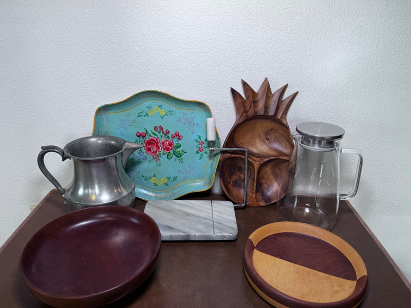 Party Platters, Pitchers, and Vintage Marble Cheese Slicer 3 wood finish platters 1 hand painted platter 1 glass straining pitcher 1 pewter pitcher with dent 1 vintage marble cheese slicer