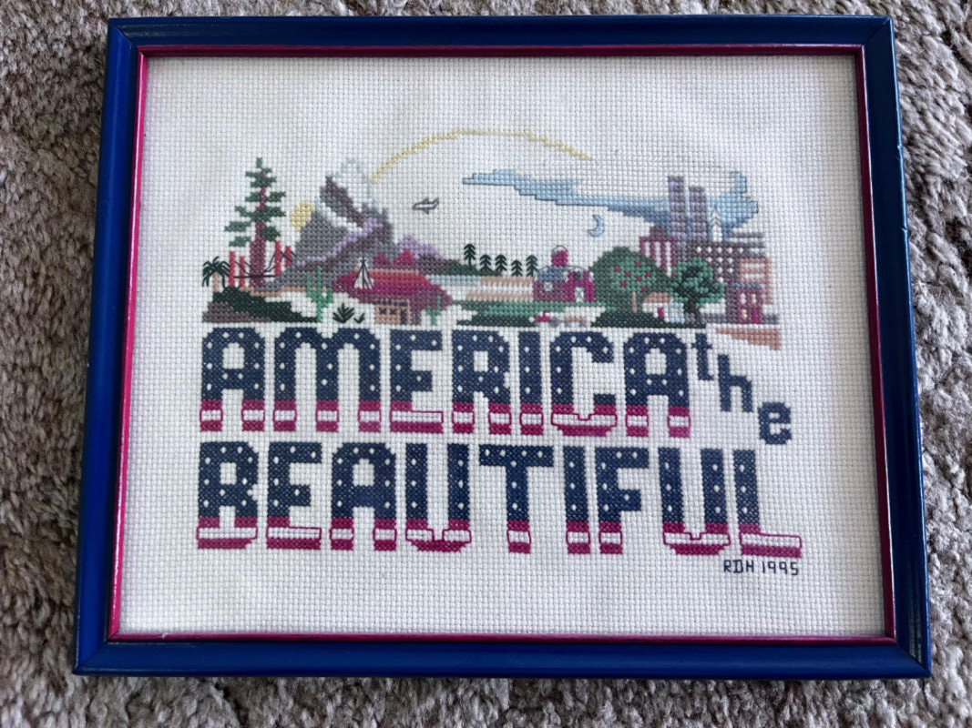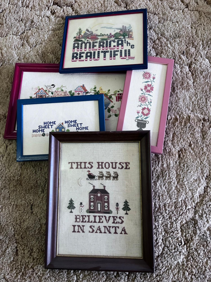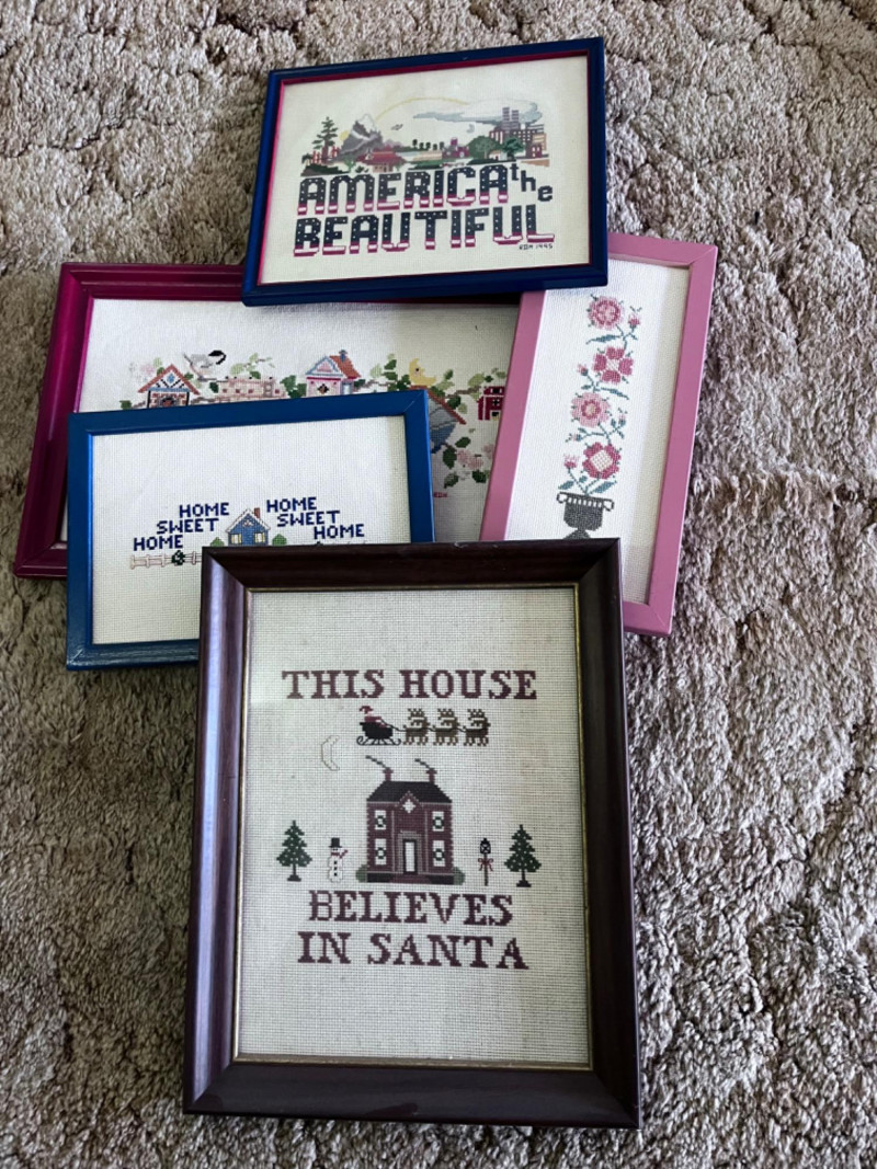 5 Needlepoint Wall Decorations Home Sweet Home 7.5”Lx10”W Flowers 11.5”Lx5.5”W This Home Believes in Santa 14”Lx11”W America the Beautiful 9”Lx10.5”W Home is Where the Heart Is 10”Lx17”W