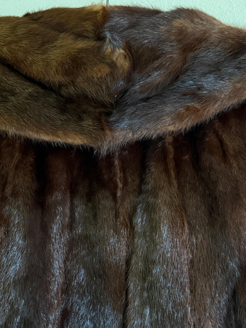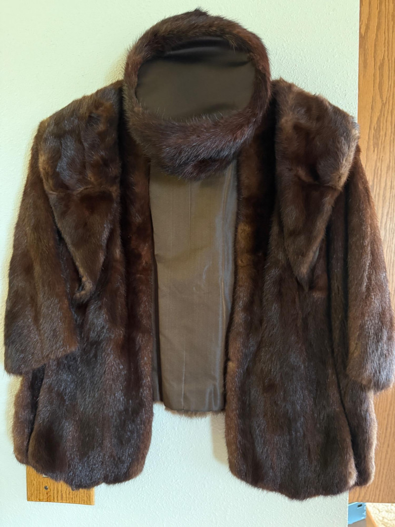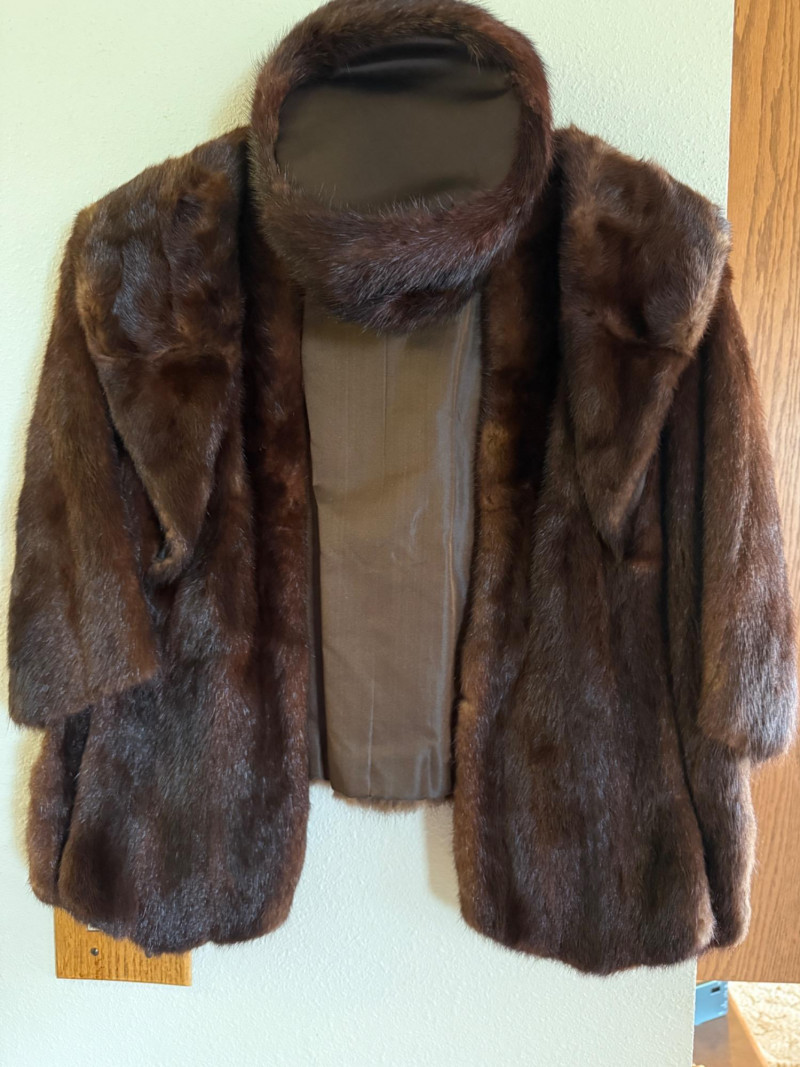 Over the shoulder mink shawl with satin lining. Not sized, From Larchmont Furriers, Tacoma.