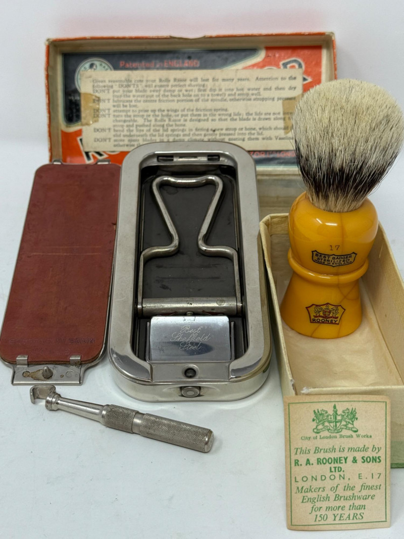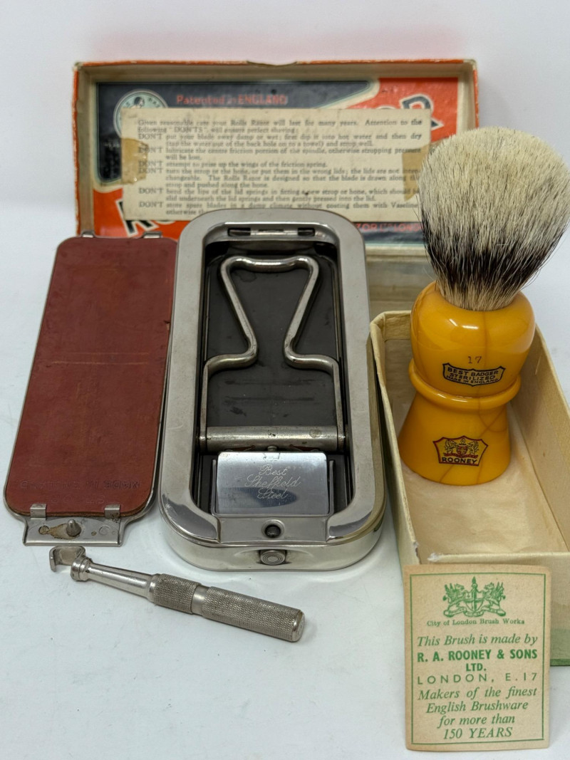 Striated French Ivory Comb 8.5” Antique Rolls Razor made with Best Sheffield Steel. Sterilized Badger Hair Brush by Rooney