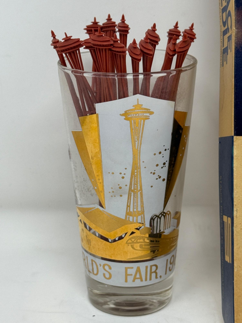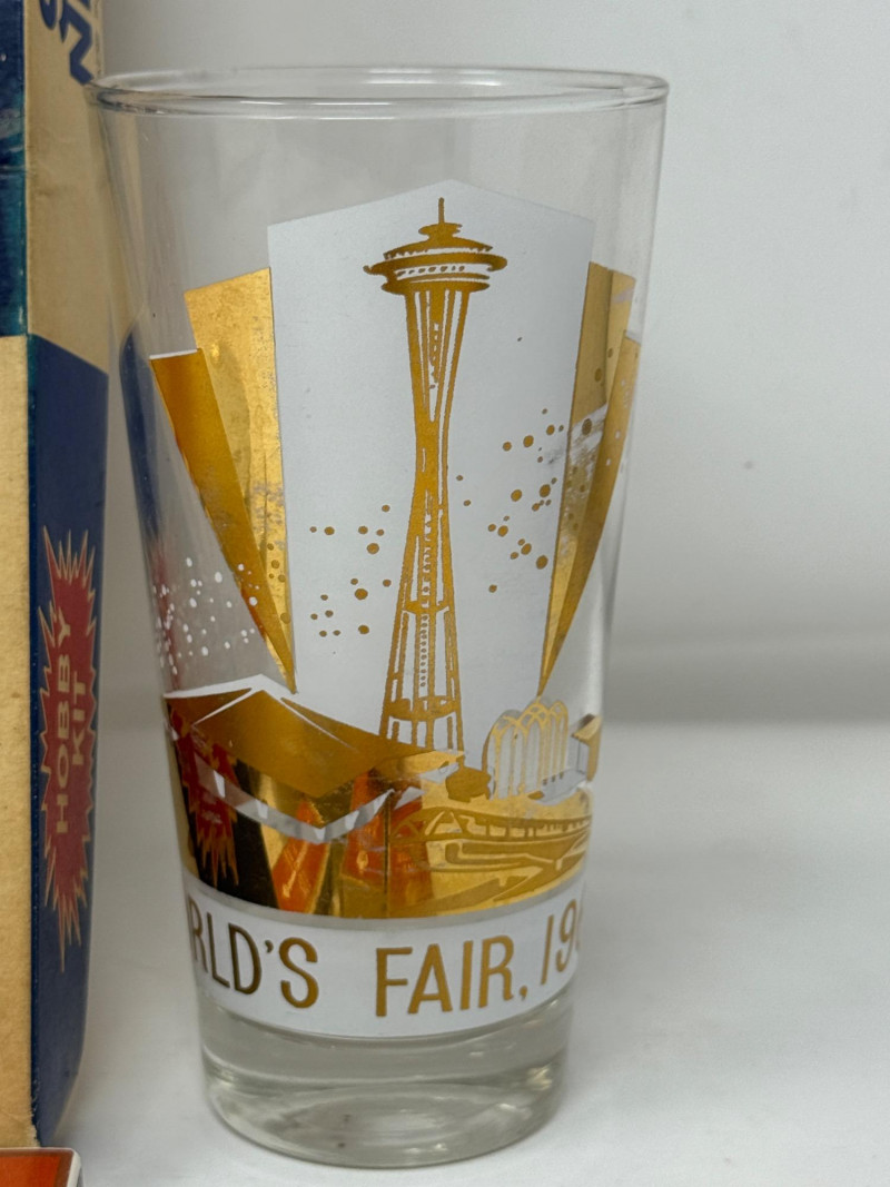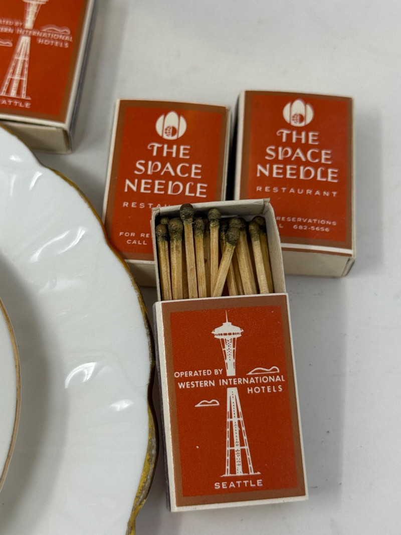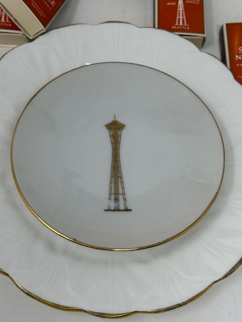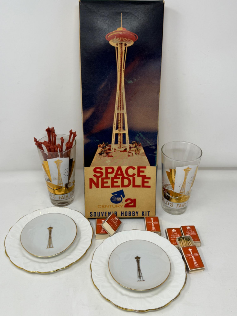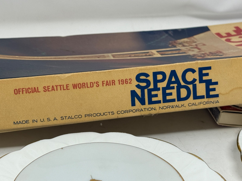 Vintage Space Needle & 1962 World’s Fair Collectables (2) each 4” space needle and 6.5” gold rim plates. Glasses, stir sticks and match boxes.