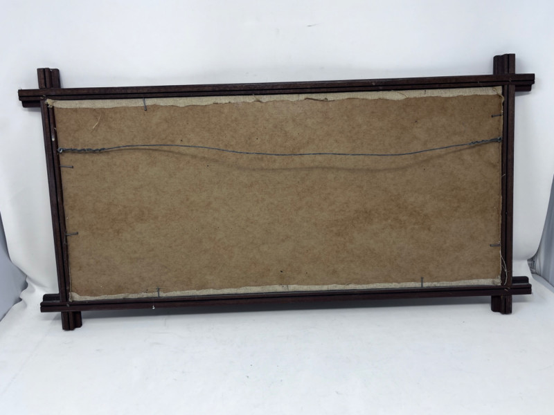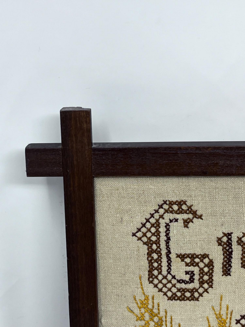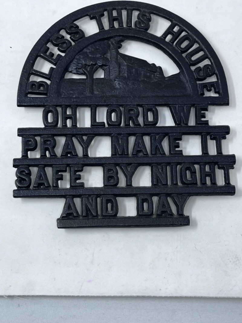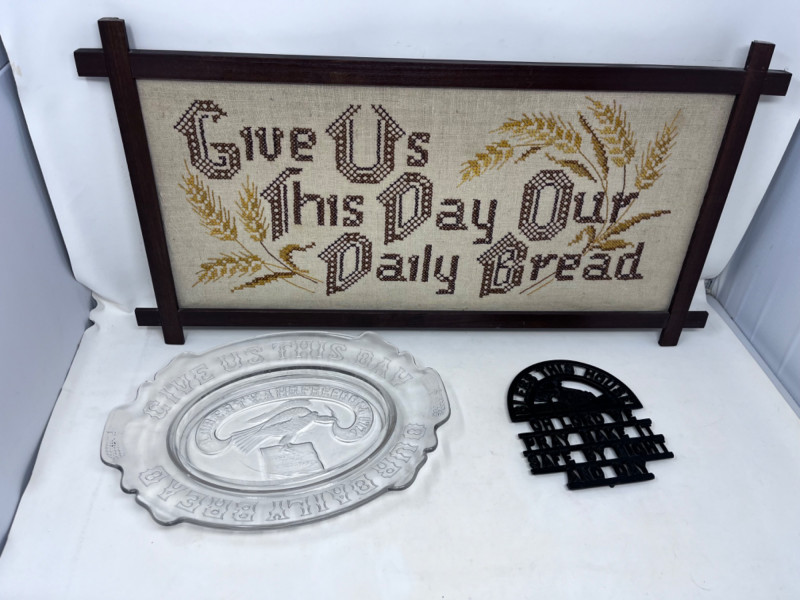 Religious Needlepoint, Trivet and Platter 1 Cast iron trivet 1 glass platter 1 Needlepoint in wood frame 11”Lx23”W