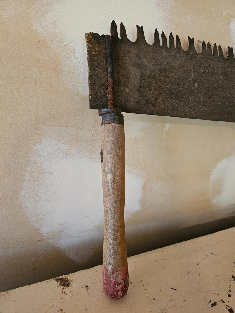 Antique Two-Man Crosscut Saw Also known as a "misery whip" Rusty, but would make a great wall hanger Blade is 66"L x 6.25"W (widest point) & wooden handles are 14" long 66"L x 14" W