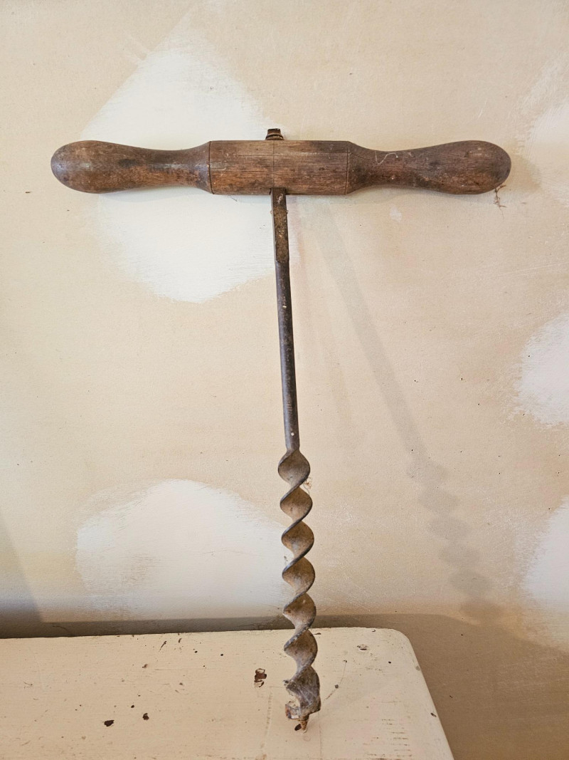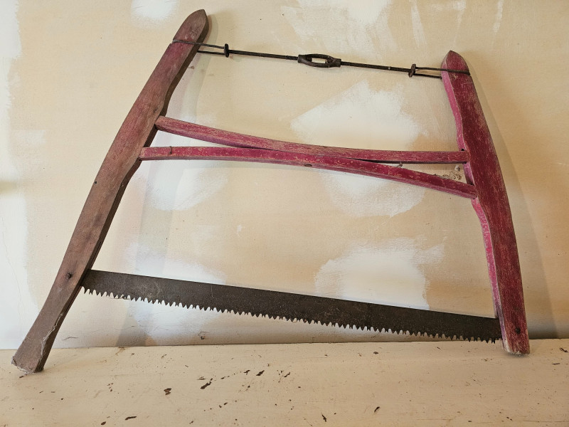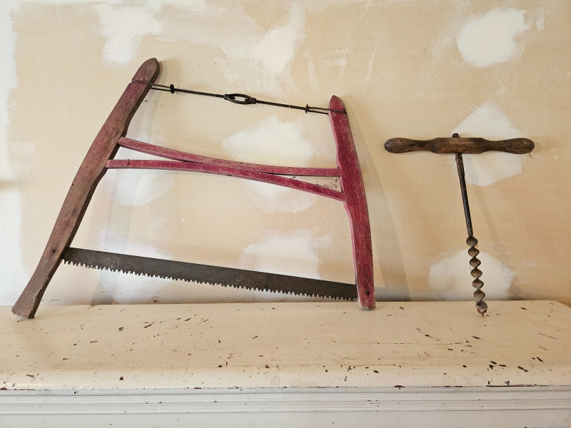 Antique Buck Saw & Auger Late-1800's woodworking tools Buck saw (or bow saw) appears complete and in vintage condition 22"T x 33"W Brace & bit style wood auger appears complete and in good condition. 17" bit used to bore 1" holes with a 14" wooden handle 17"T x 14"W These look like they could go to work tomorrow, or would make great decor pieces in the farmhouse, cabin, or bar!