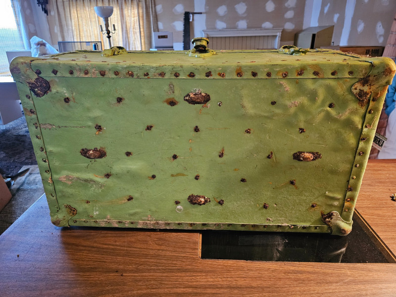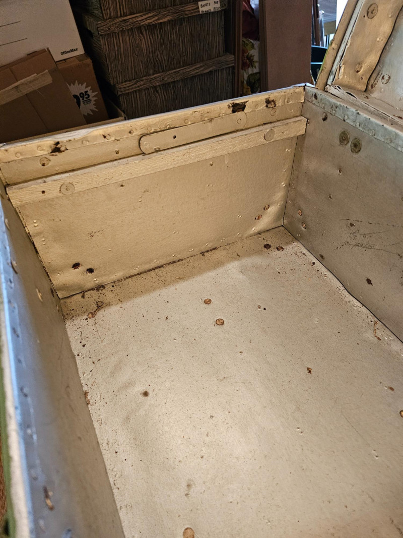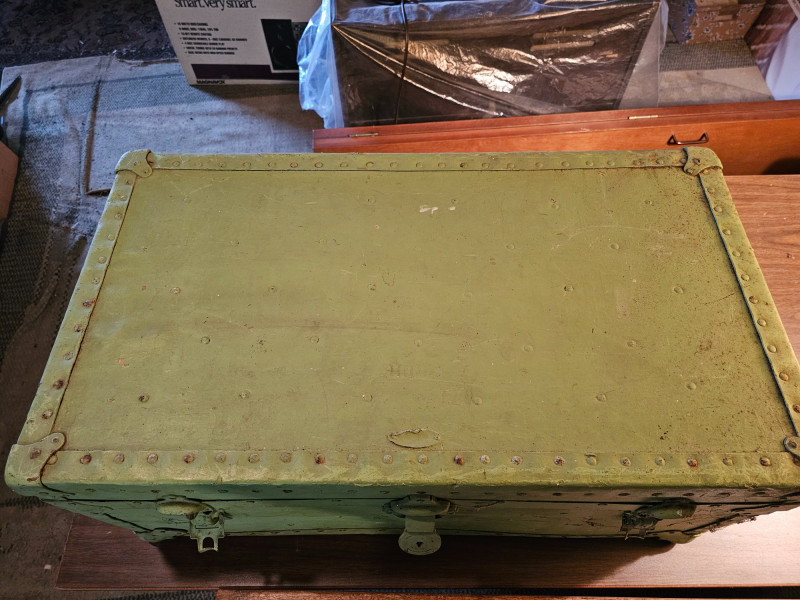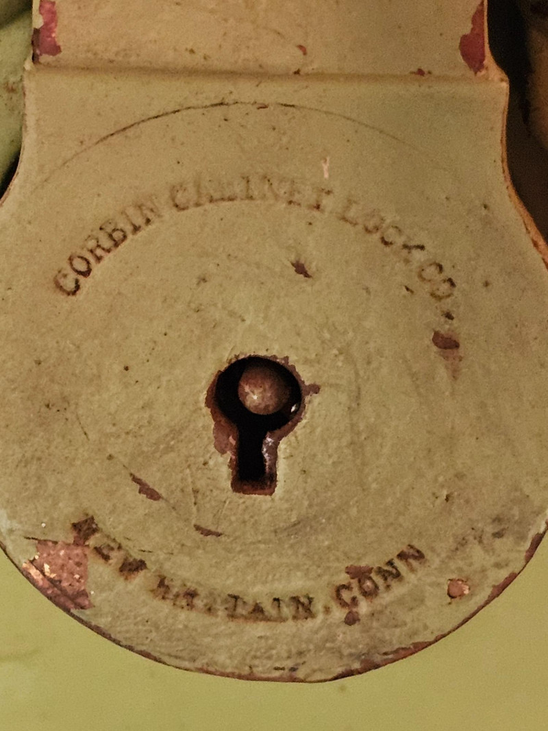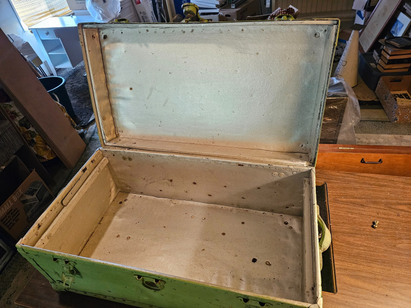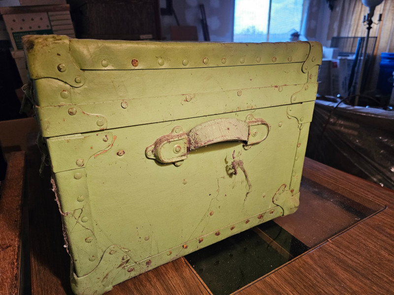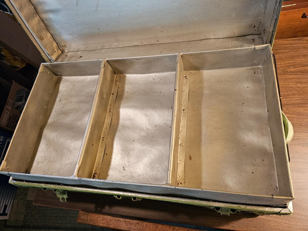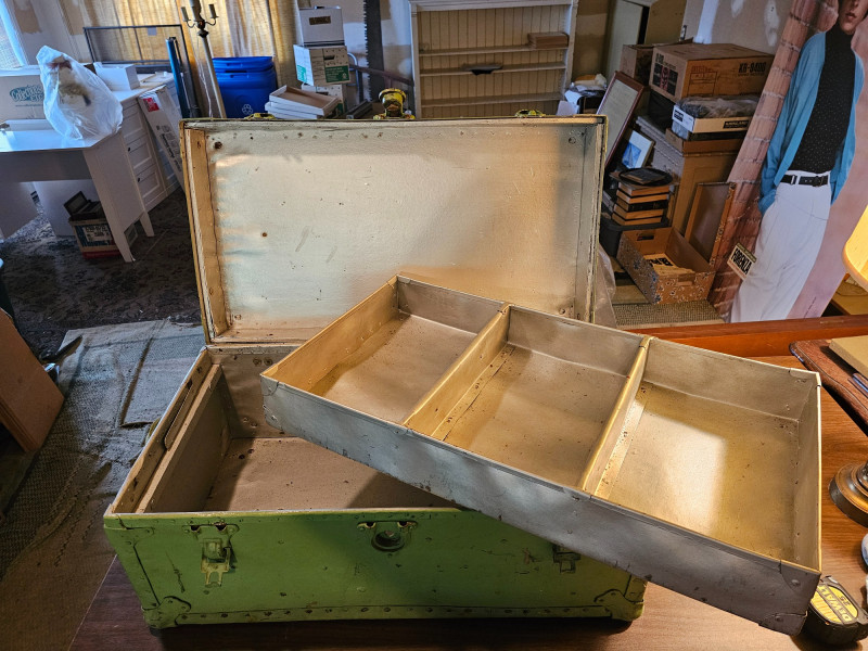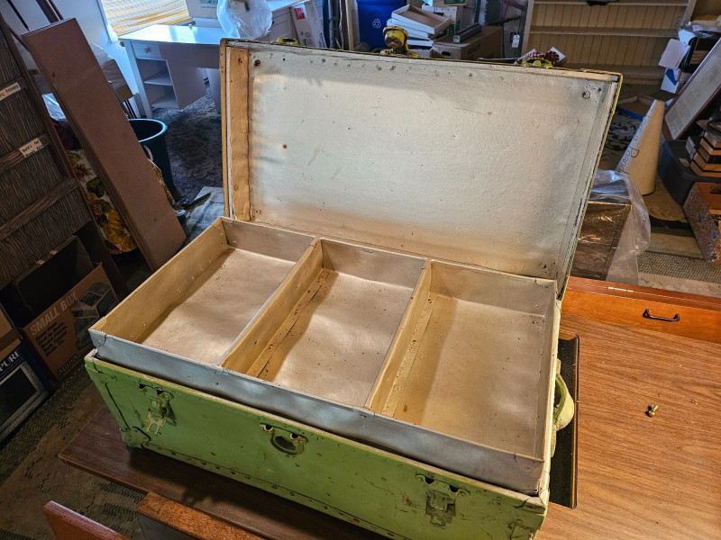 Vintage Light Green Travel Trunk/Footlocker Likely 1930s-1940s vintage travel trunk Lock manufactured Corbin Cabinet Lock Company in New Britain, Connecticut Metal reinforced corners & riveted strapping Includes lift-out partitioned insert In vintage condition (see pics) No key 13.5"T x 31"W x 17"D