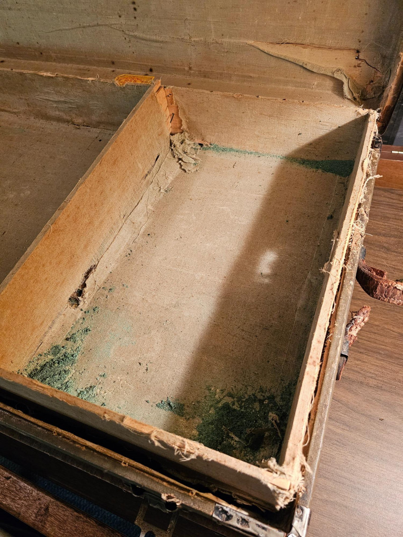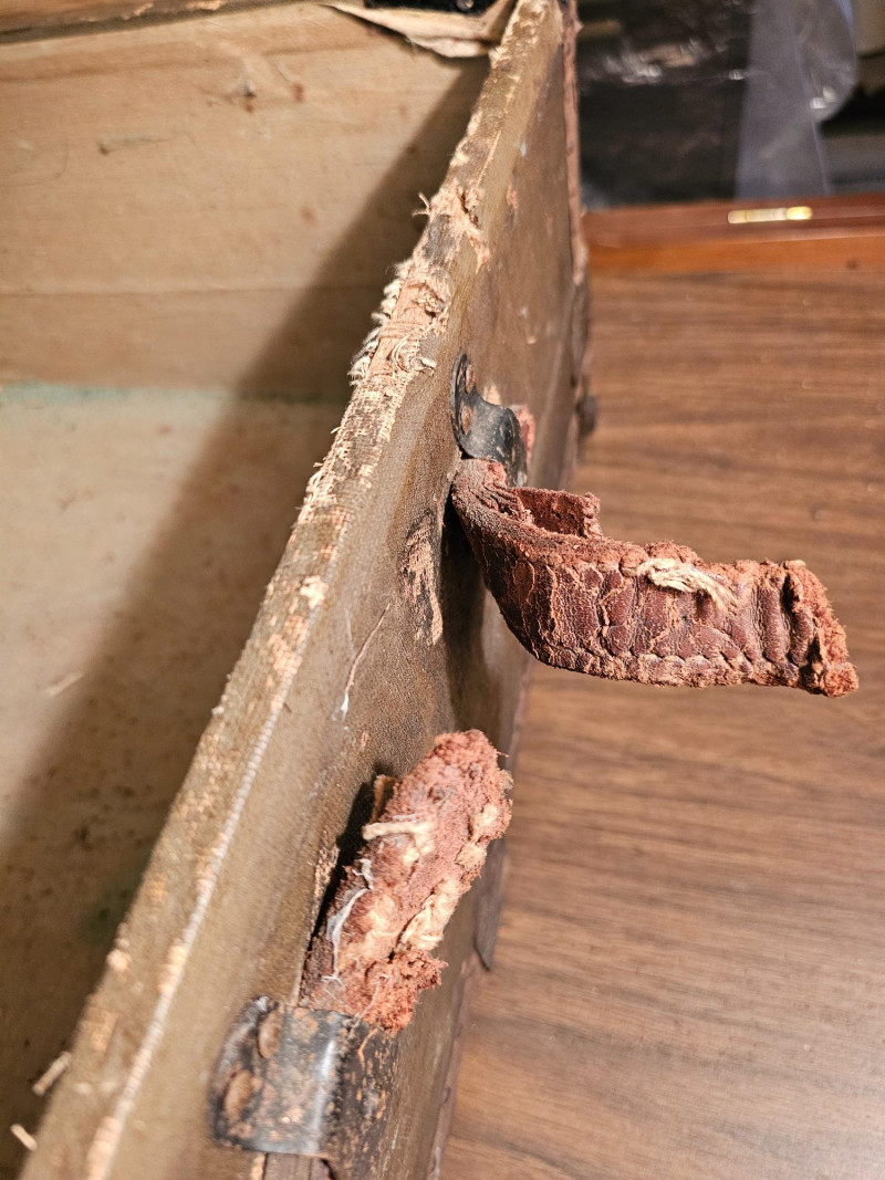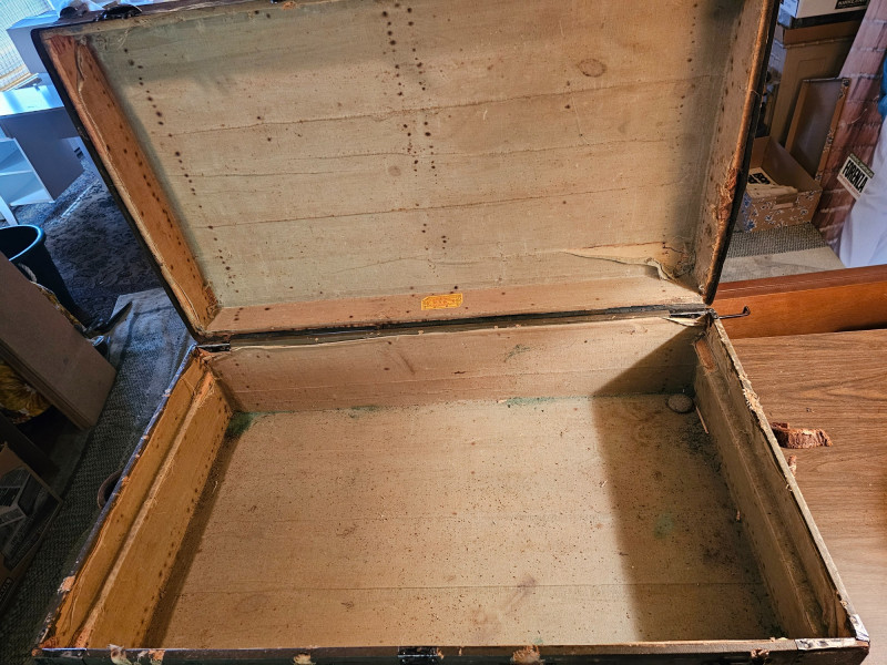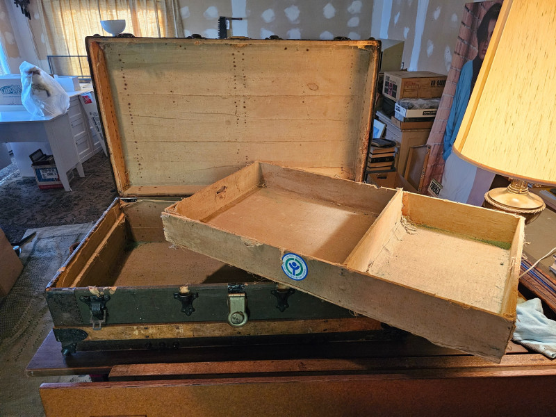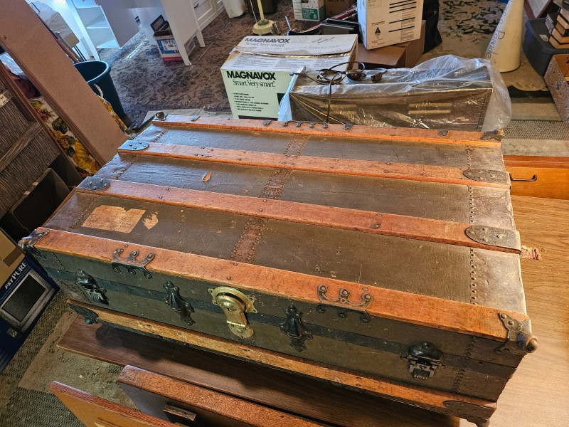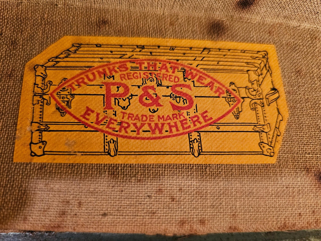 Ornate Antique P & S Flat-Top Steamer Trunk Wooden covered in canvas, with wooden slats and metal hardware P & S was in business in the late 1800s to early 1900s "P&S - Trunks that Wear Everywhere" Metal reinforced corners & riveted strapping Includes lift-out partitioned insert Has the remnants of a Railway Express Agency" tag on top In vintage condition, right-side leather strap is broken, could definitely use a cleanup (see pics) No key 13"T x 38"W x 22"D