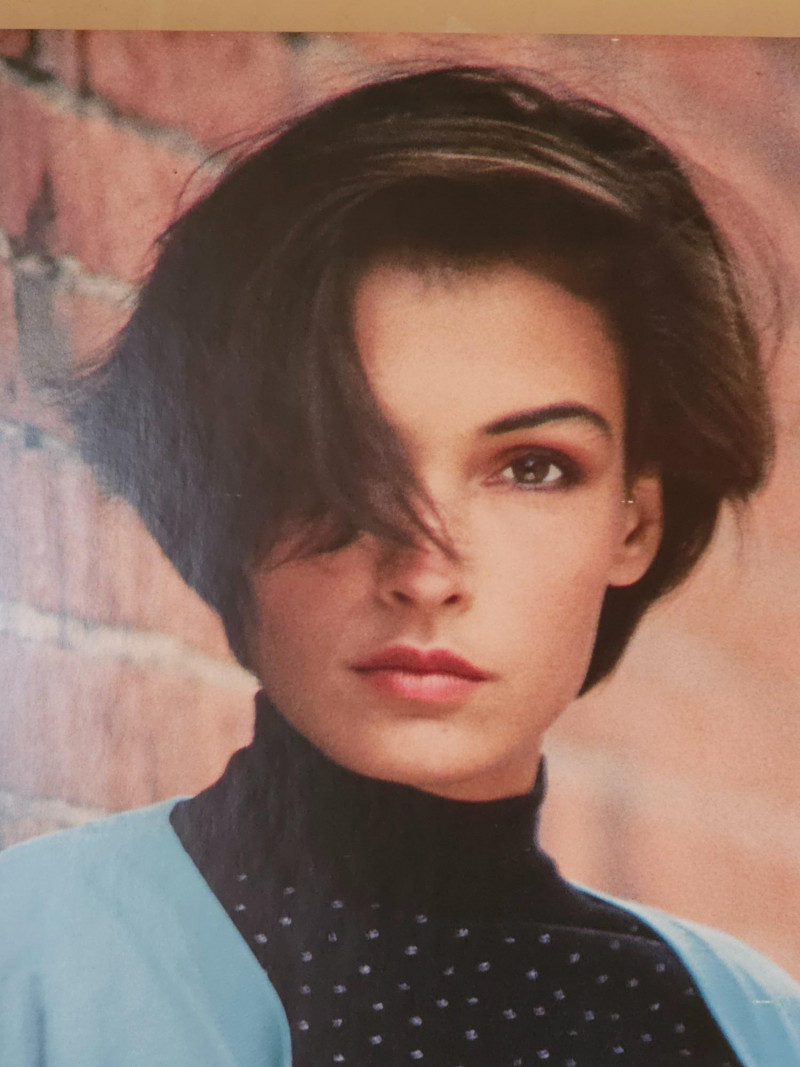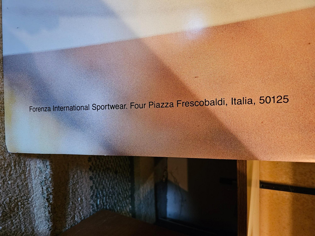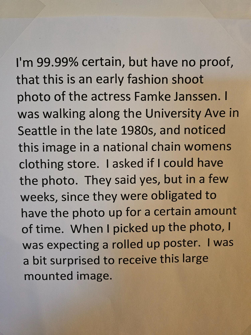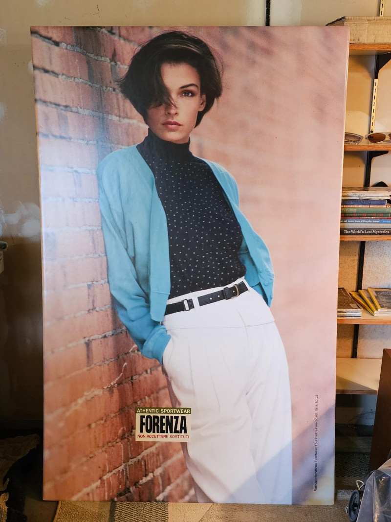 1980s Forenza Italian Sportswear Store Display Featuring Famke Janssen Famke Janssen was a Forenza model from 1984 until the early 1990s before her acting career took off as a Bond Girl, in X-Men and the Taken franchises. Large format store window ad measuring 67"T x 43.5"W Made of a compressed board with great color!