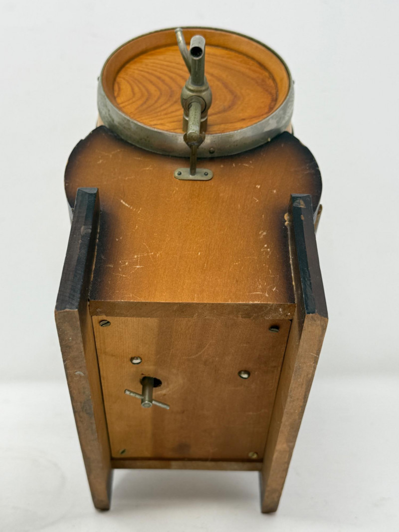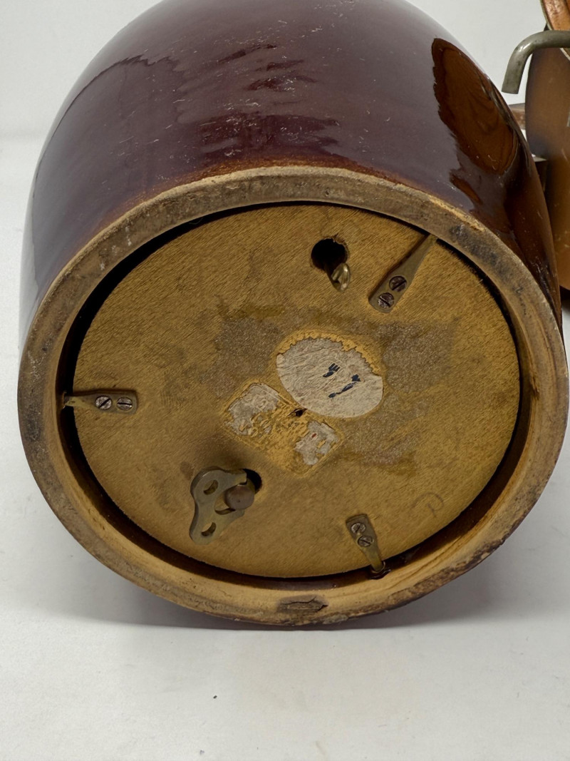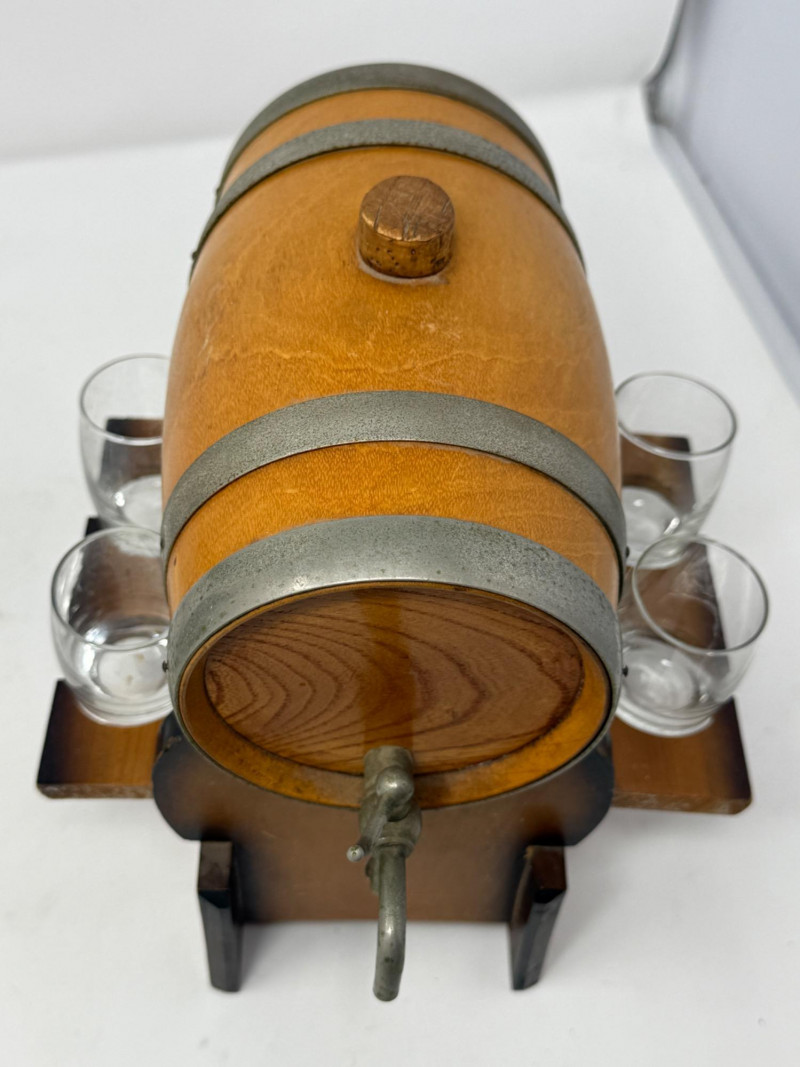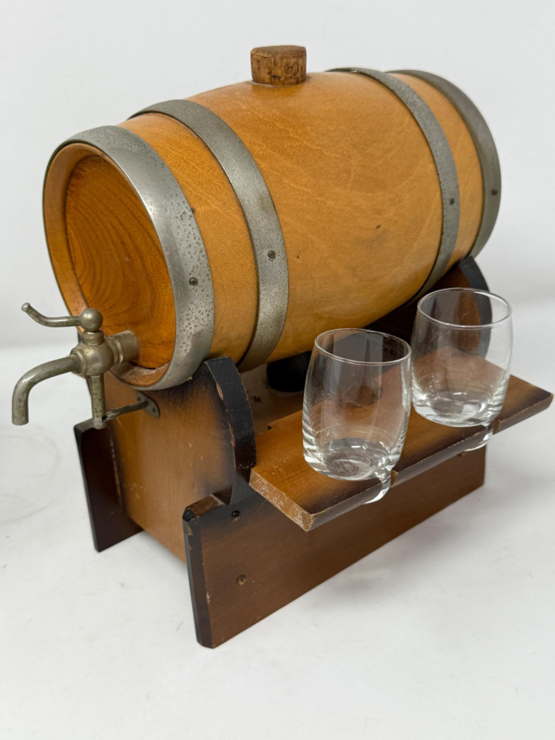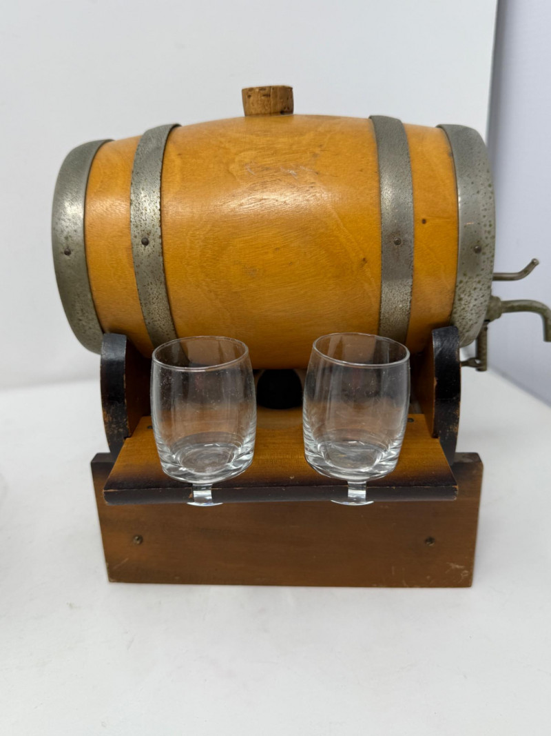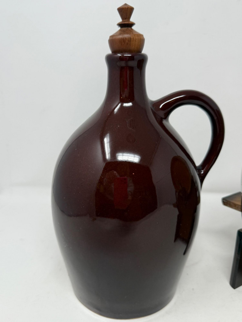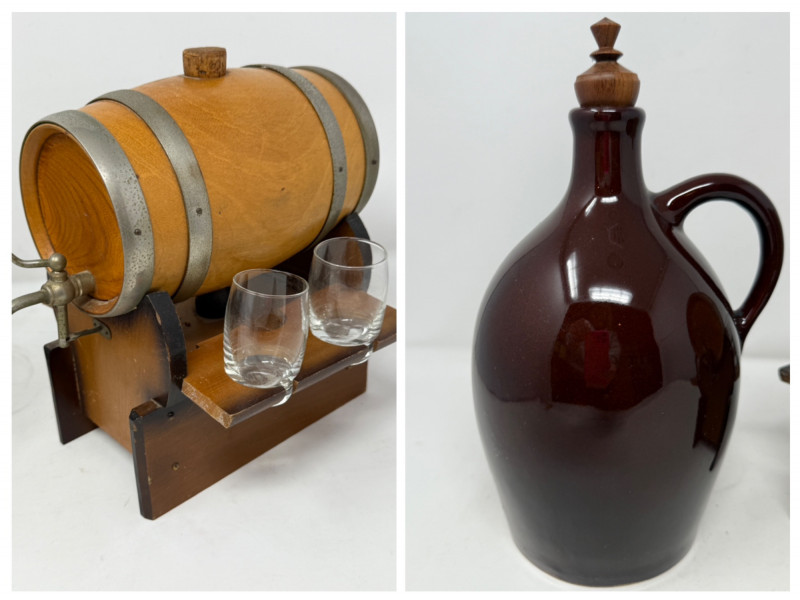 Brown Pottery Jug & Liquor Dispensing Keg Vintage musical liquor dispensing keg with 4 shot glasses. Music box works and plays when the spigot is opened. 8.55x7.5x9” with cork plug. Brown pottery jug musical decanter with wood plug. Music box works. 6.5x11”