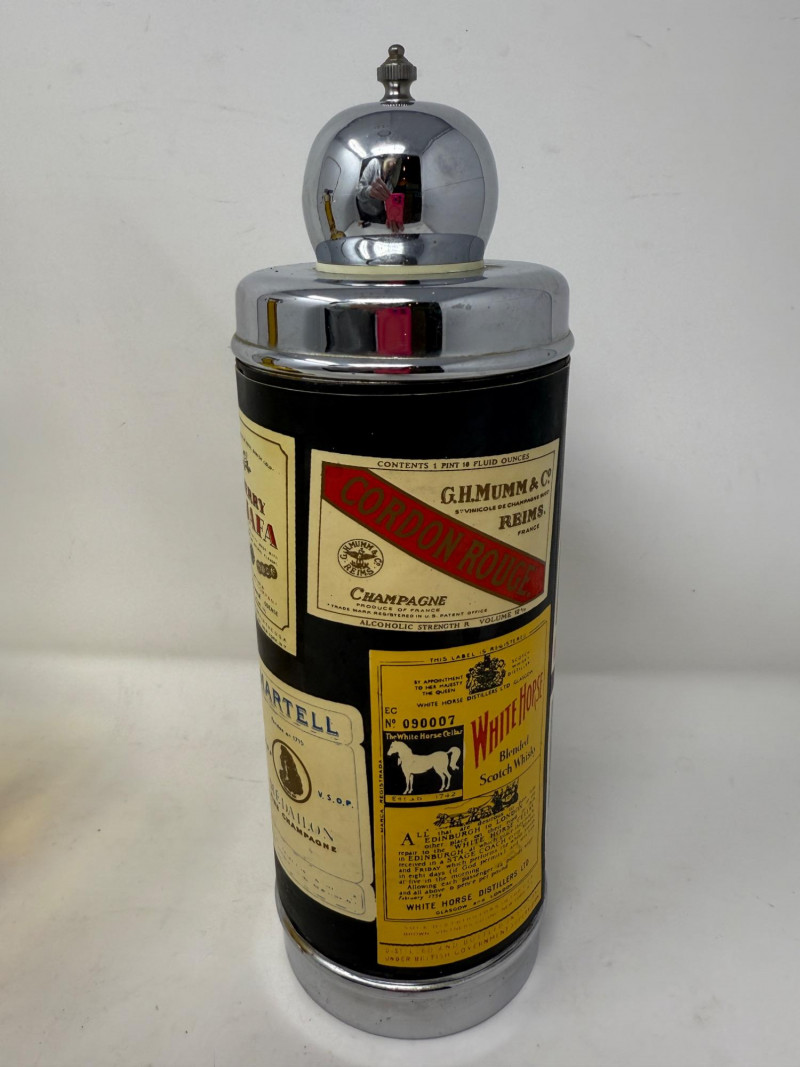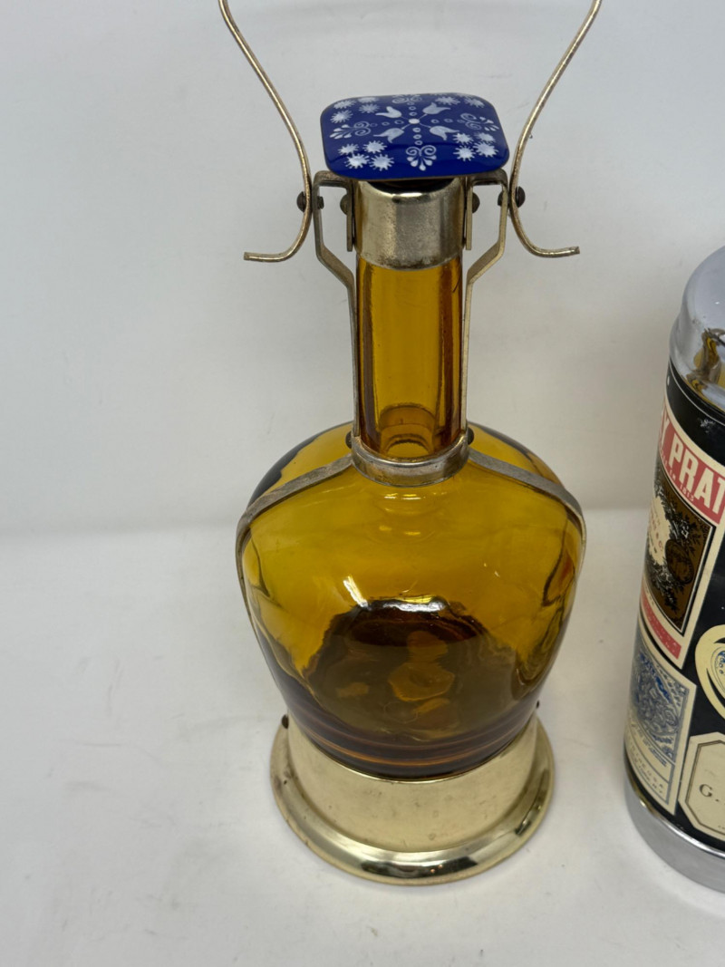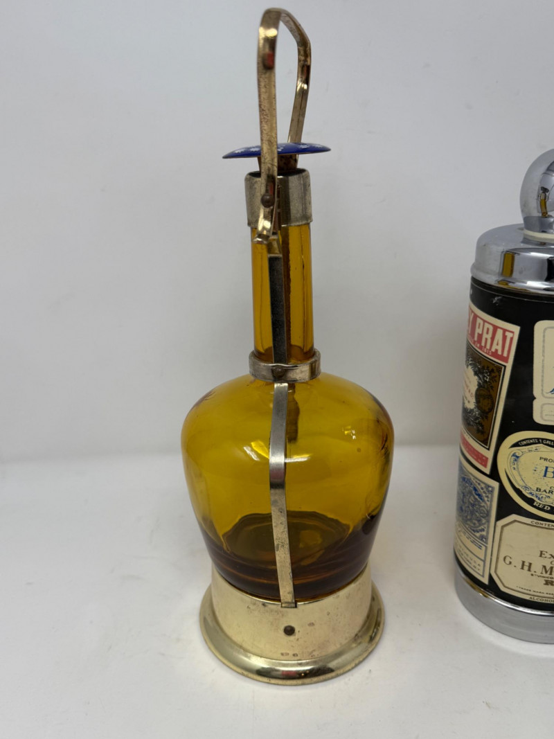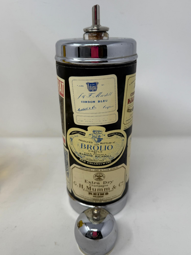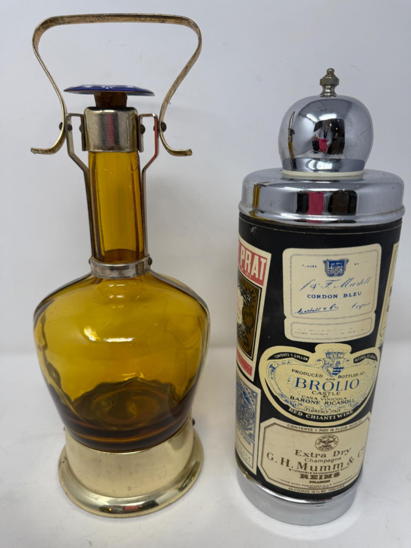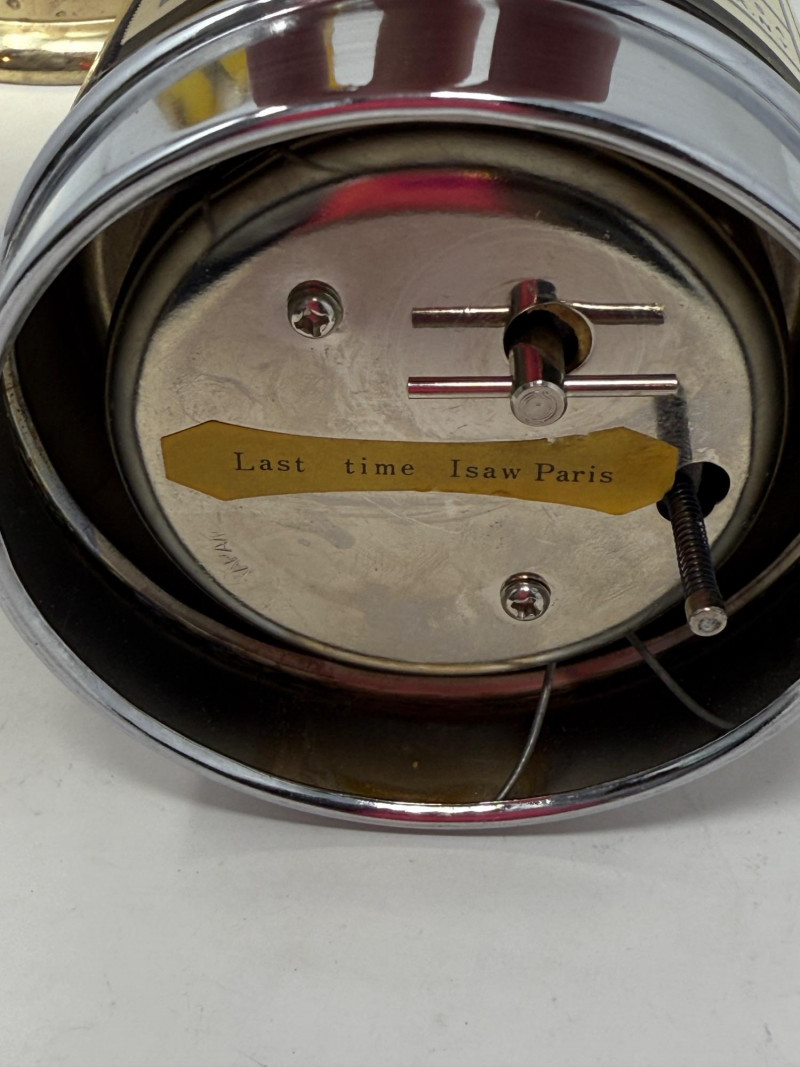 3.5”x11” chrome musical decanter plays “Last Time I Saw Paris” Gold glass and metal musical decanter plays How Dry I Am.