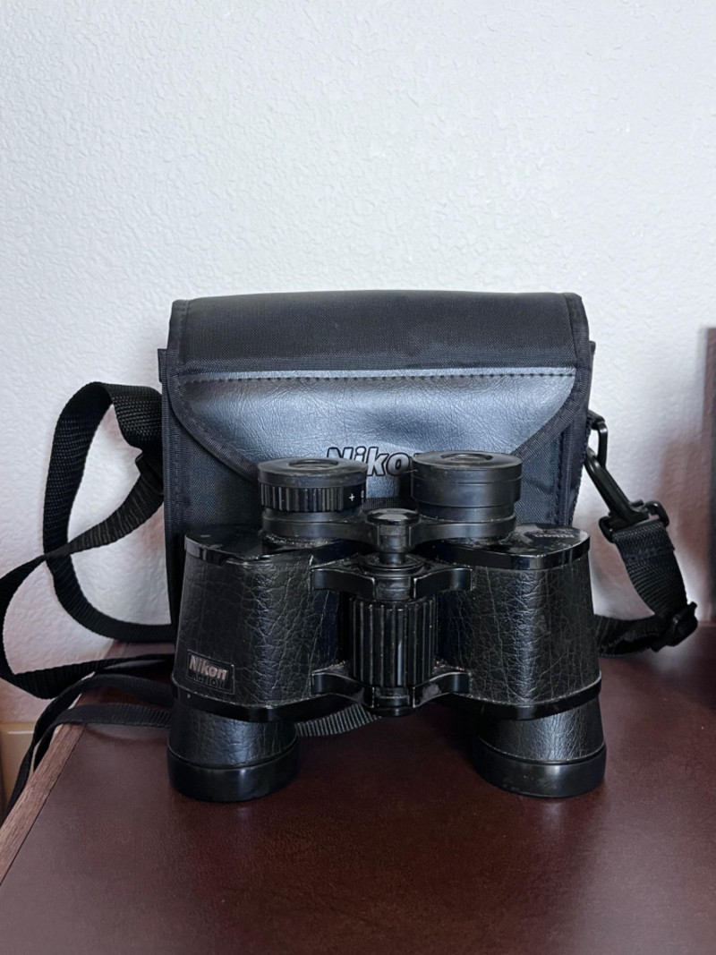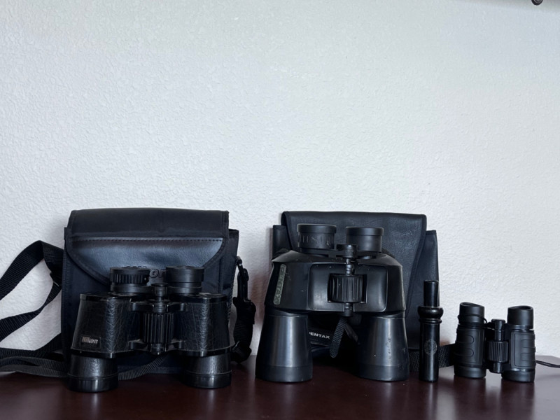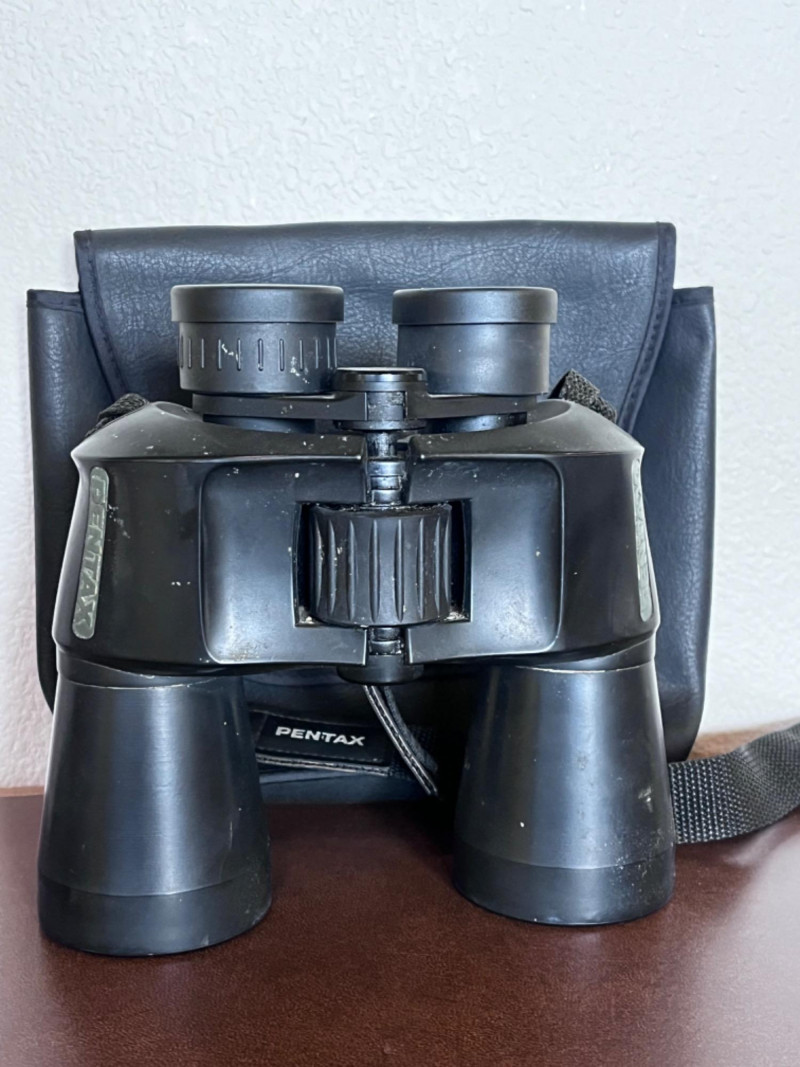 3 Binoculars and a Duck Call Pentax XCF 12x50 5.6° kids binoculars (no identifying markers) P.S. Olt D-2 duck call