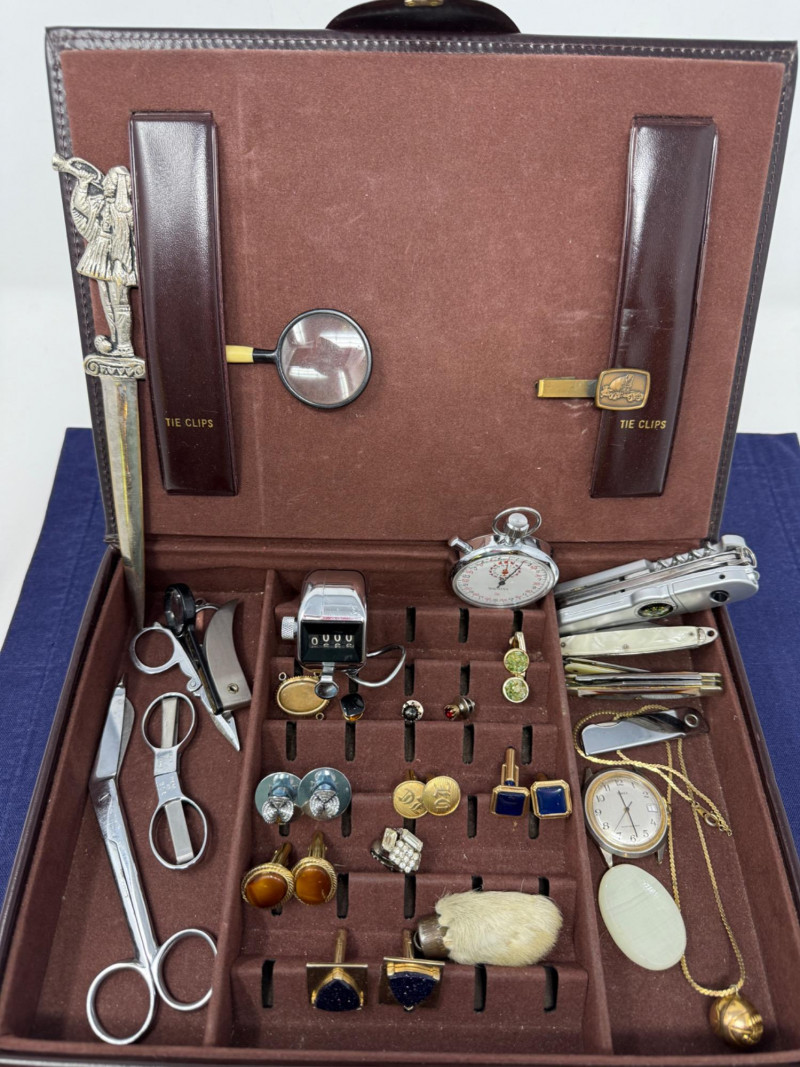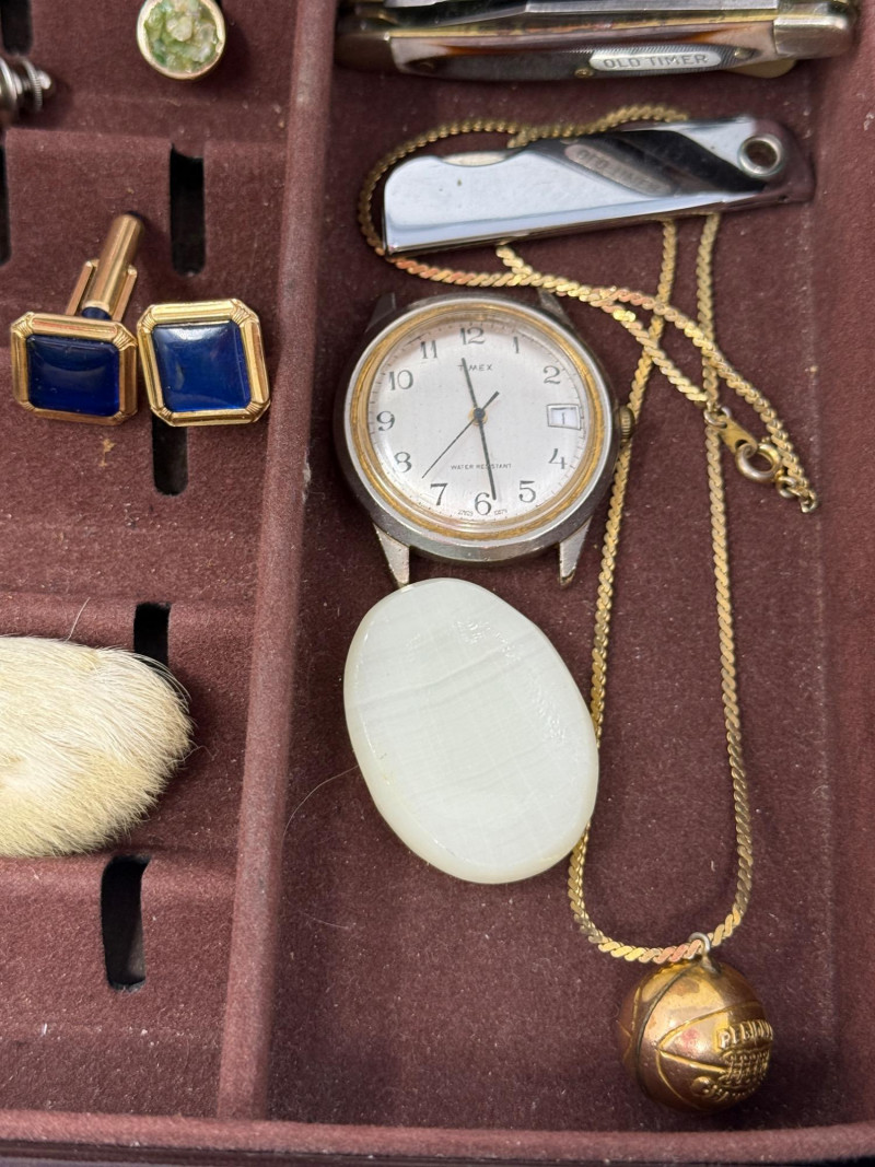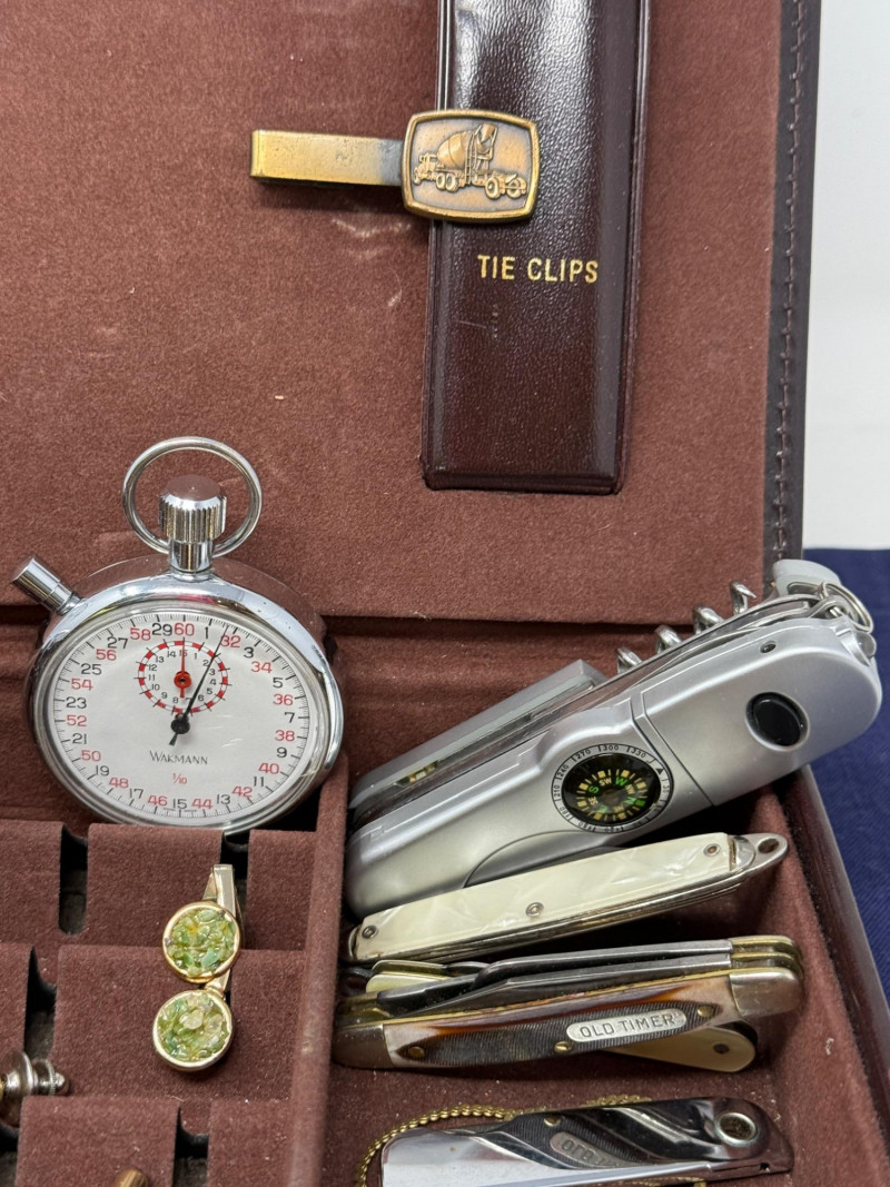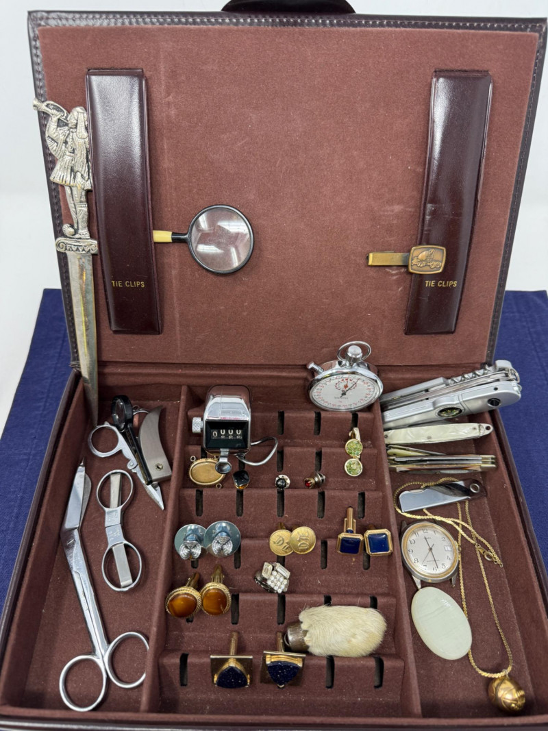 Men’s Jewelry Box & Contents 11x8” Vinyl Box Pocket knives, cuff links, stop watches and more!