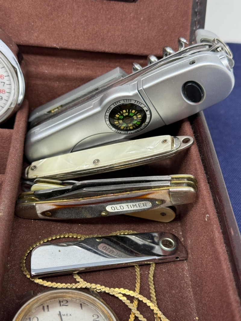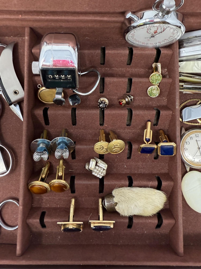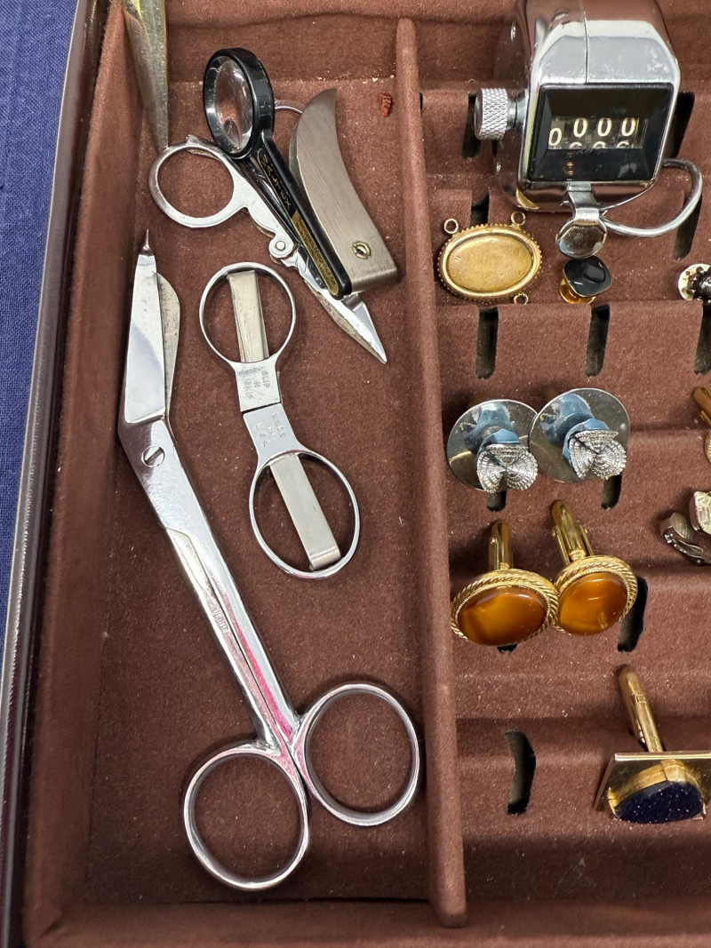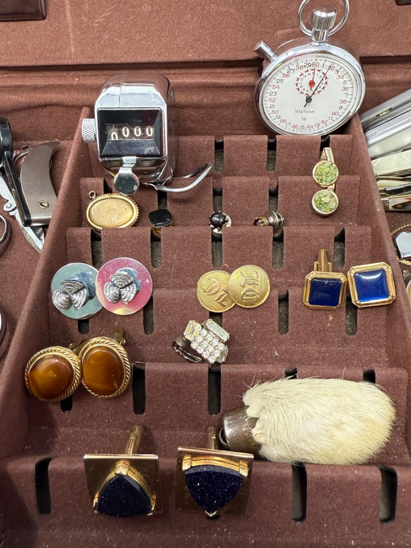 Men’s Jewelry Box & Contents 11x8” Vinyl Box Pocket knives, cuff links, stop watches and more!