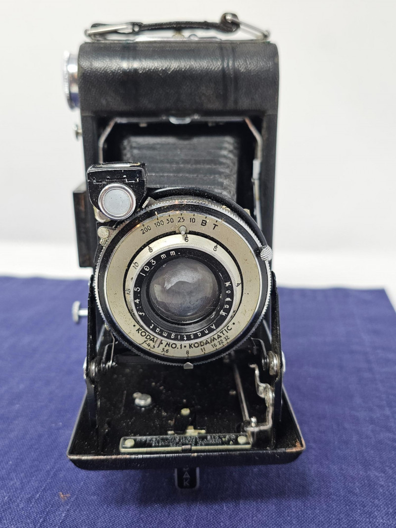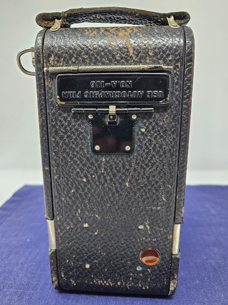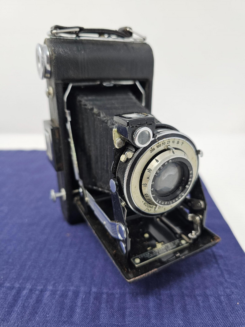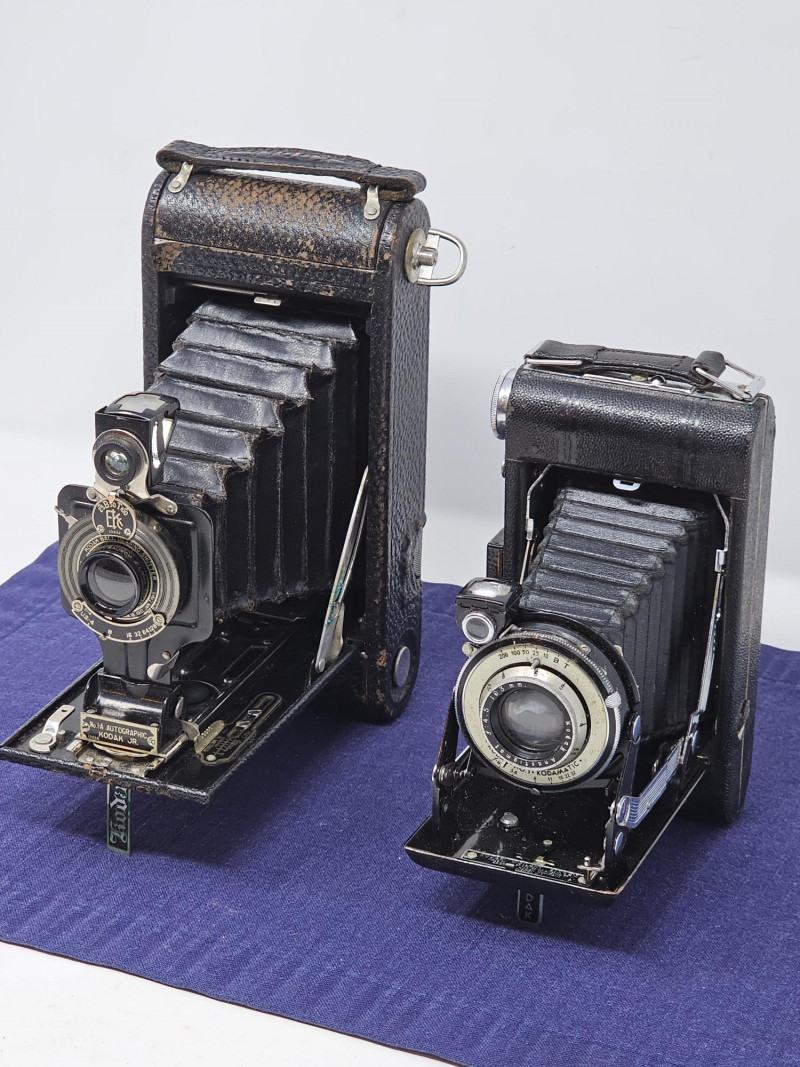 Antique Kodak Folding Cameras 1914-1926 Eastman Kodak No. 1A Autographic Kodak Jr. Follding Camera The No. 1A Autographic Kodak Jr. was a popular model known for its compact size and ease of use. It used 116 film and produced postcard-size negatives. The camera's folding design made it convenient for travel, and its relatively simple controls made it appealing to amateur photographers. These cameras are now sought after by collectors of vintage photographic equipment. 1930-1940 Kodak Vigilant Six-20 folding camera It was a folding camera that used 620 film, a format that Kodak introduced in 1932. The camera was designed to be relatively compact and easy to use, making it popular among amateur photographers of the time. Includes carrying case!