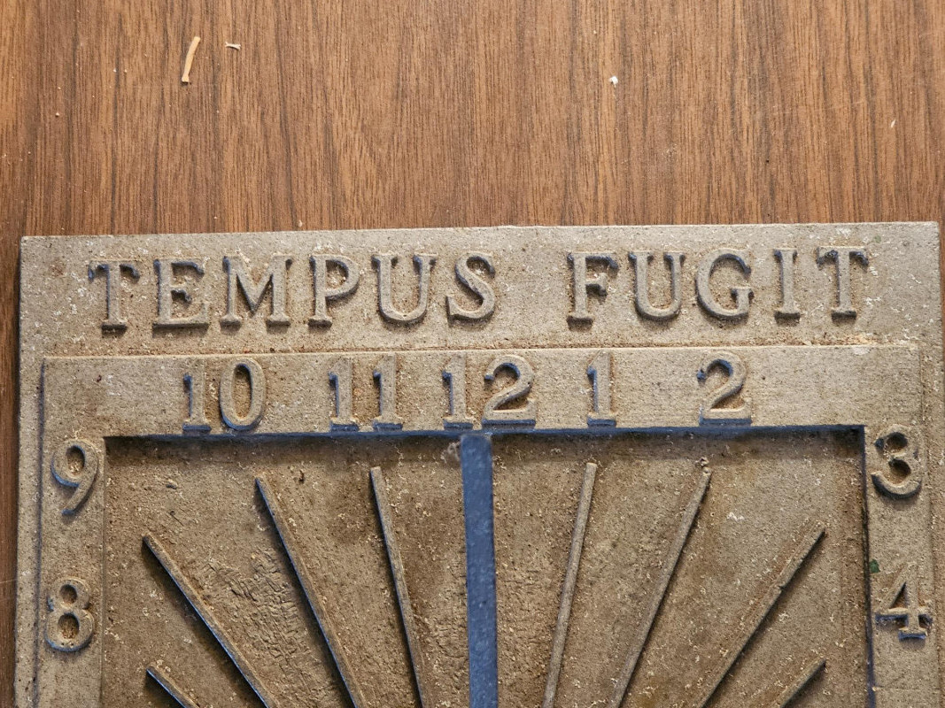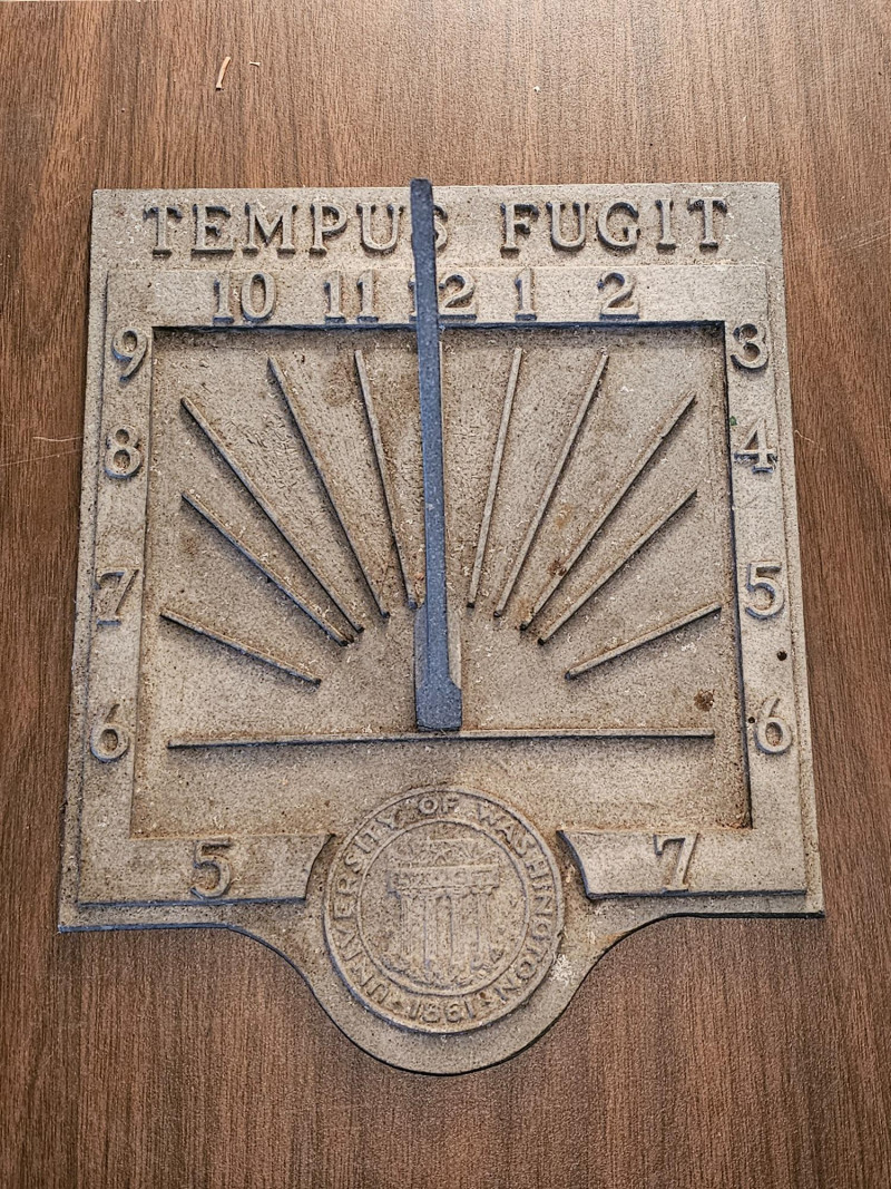 University Of Washington "Tempus Fugit" Sundial The University of Washington was founded in 1861, so the sundial could be a commemorative item related to the university's history. The inscription "Tempus Fugit," Latin for "time flies," is a common motif on sundials, serving as a reminder of the fleeting nature of time. Possibly made by Replogle Globes, known for making educational materials including sundials 13"T x 10"W x 6"D