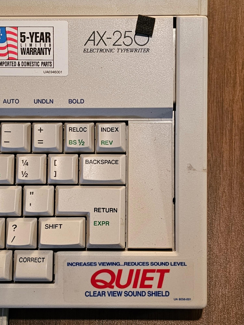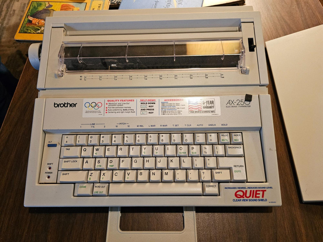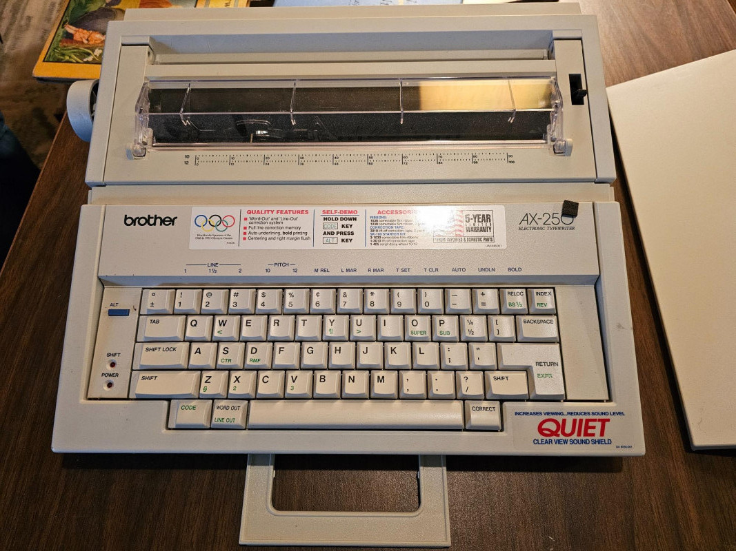 Brother AX-250 Electronic Typewriter The Brother AX-250 is an electric typewriter featuring a print keyboard cover, automatic carrier return, and correction functions for characters, words, and lines. It offers pica (10 cpi) and elite (12 cpi) pitch options and has a manual or automatic carrier return function Tested - Powers On! 5"T x 15"W x 14"D