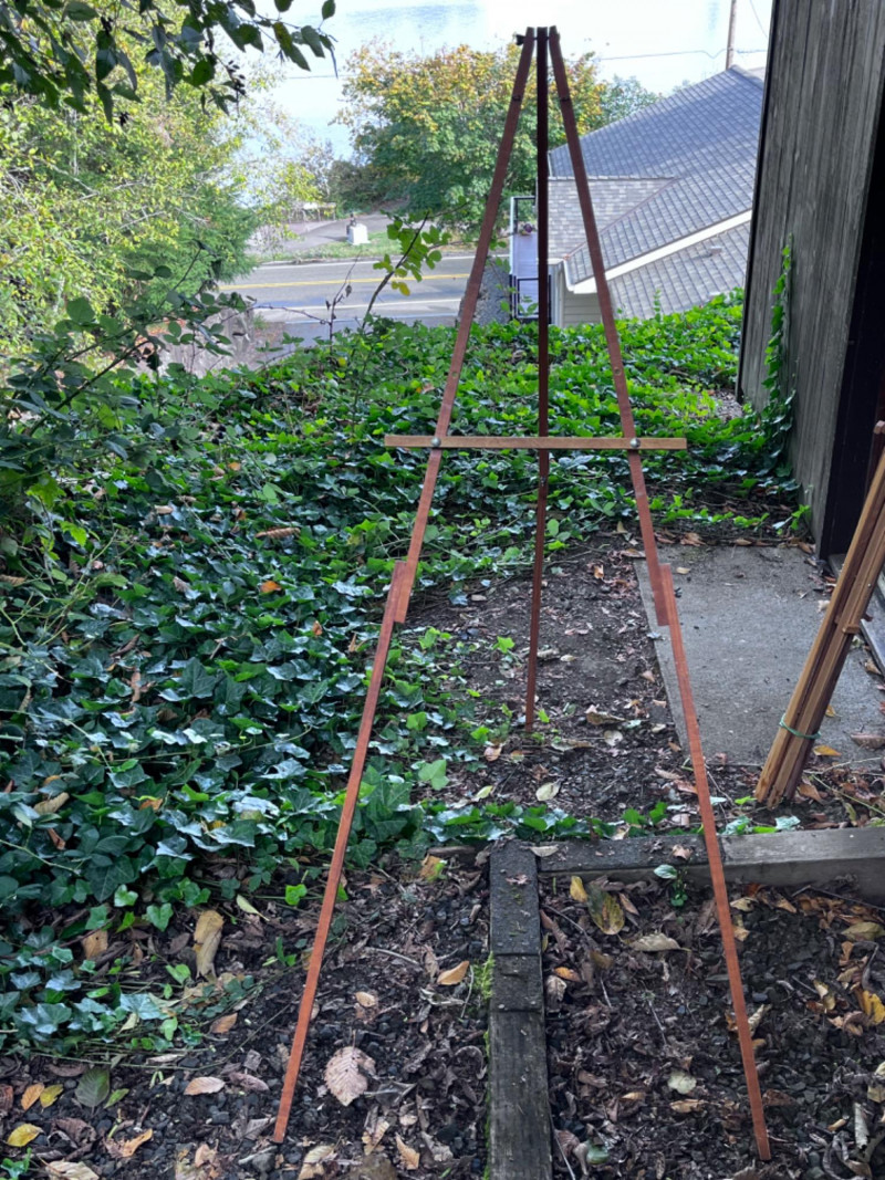 (5) Two Legged Easels and (1) Three Legged Easel Two legged easels are 81” Tall 24” art platform Three legged easels are 68” tall 18” art platform.