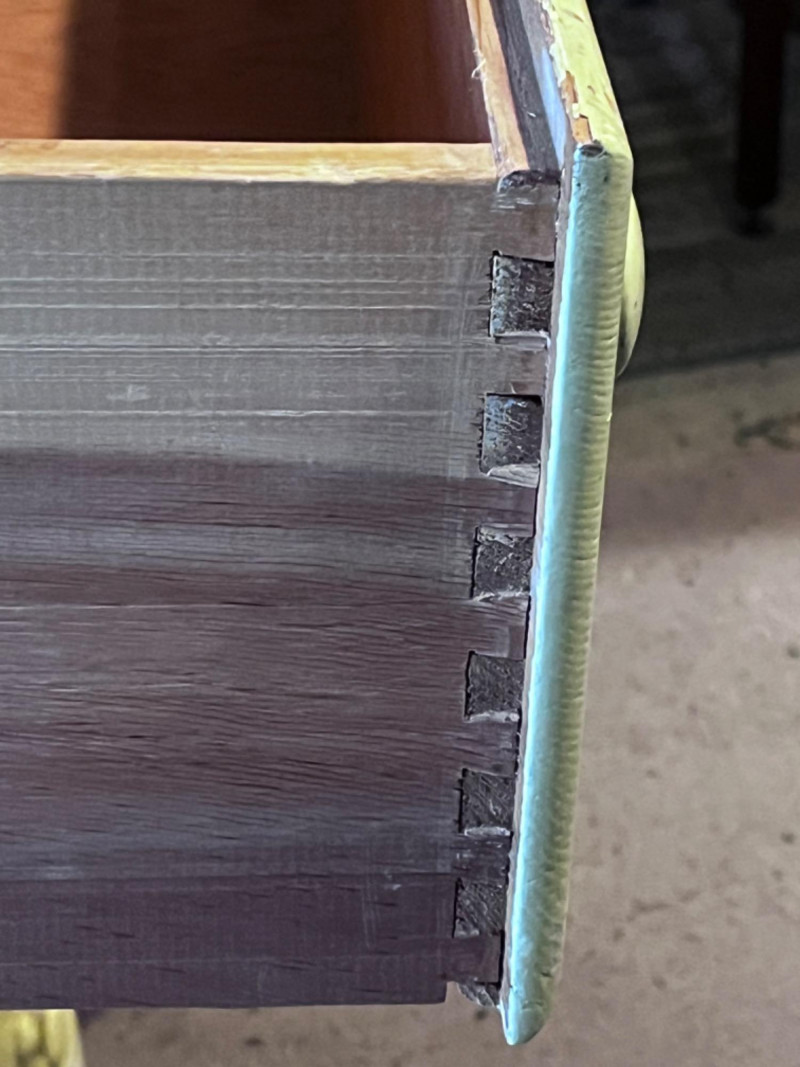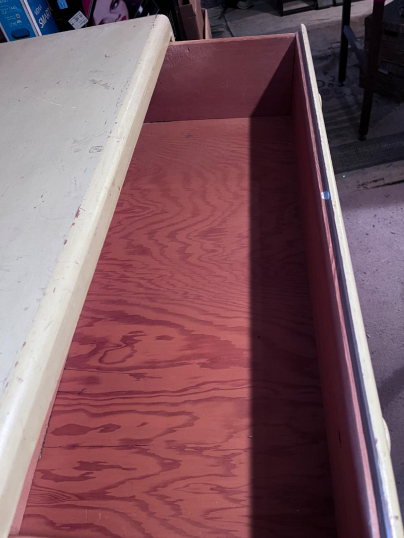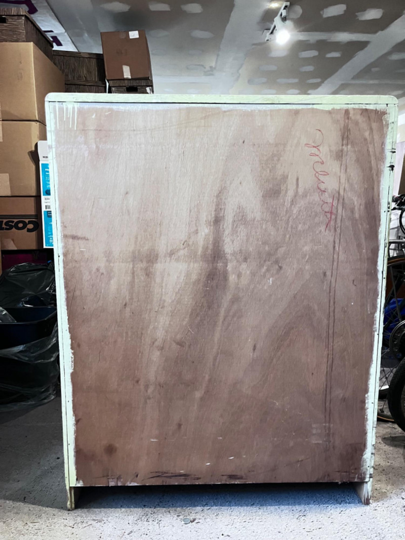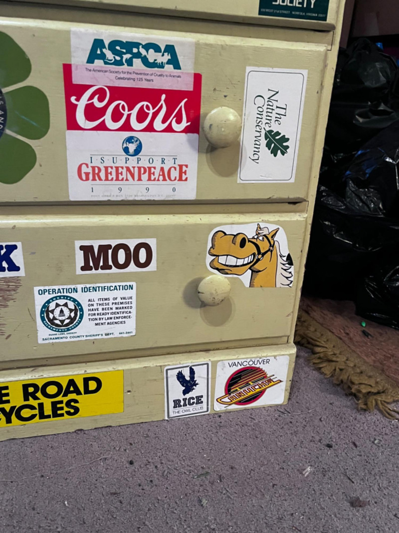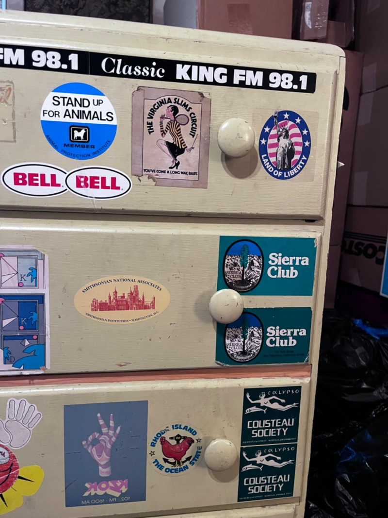 5 Drawer Wood Dresser Covered in Vintage Stickers 5 drawers with dovetail joints Vintage stickers 44”Lx34”Wx15”D