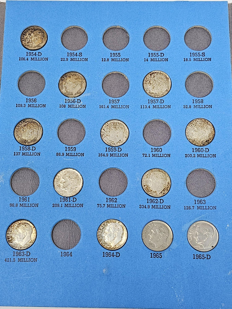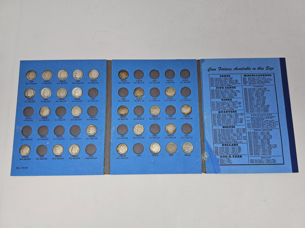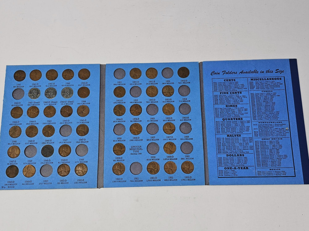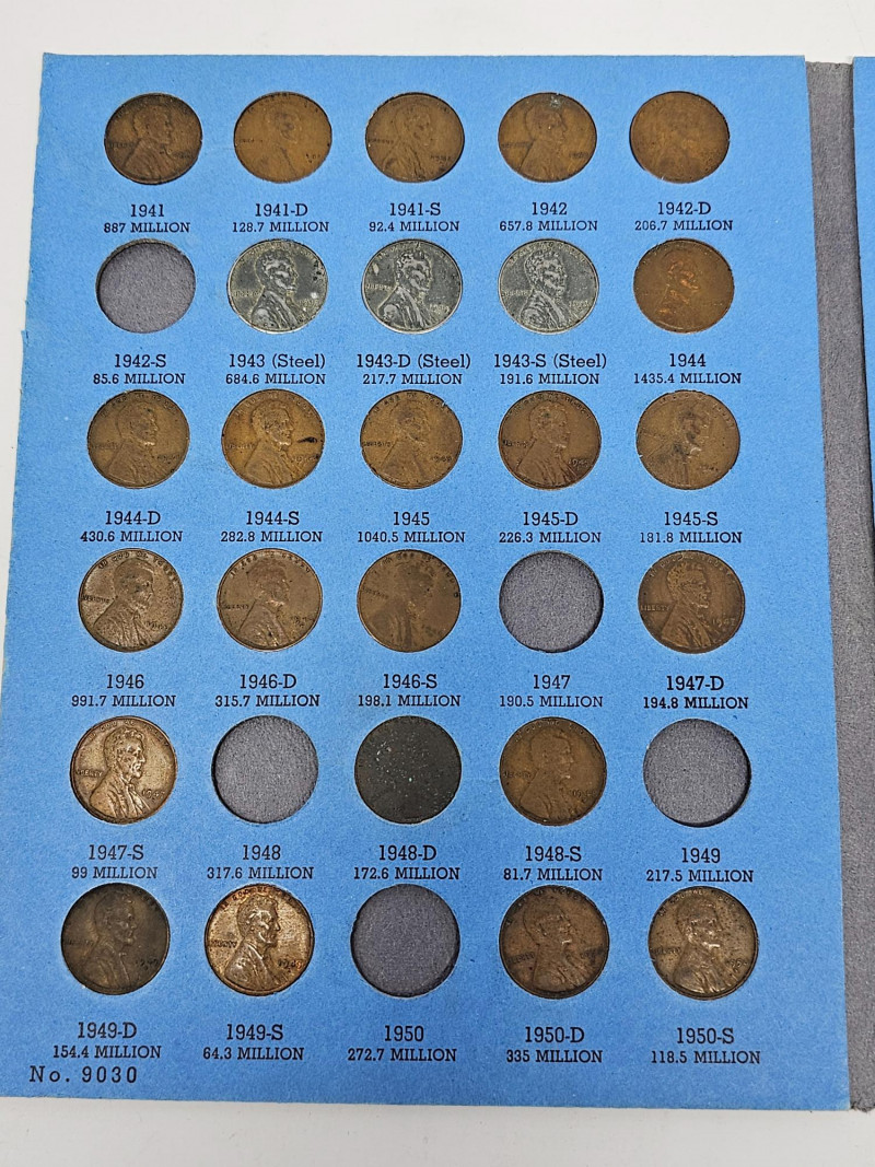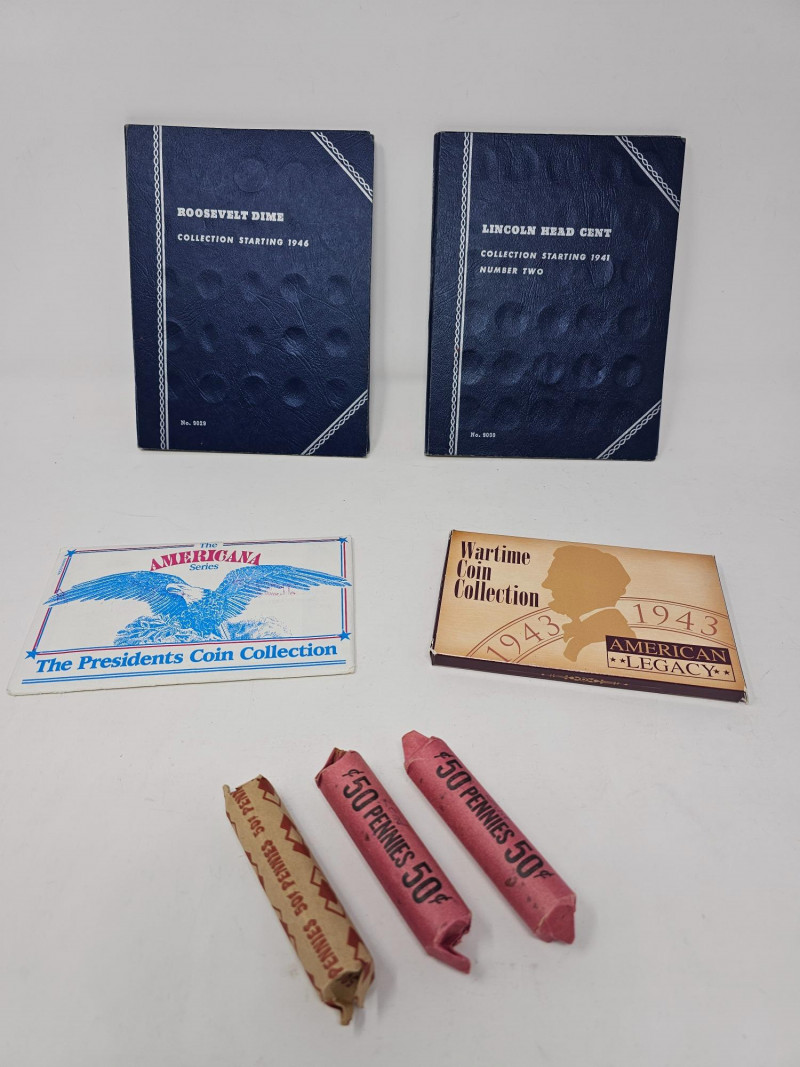 (4) Coin Collections & (3) Rolls Of Steel Pennies Roosevelt Dime Collection 1946-1965 (incomplete 27/50) Lincoln Head Cent Collection Number Two ( incomplete 43/60) The Americana Series - The President's Coin Collection Waryime Coin Collection - 1943 American Legacy (3) Rolls Of Steel Pennies (1943) The pennies were marked steel pennies, I opened one roll to verify, then rerolled it.