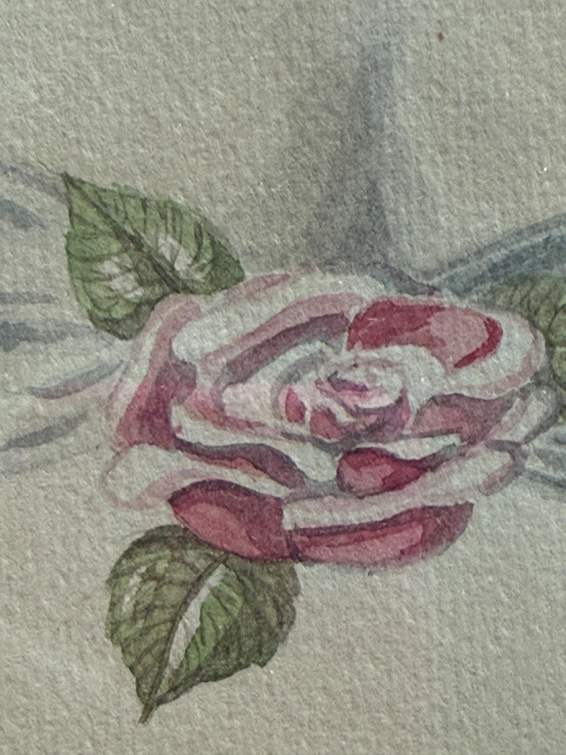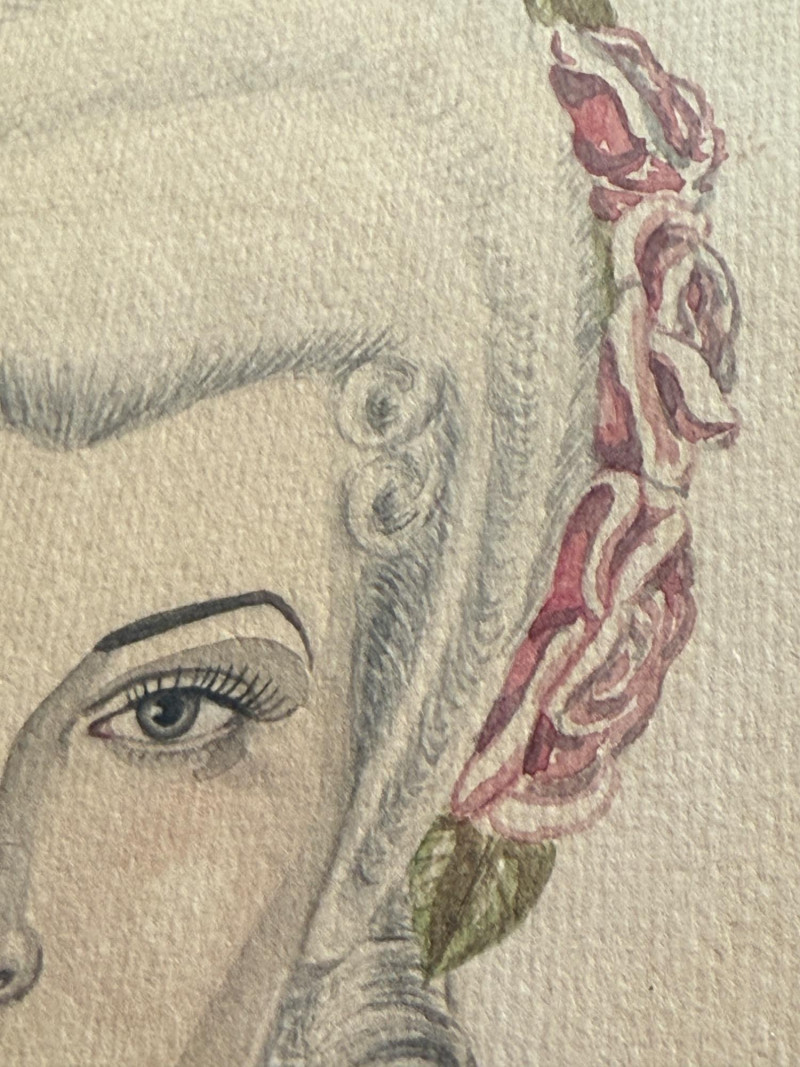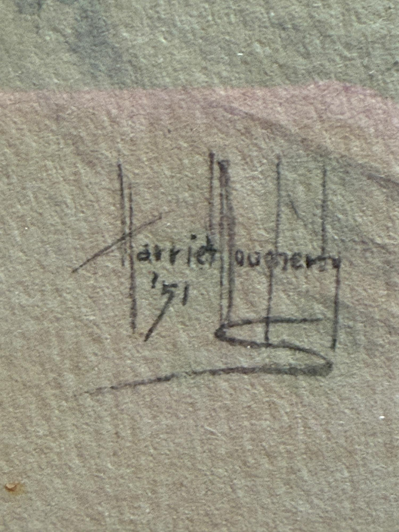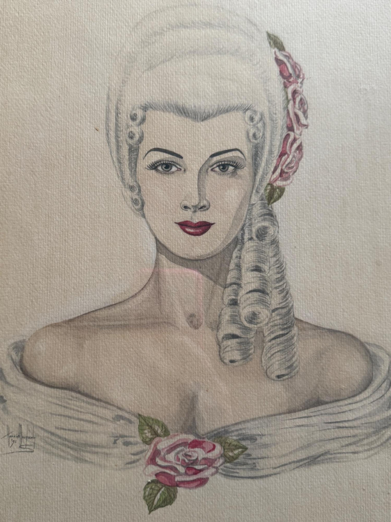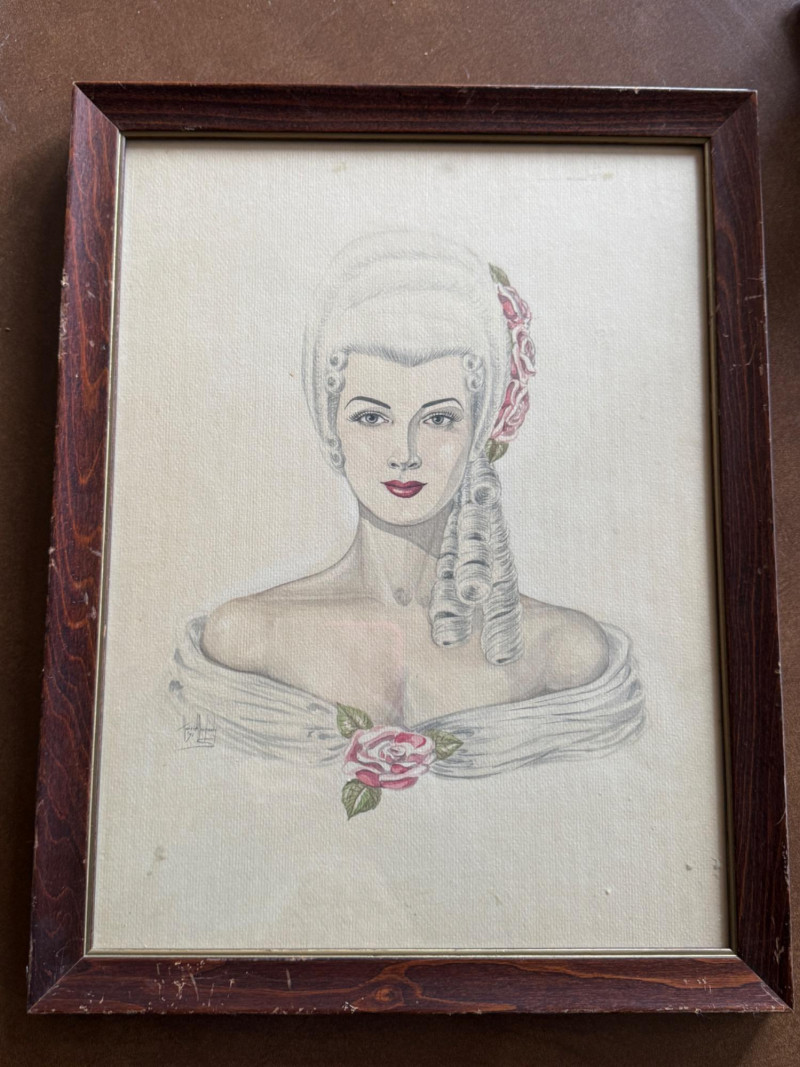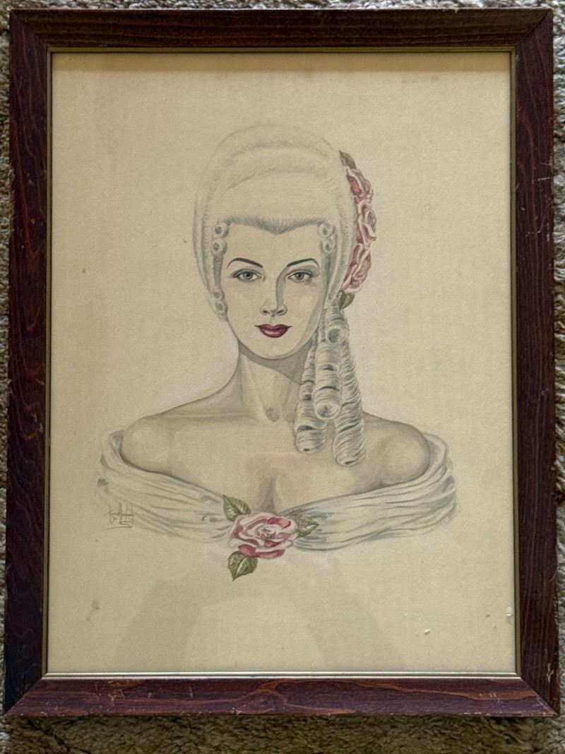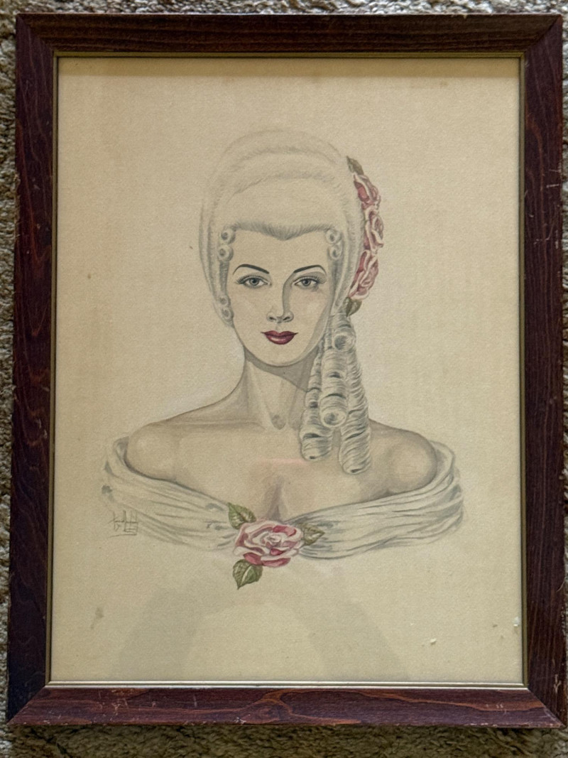 Stunning Victorian Woman Pencil Drawing signed by Harriet Dougherty 1951 Key areas highlighted with watercolor.