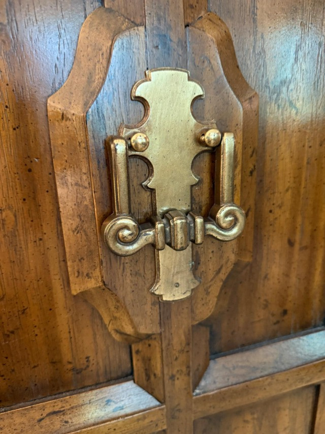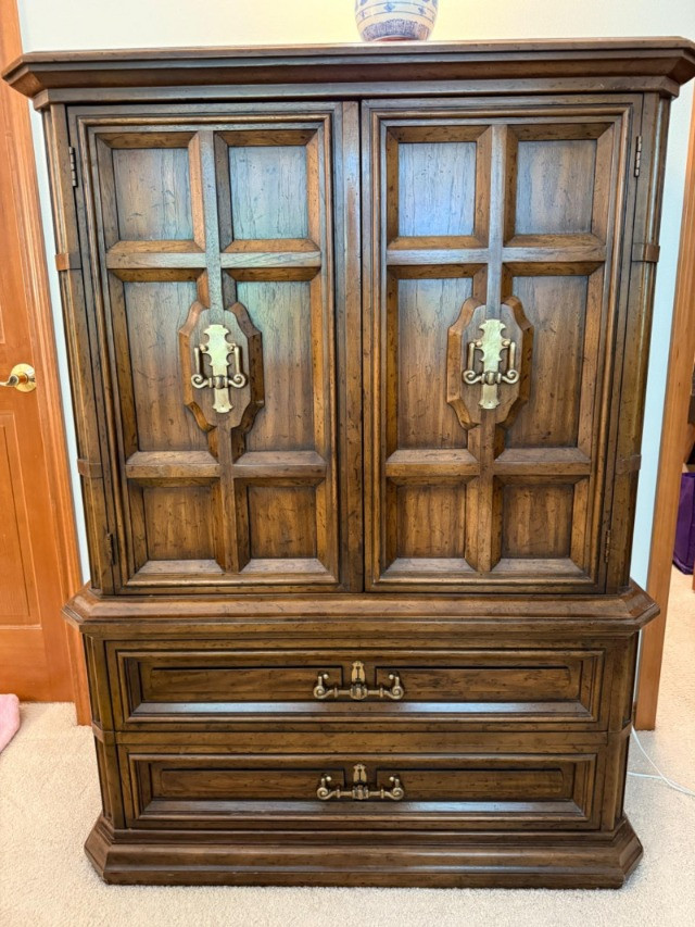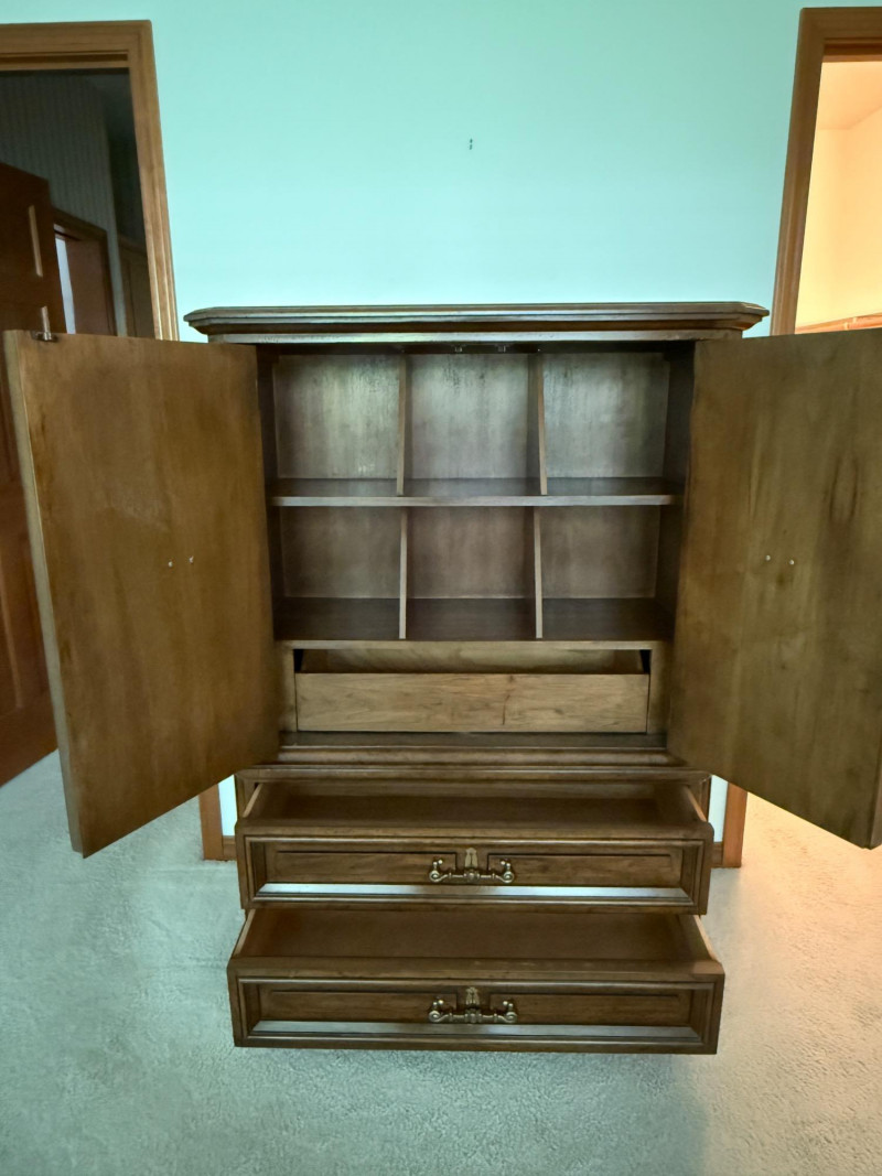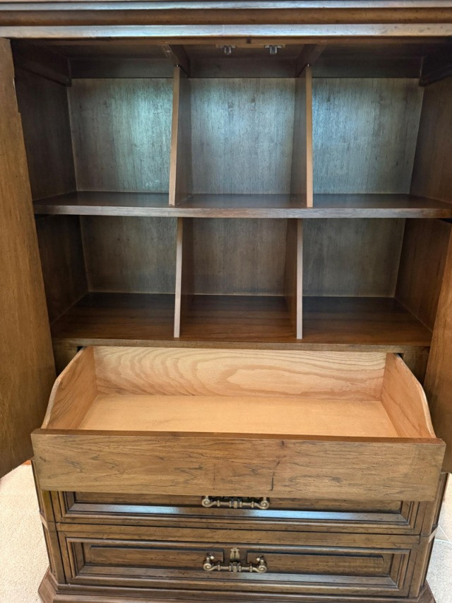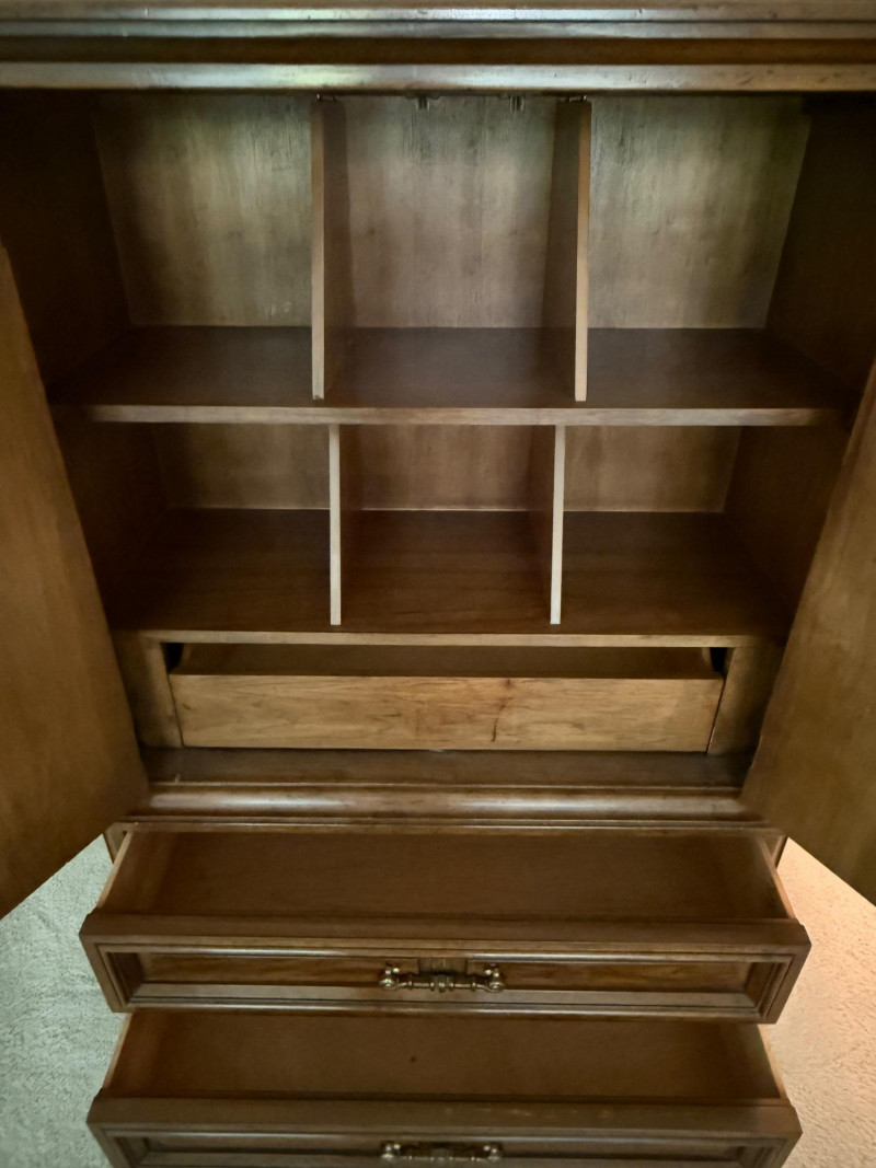 Drexel Heritage Armoire Open double doors to expose 2 sectioned shelves and a drawer. 2 Drawers below. 43x19x58”