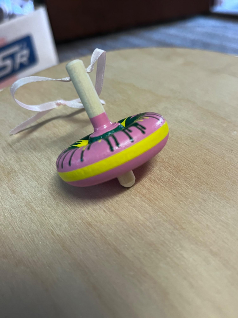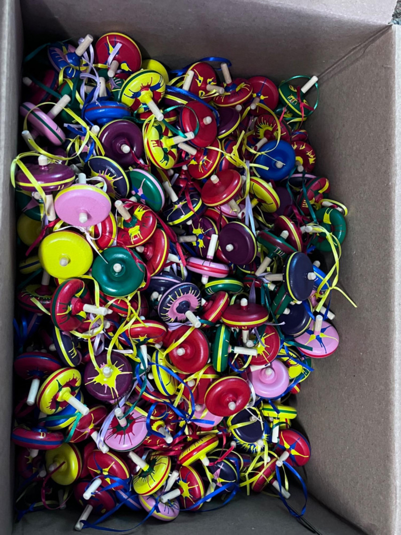 Large Box of Finished Wood Spinning Top Ornaments Variety of colored spinning top ornaments Box is 8.5”Lx18”W Tops fill box about 3/4 full