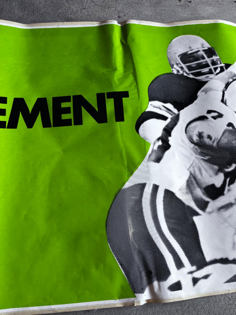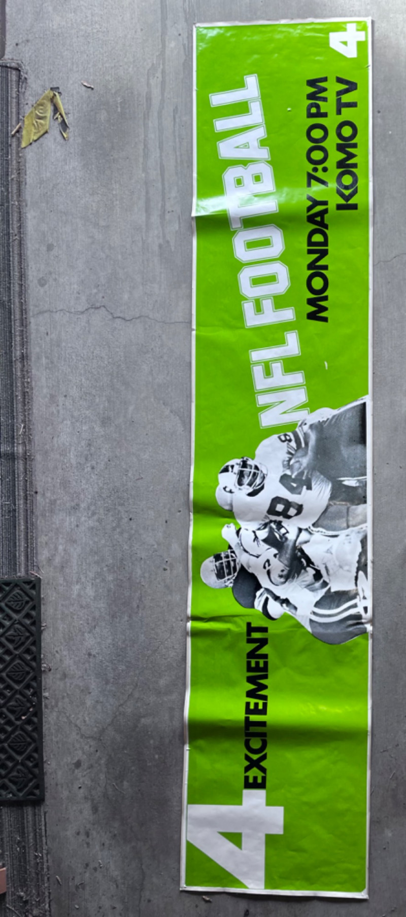 Vintage Adhesive NFL Football Banner KOMO4 NFL Football Previously tacked to wall. Holes from tacks. Pulled from backing in one spot.